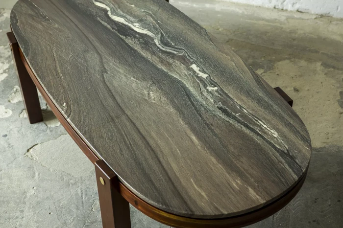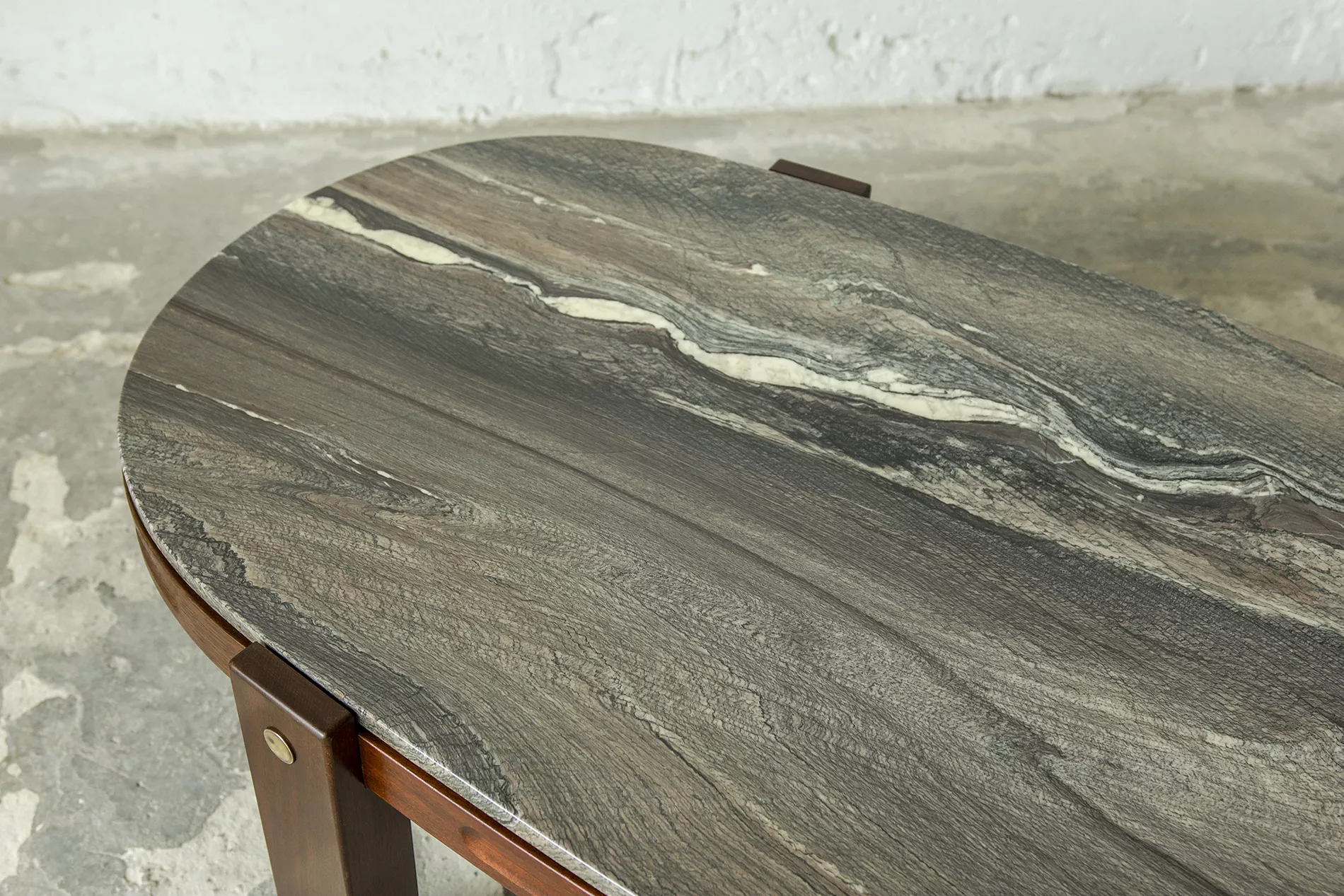 Marmurowy stolik kawowy z lat 70. Blat wykonany został z wysokiej jakości naturalnego marmuru, podstawa to masywne lite drewno tekowe. Jest to klasyczny projekt o minimalistycznej formie, co sprawia że całość prezentuje się bardzo elegancko. Stolik zachowany jest w oryginalnym i bardzo dobrym stanie.