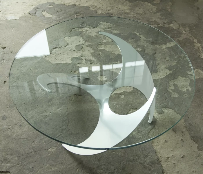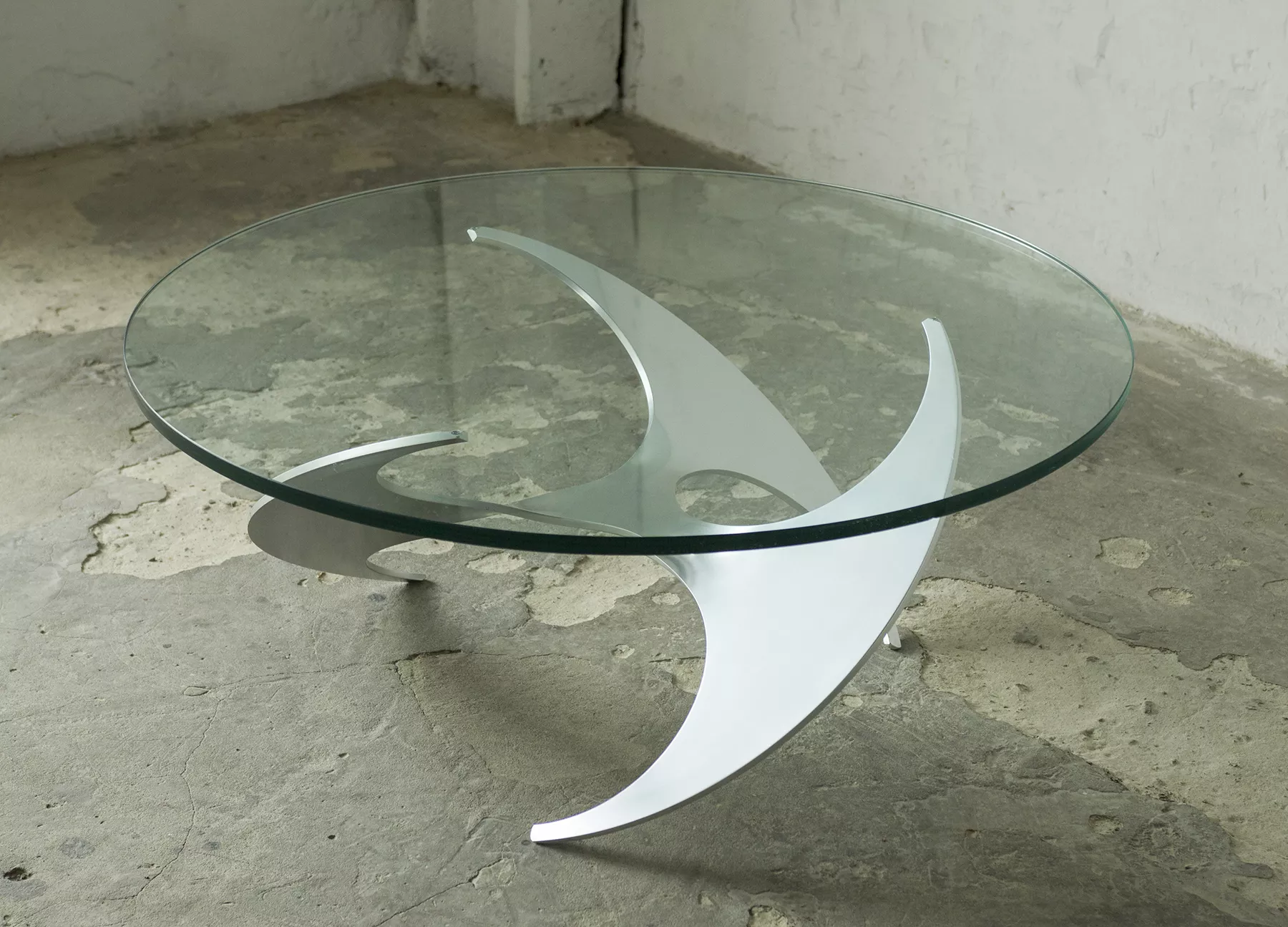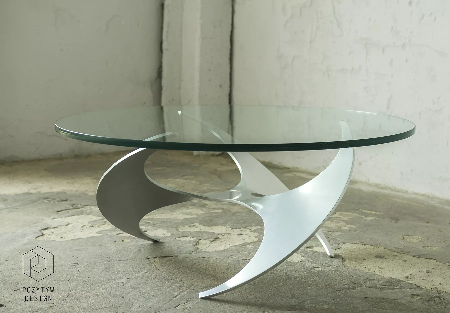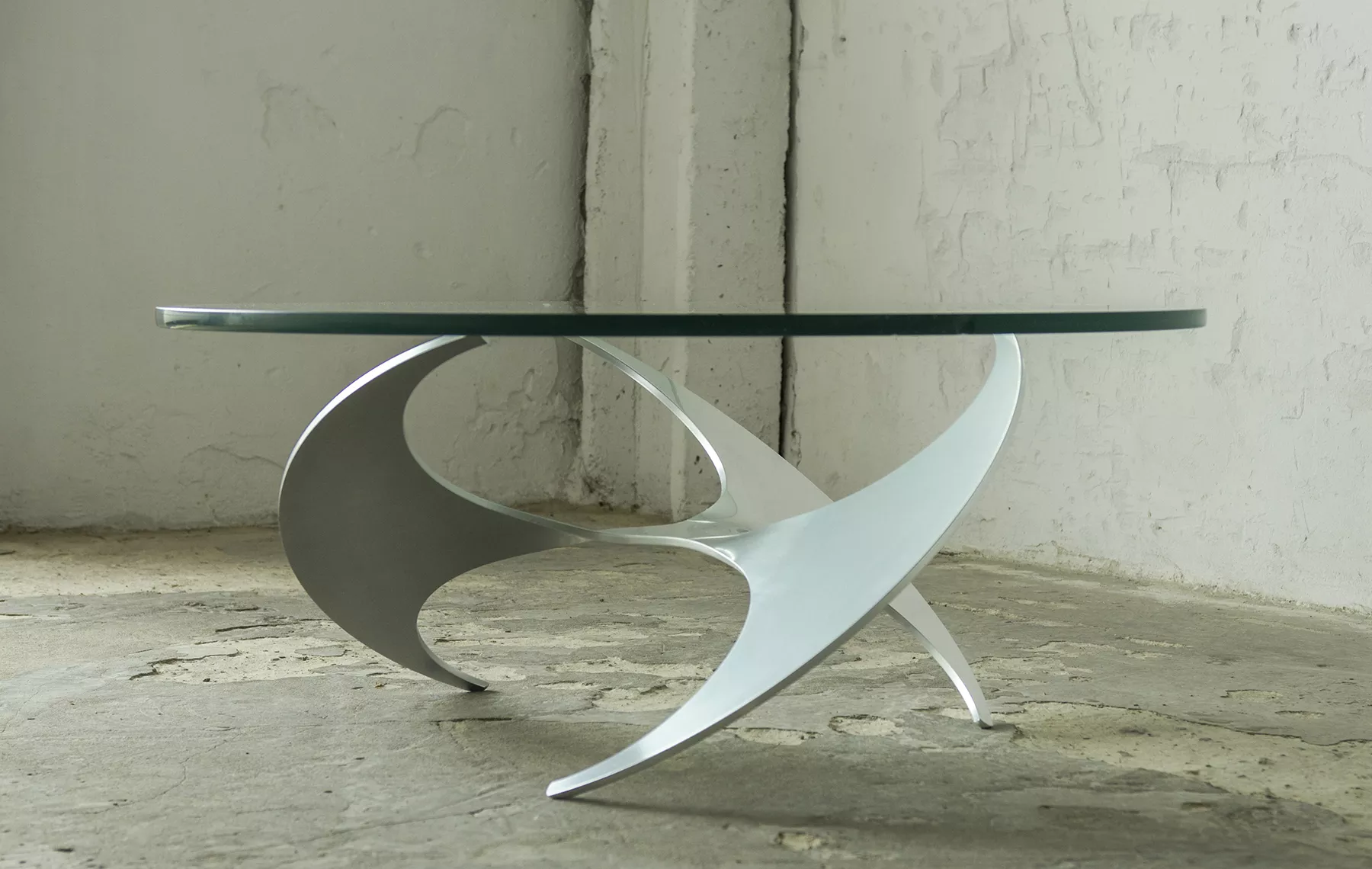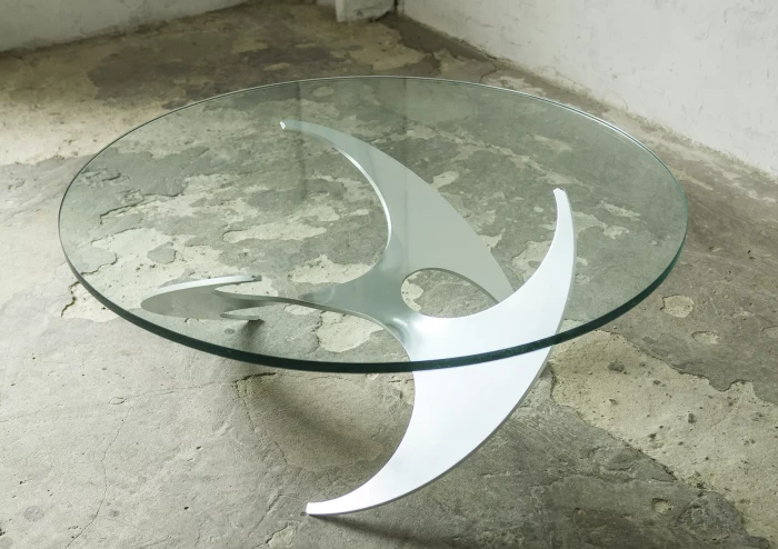 Designerski stolik kawowy PROPELLER jest to projekt z lat 60 autorstwa Knuta Hesterberga dla marki Ronald Schmitt. Podstawa wykonana jest z masywnego aluminium w kształcie śmigła, blat z hartowanego i ciężkiego szkła o grubości 2 cm. Stolik zachowany jest w oryginalnym i bardzo dobrym stanie jak na swoje lata użytkowania. Szyba posiada drobne zarysowania i obtłuczenia, na podstawie też można zauważyć kilka otarć i zadrapań.