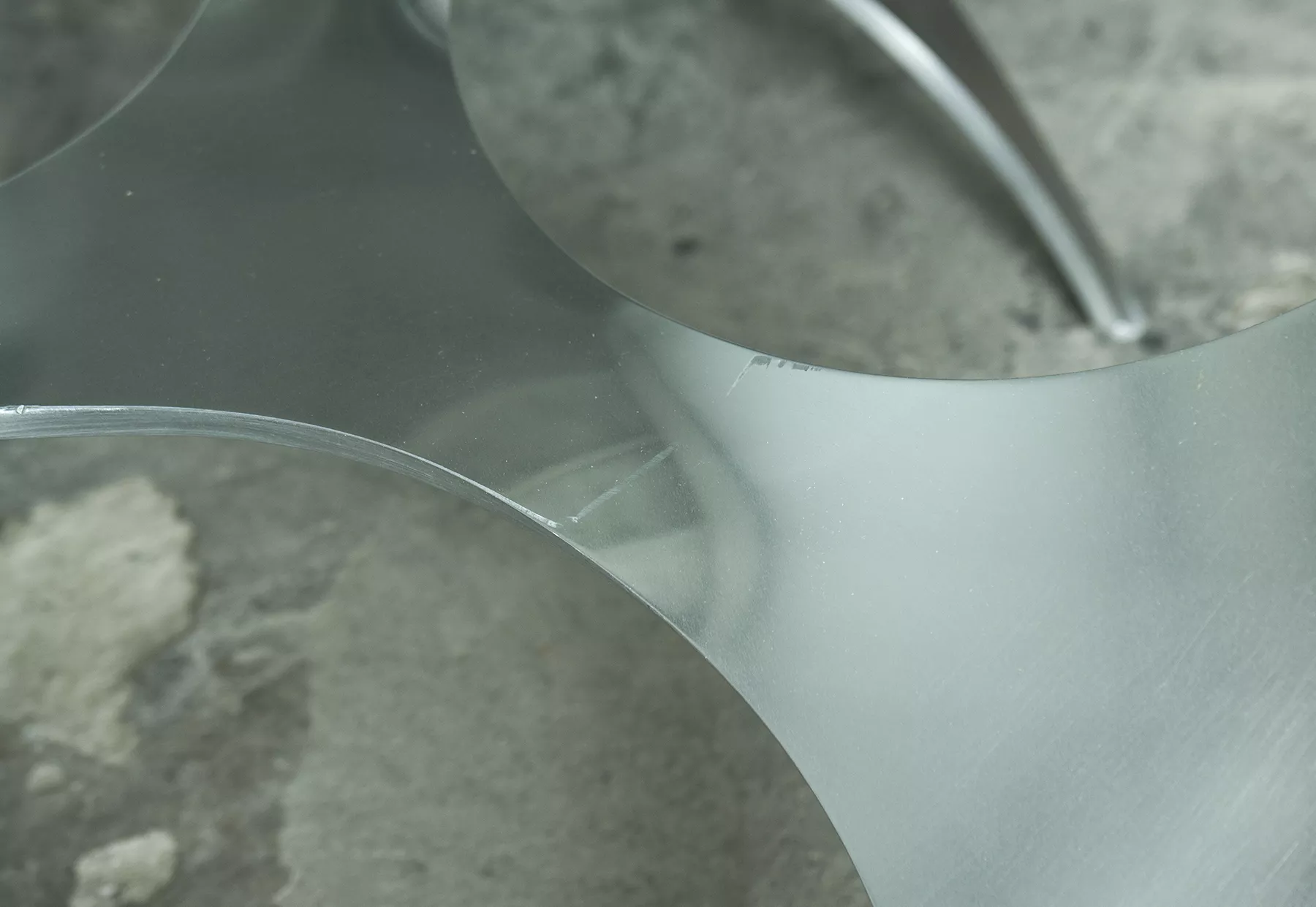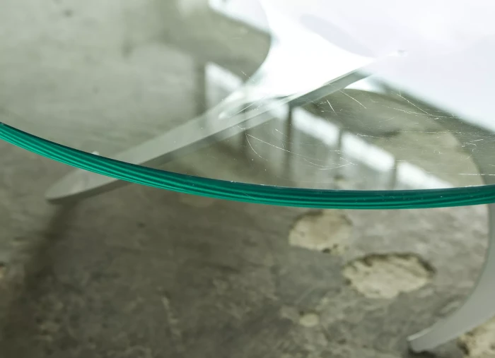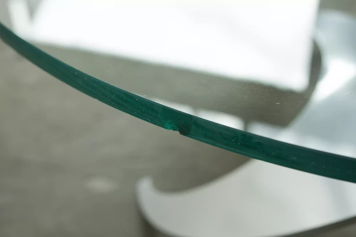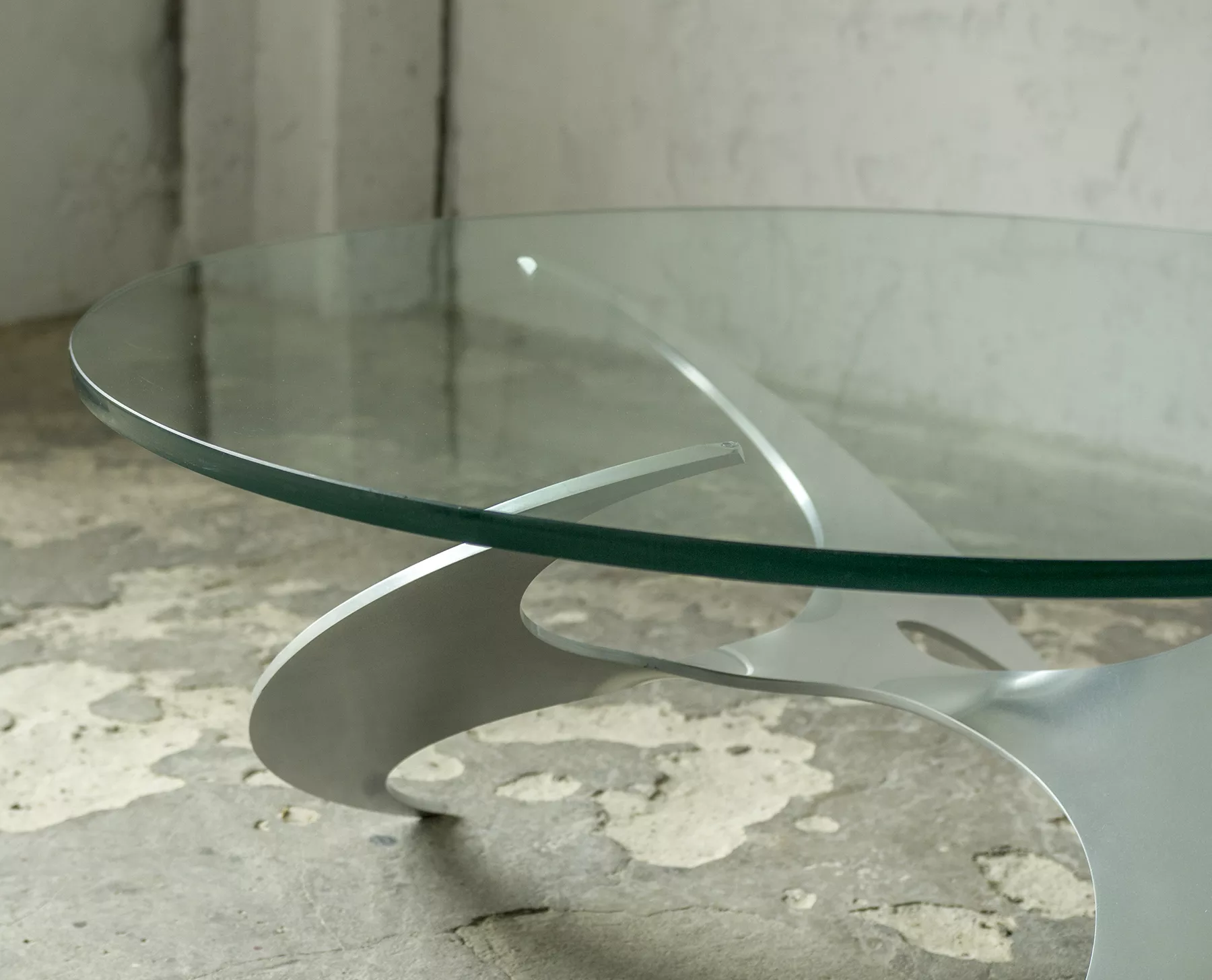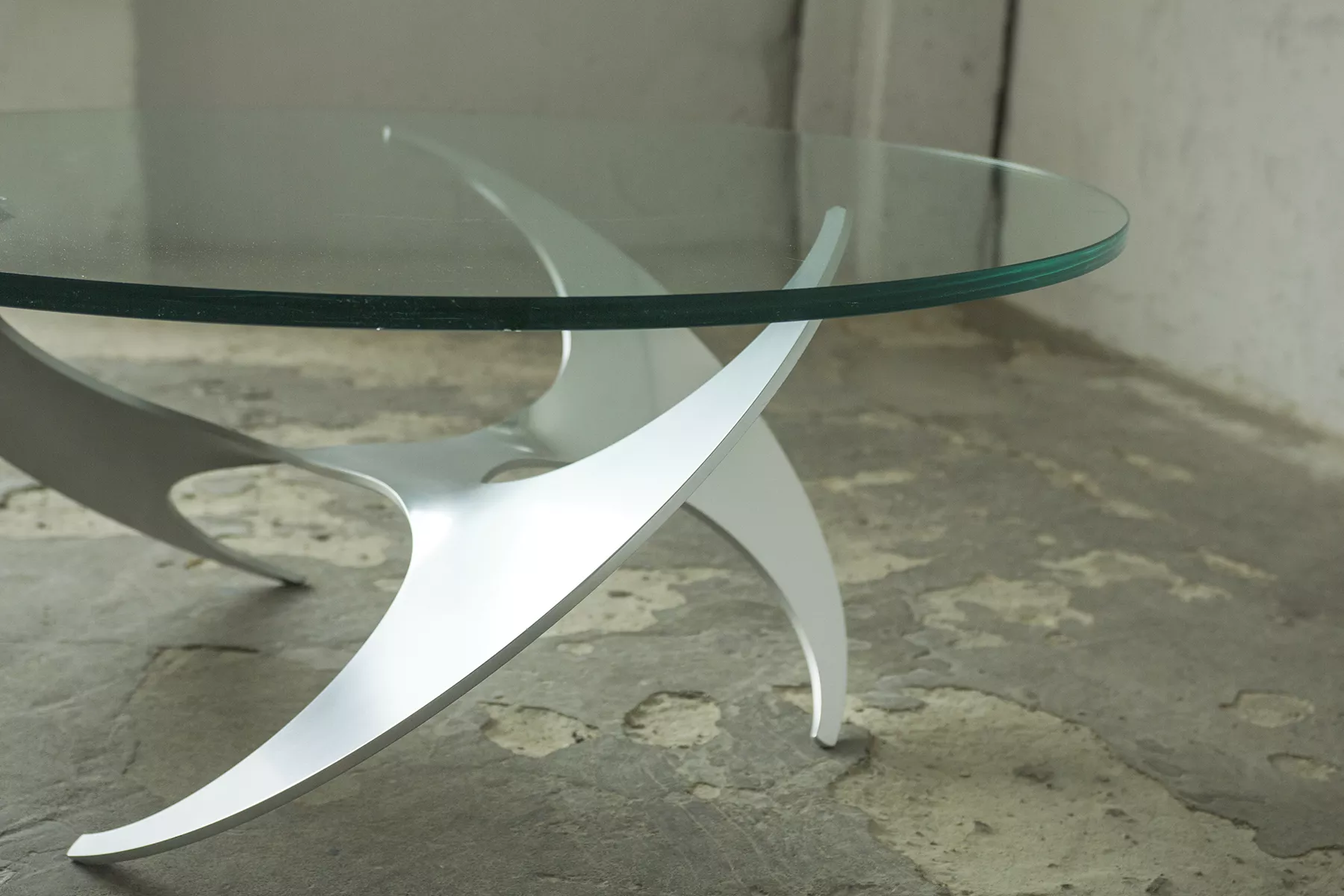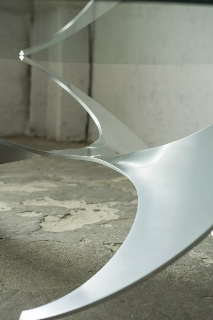 Designerski stolik kawowy PROPELLER jest to projekt z lat 60 autorstwa Knuta Hesterberga dla marki Ronald Schmitt. Podstawa wykonana jest z masywnego aluminium w kształcie śmigła, blat z hartowanego i ciężkiego szkła o grubości 2 cm. Stolik zachowany jest w oryginalnym i bardzo dobrym stanie jak na swoje lata użytkowania. Szyba posiada drobne zarysowania i obtłuczenia, na podstawie też można zauważyć kilka otarć i zadrapań.