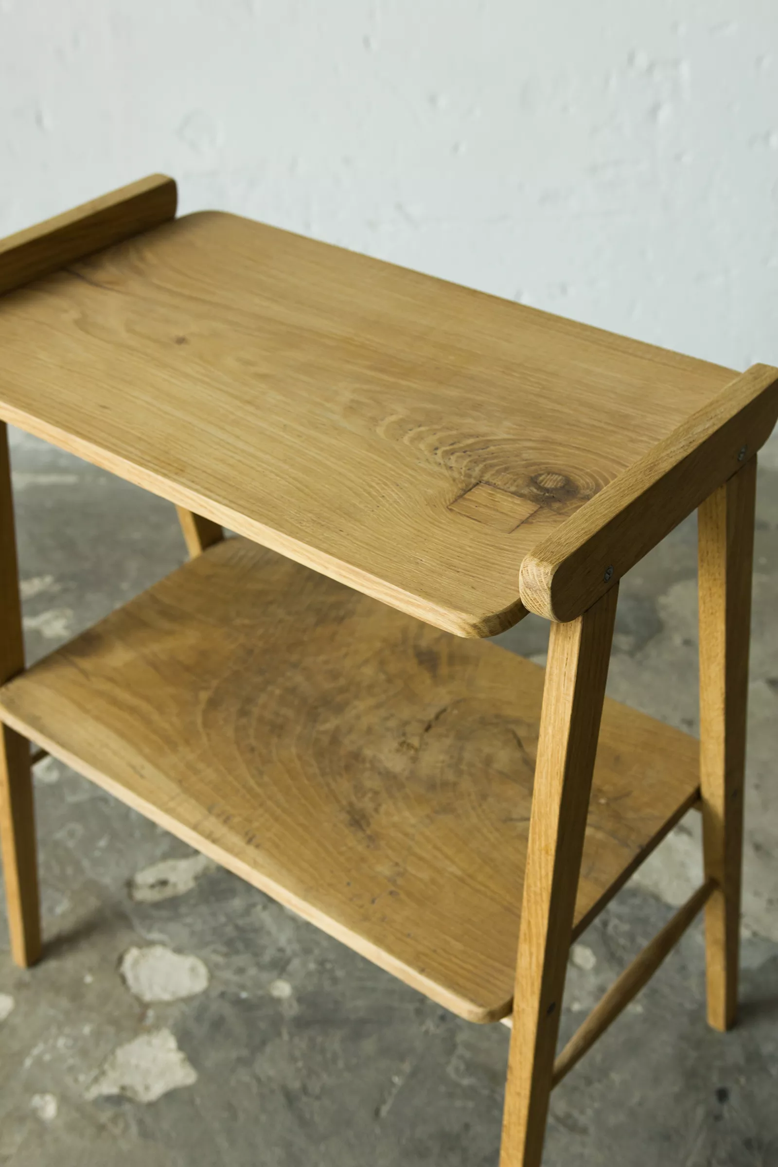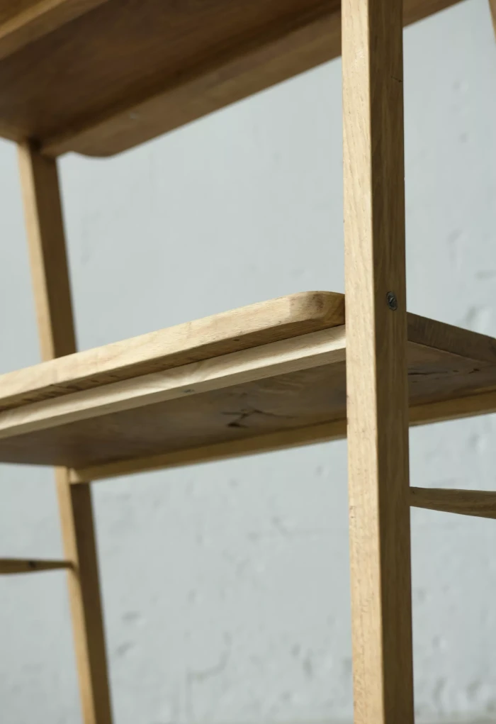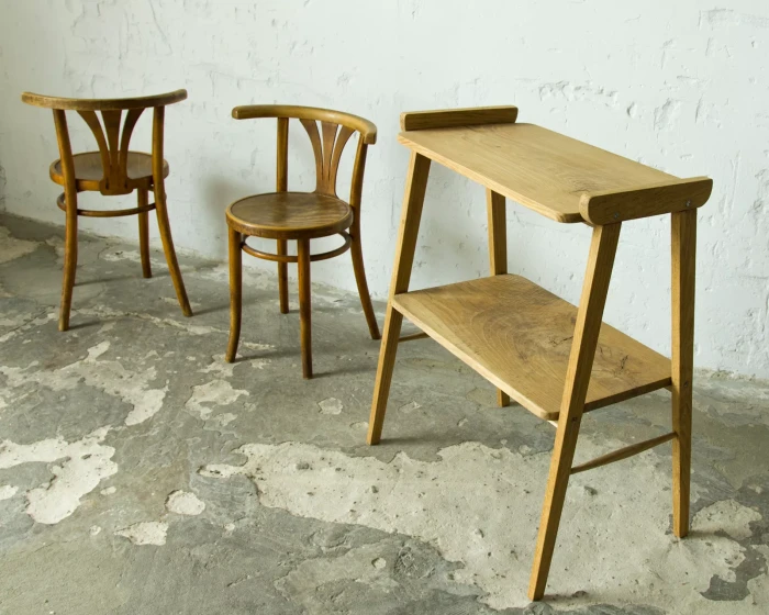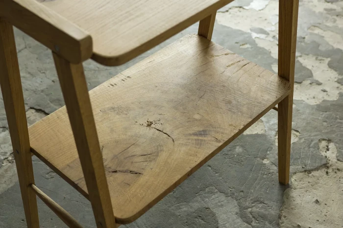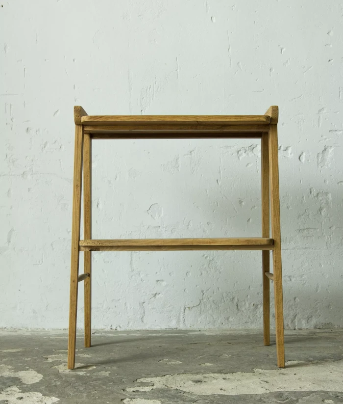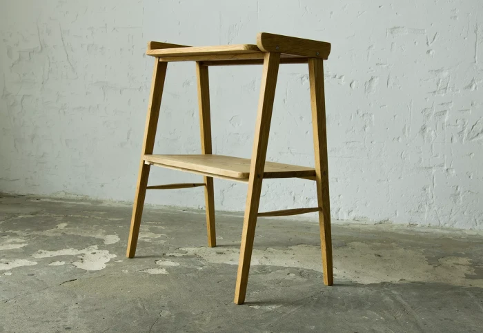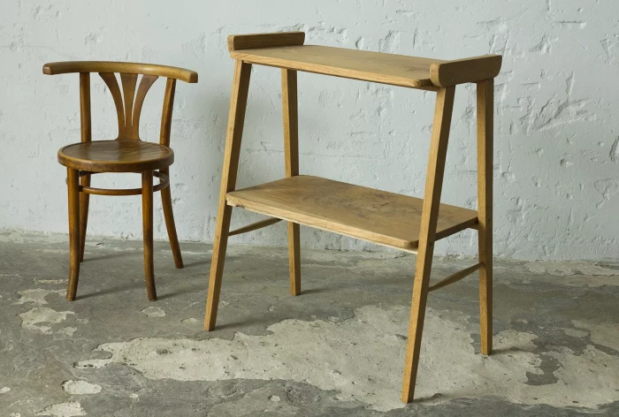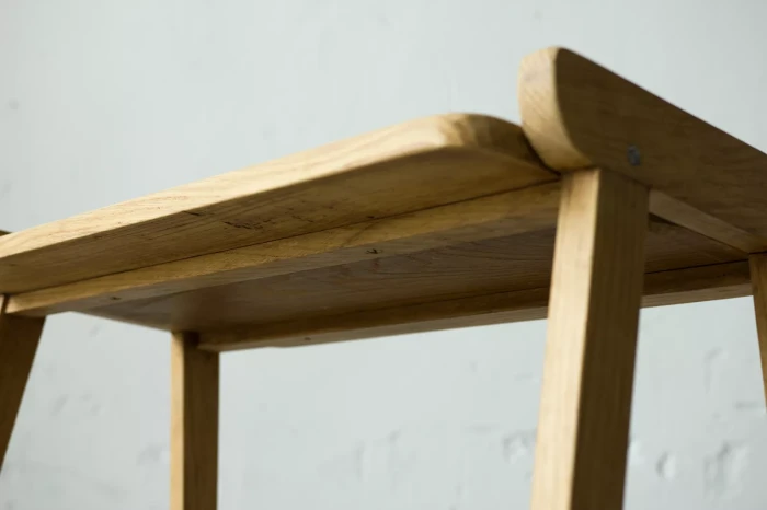 Stolik rtv (typ 600-210) przypomina jeden z wielu masowych produktów prl, ale ten jest wyjątkowy ponieważ w całości został wykonany z litego drewna dębowego, a większość miała blaty z płyty pokryte fornirem. Jak na swoje lata mebel zachowany jest w dobrym stanie, konstrukcja jest stabilna, drewno suche bez zawilgocenia i nieprzyjemnych zapachów.