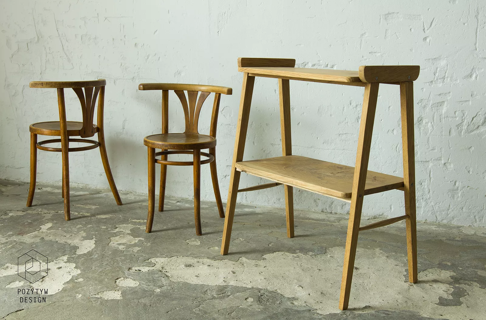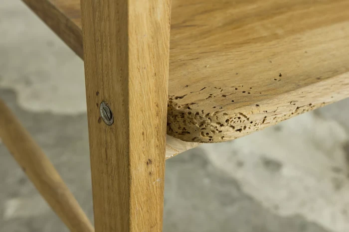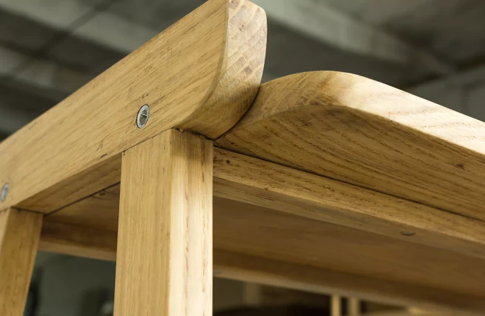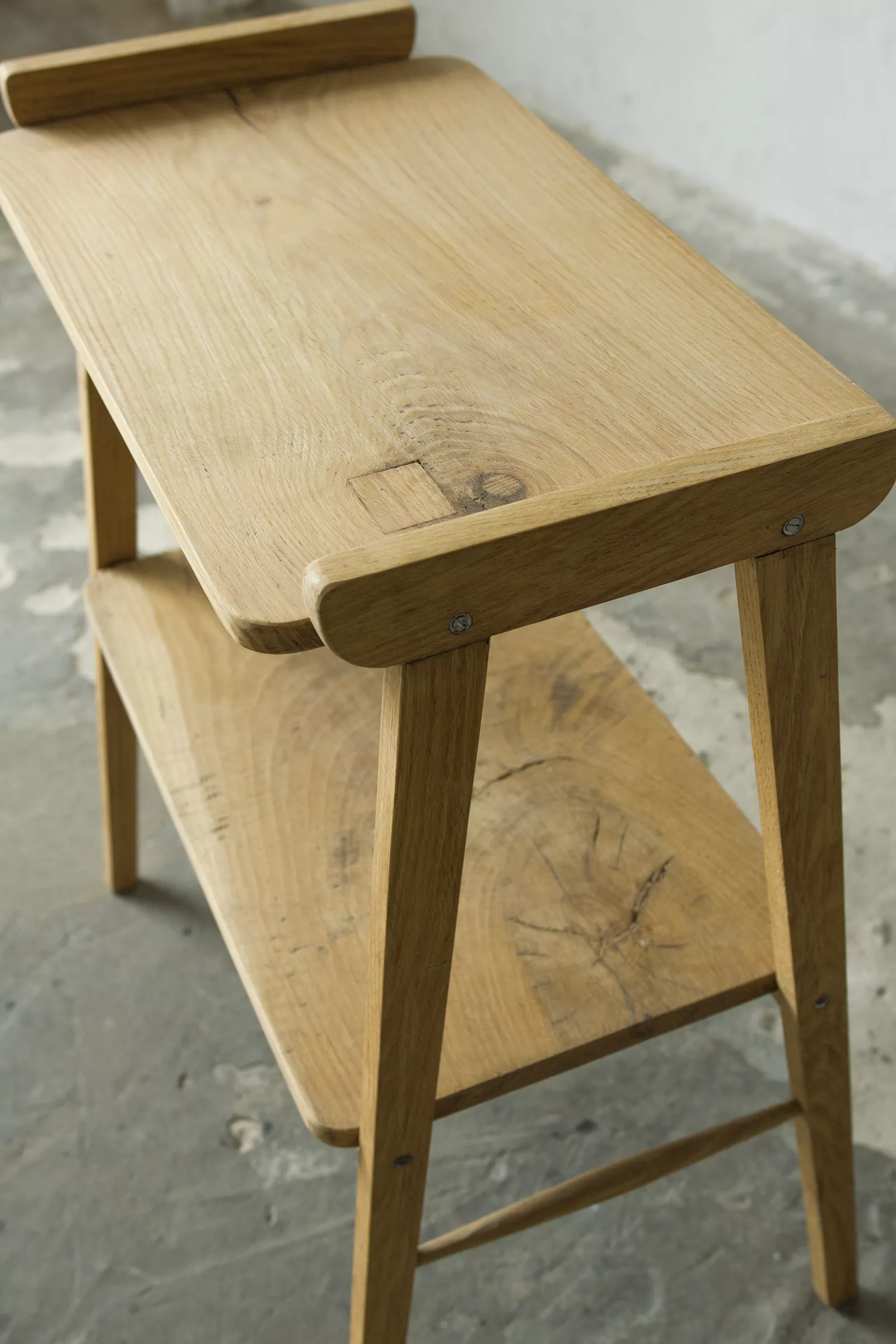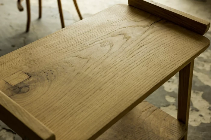Stolik rtv (typ 600-210) przypomina jeden z wielu masowych produktów prl, ale ten jest wyjątkowy ponieważ w całości został wykonany z litego drewna dębowego, a większość miała blaty z płyty pokryte fornirem. Jak na swoje lata mebel zachowany jest w dobrym stanie, konstrukcja jest stabilna, drewno suche bez zawilgocenia i nieprzyjemnych zapachów.
