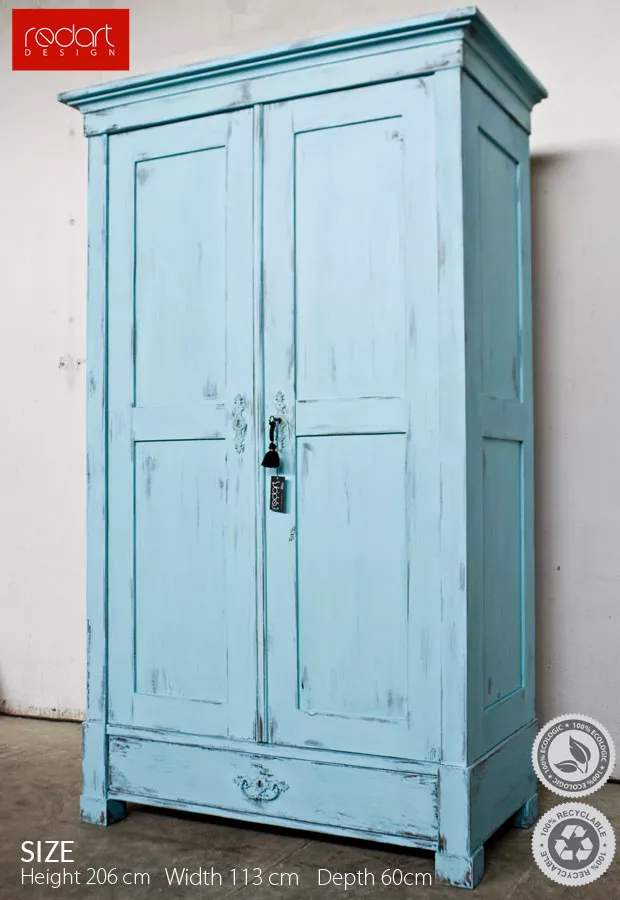 Wąska szafa z pojedynczą szufladą i przecierkami w stylu vintage. Mebel drewniany w bardzo dobrym stanie, bez kornika, brak nieprzyjemnych zapachów i wilgoci. Mebel po konserwacji, gotowy do użytkowania.