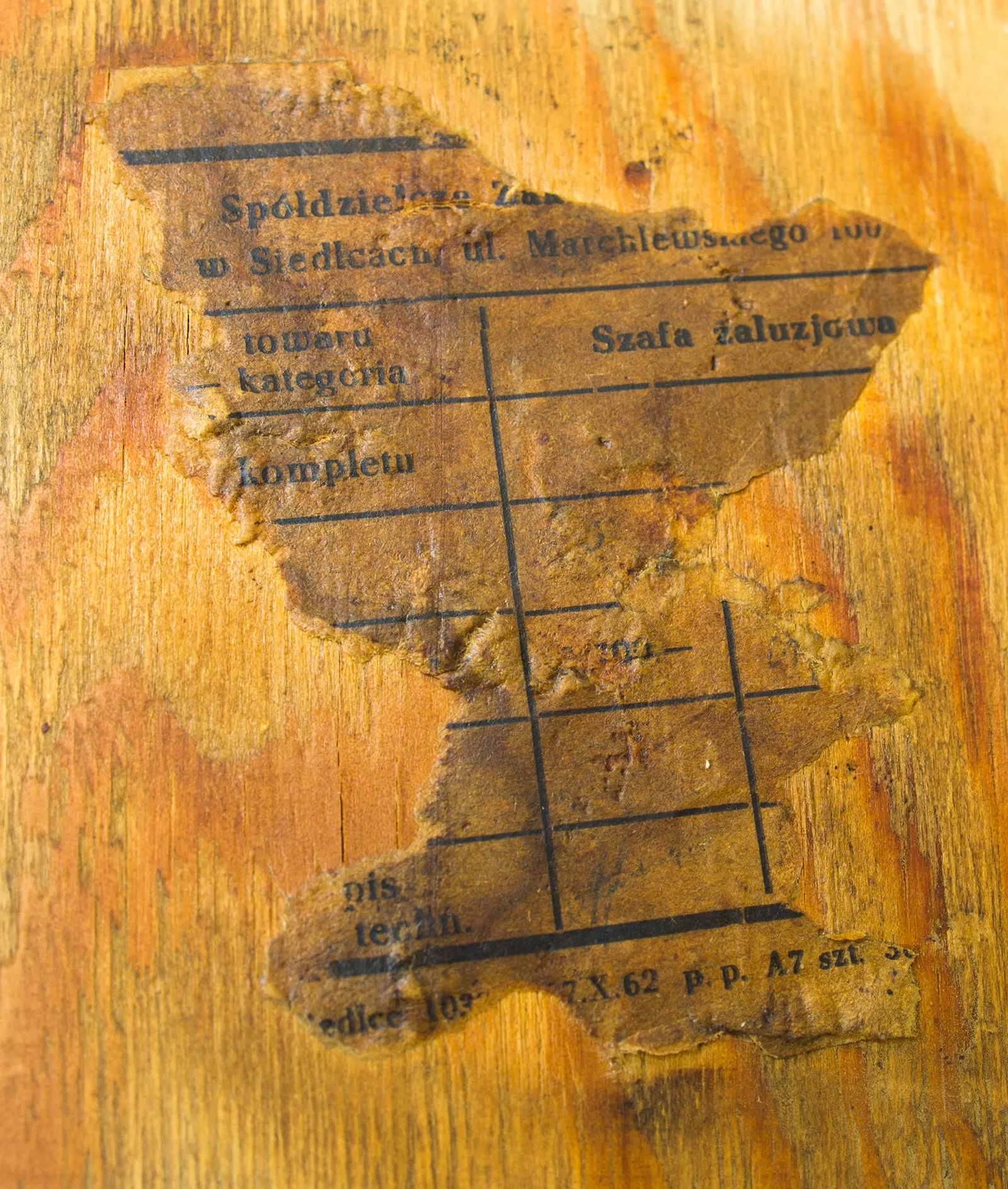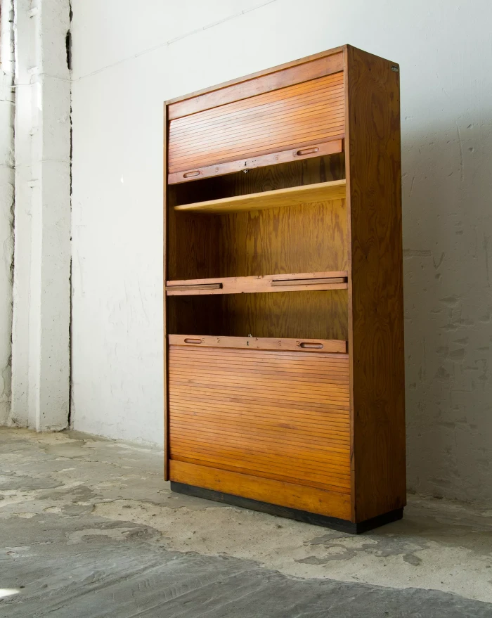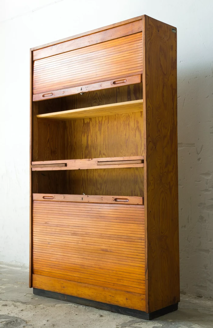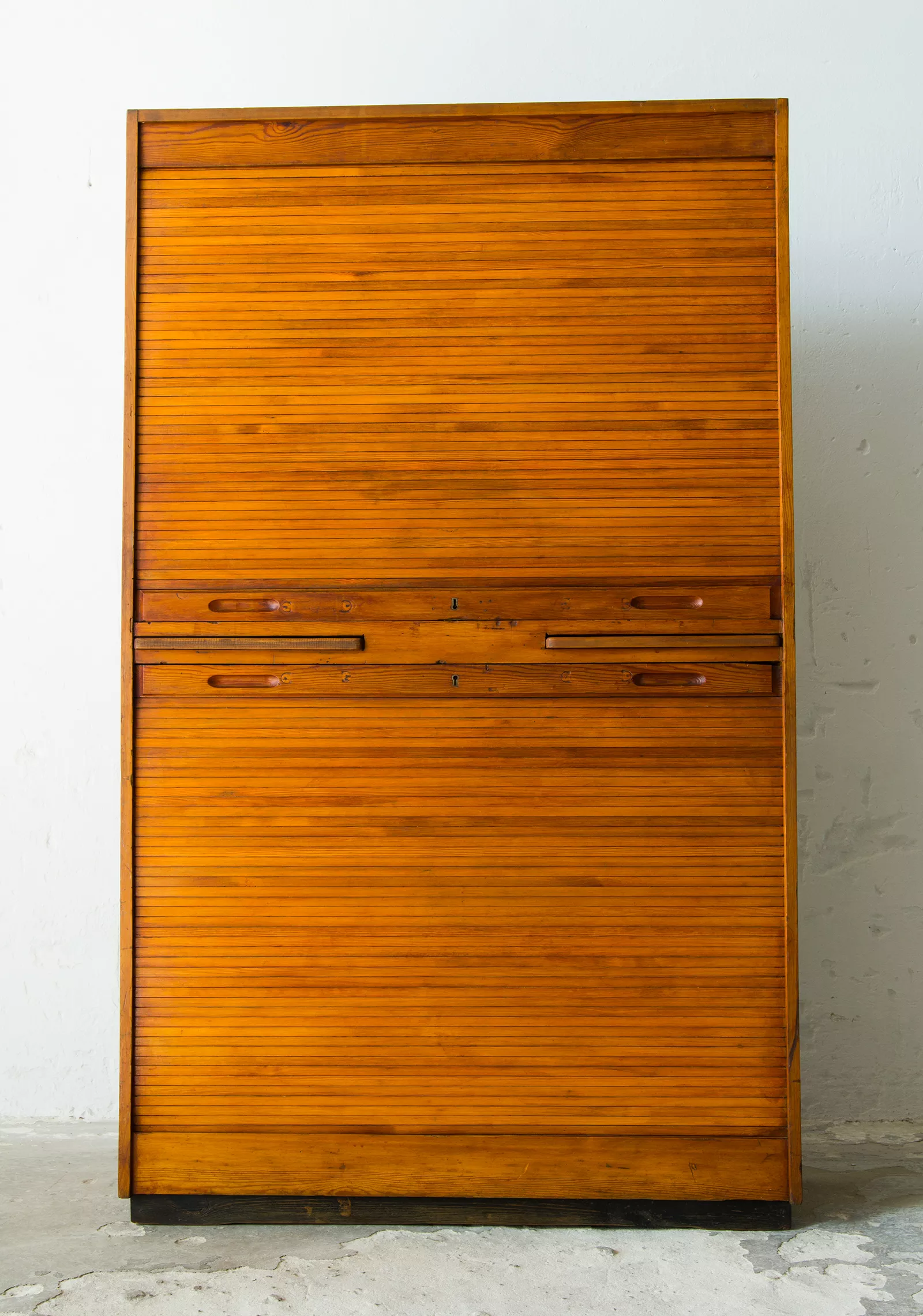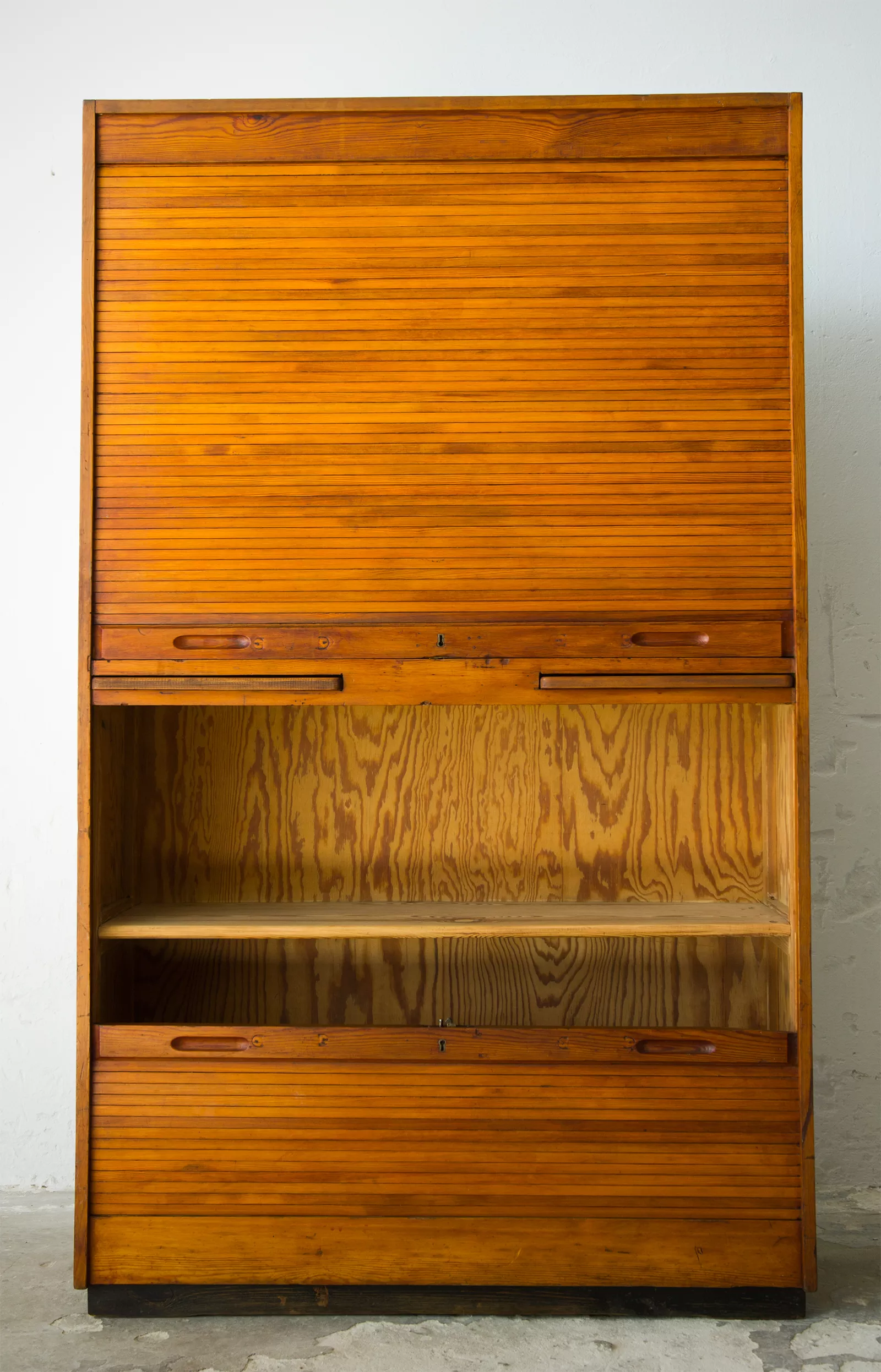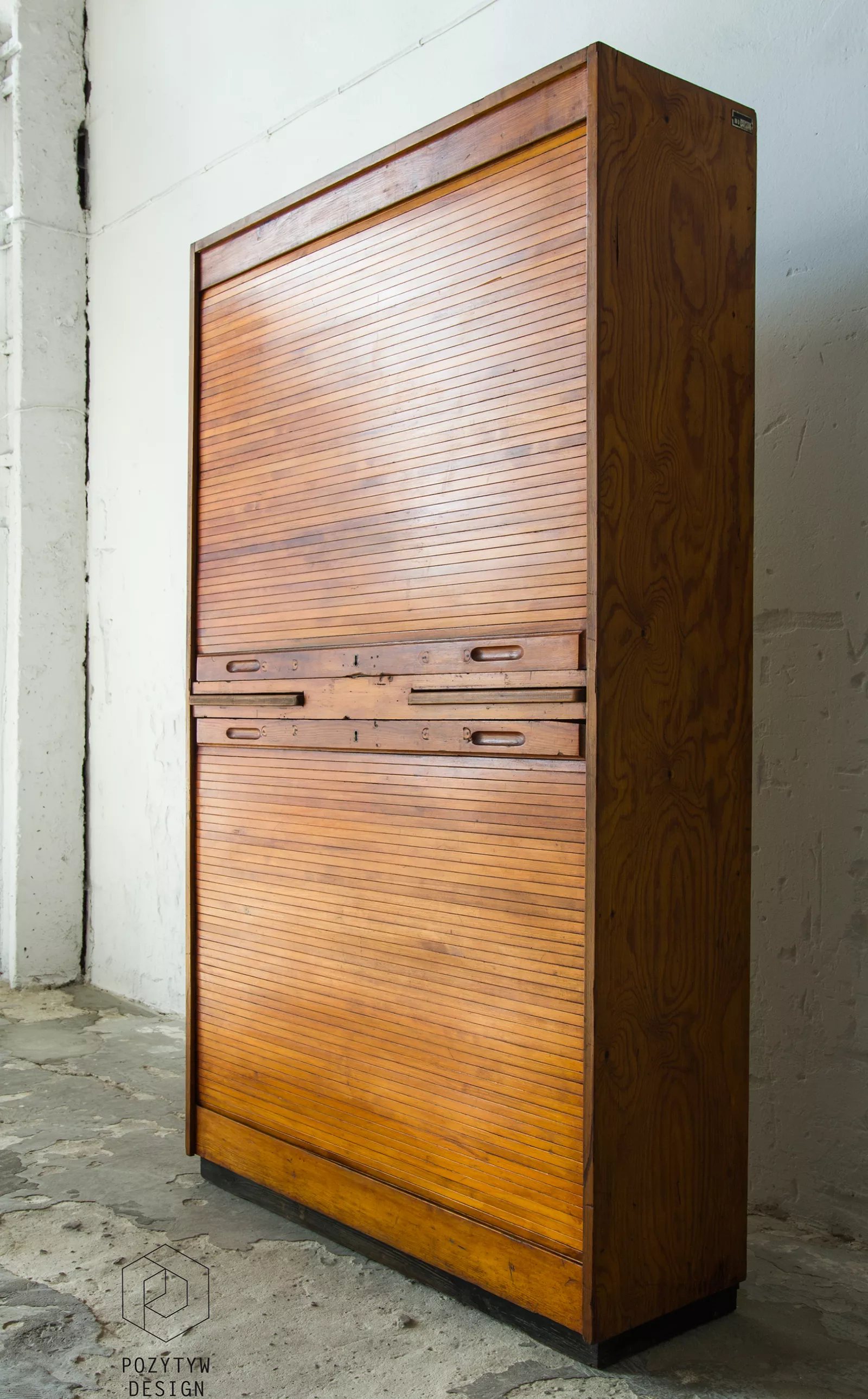 Polska szafa żaluzjowa jest to mebel biurowy z lat 60. Posiada charakterystyczny system roletowy składający się z cienkich listewek, który po otwarciu chowa się w ukryte komory i wtedy szafa może również pełnić funkcję regału. Mebel jest w oryginalnym i bardzo dobrym stanie vintage, w całości wykonany z litego drewna sosnowego, które jest bez zawilgocenia i nieprzyjemnych zapachów. Konstrukcja jest sztywna i stabilna, żaluzje jak i zamki są sprawne. W komplecie są dwa kluczyki.