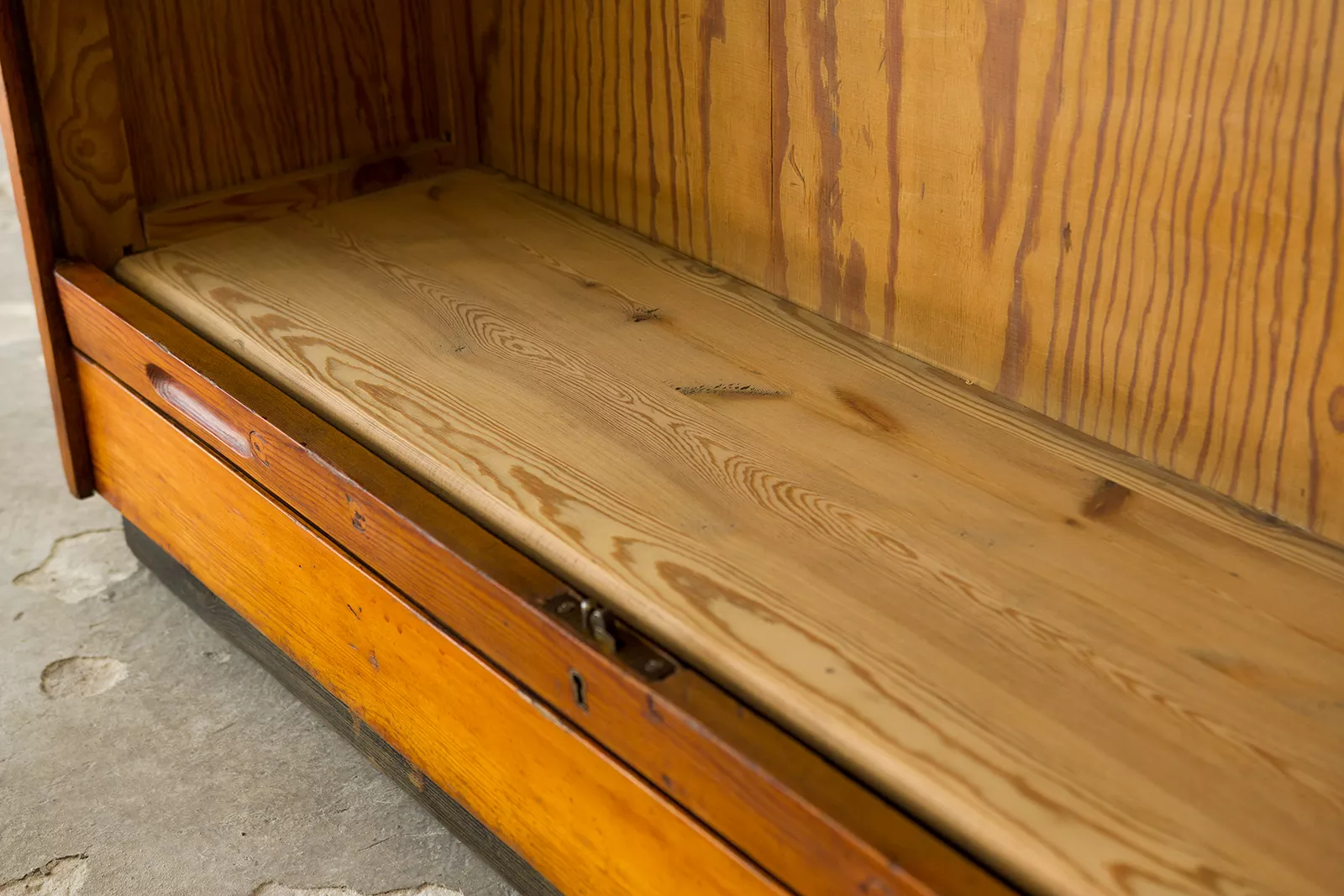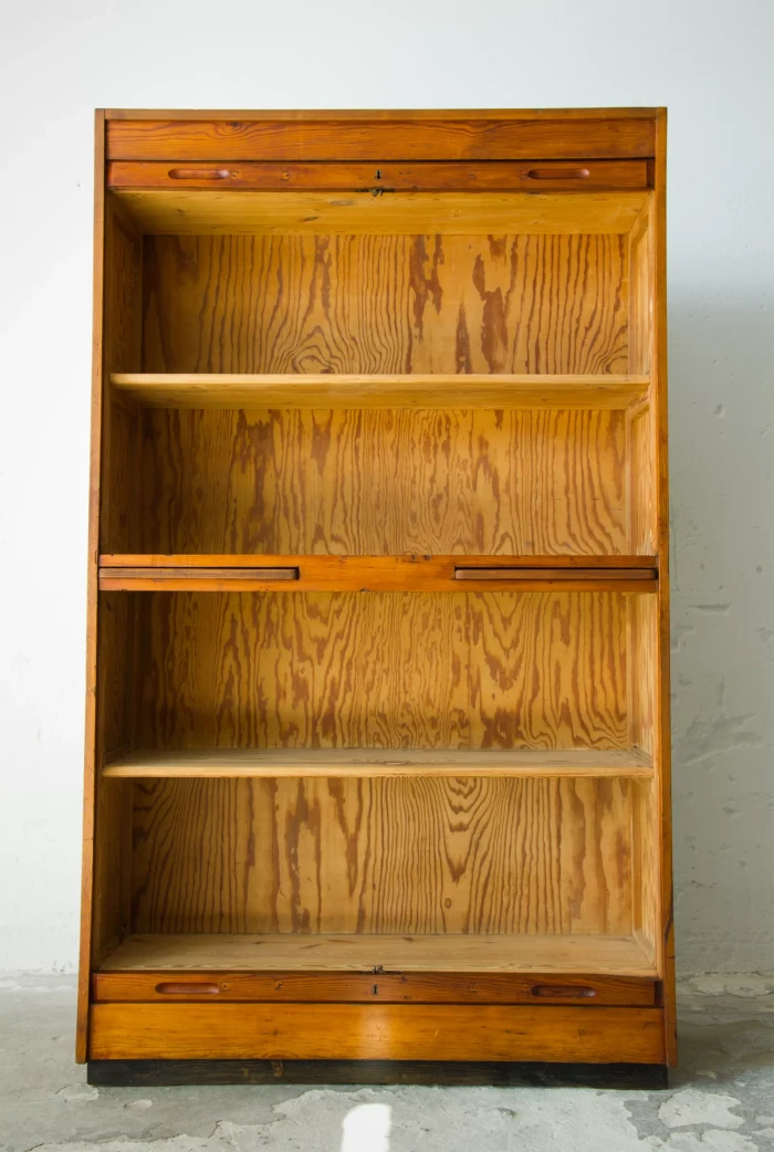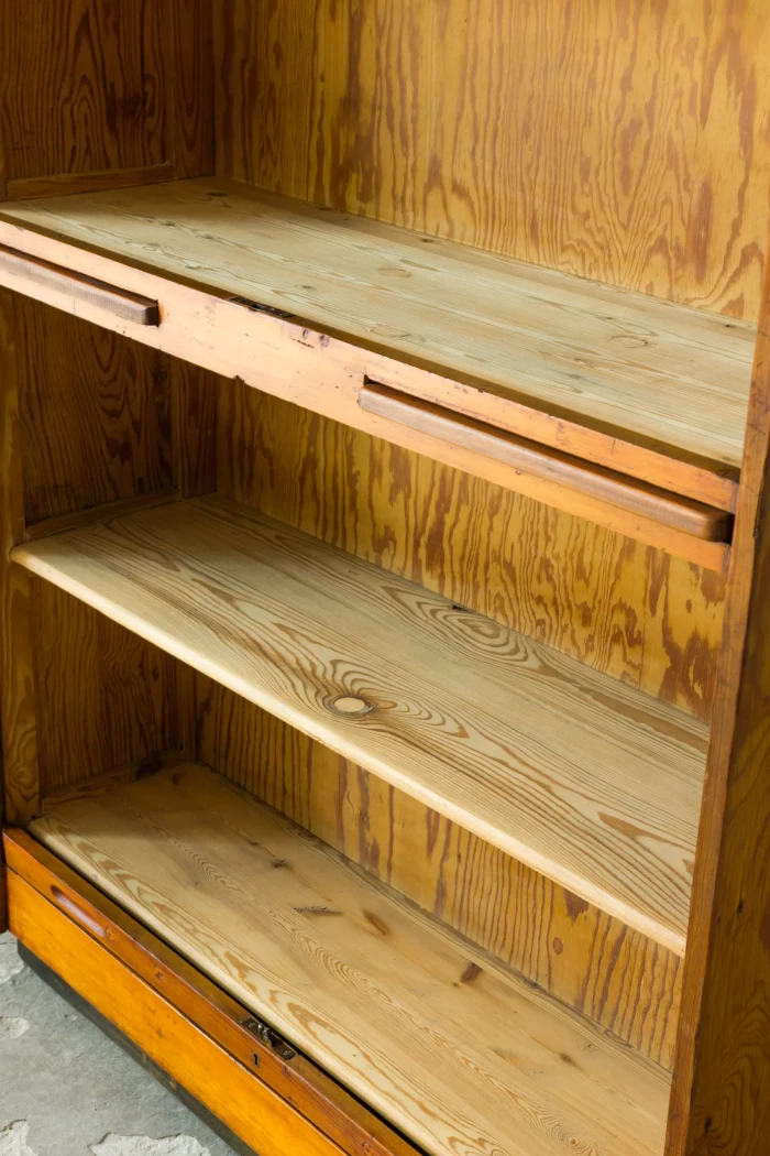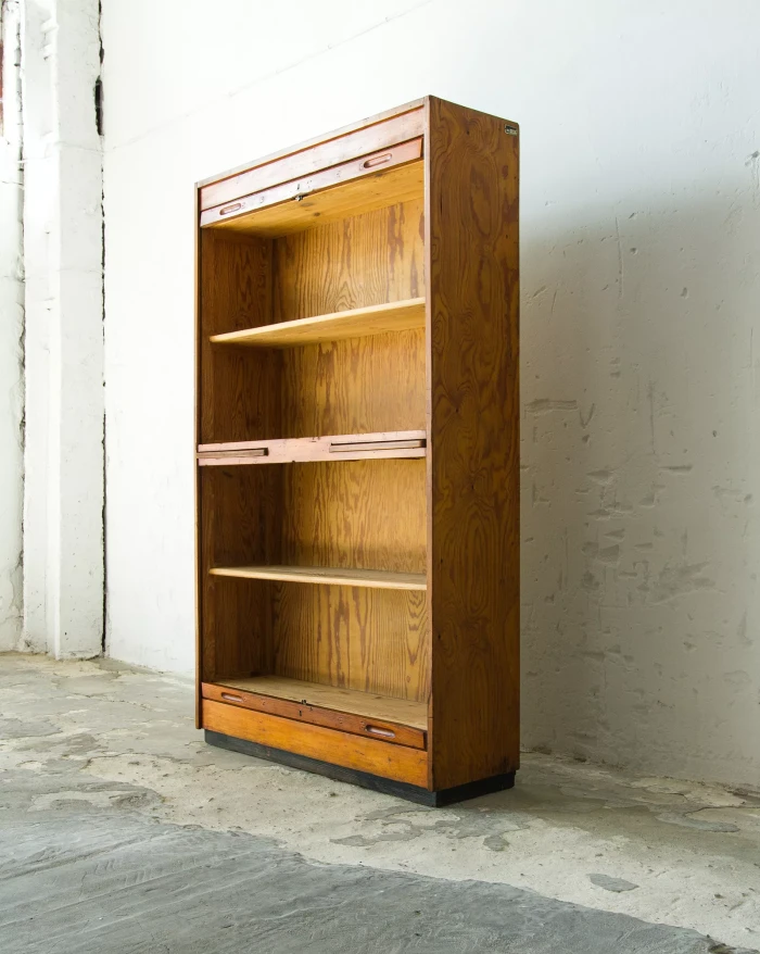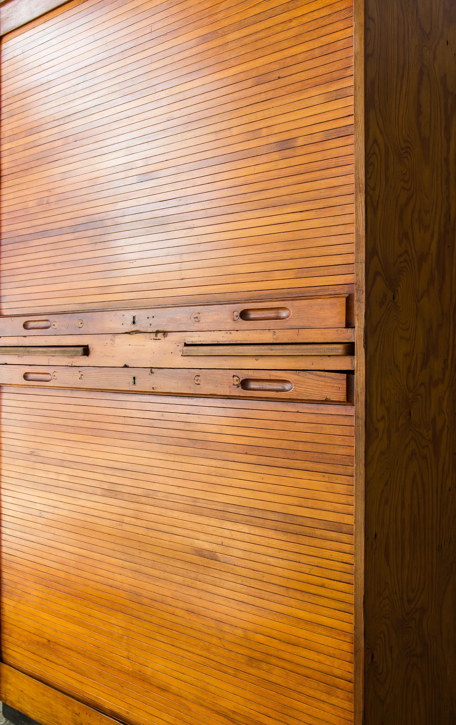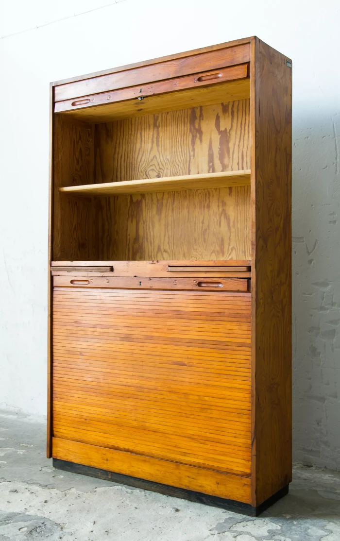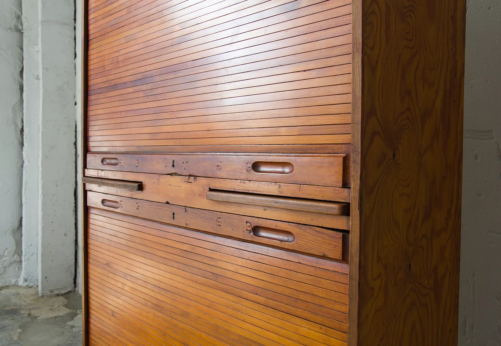 Polska szafa żaluzjowa jest to mebel biurowy z lat 60. Posiada charakterystyczny system roletowy składający się z cienkich listewek, który po otwarciu chowa się w ukryte komory i wtedy szafa może również pełnić funkcję regału. Mebel jest w oryginalnym i bardzo dobrym stanie vintage, w całości wykonany z litego drewna sosnowego, które jest bez zawilgocenia i nieprzyjemnych zapachów. Konstrukcja jest sztywna i stabilna, żaluzje jak i zamki są sprawne. W komplecie są dwa kluczyki.