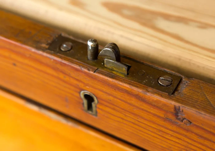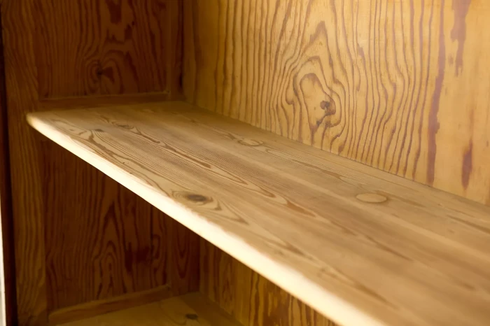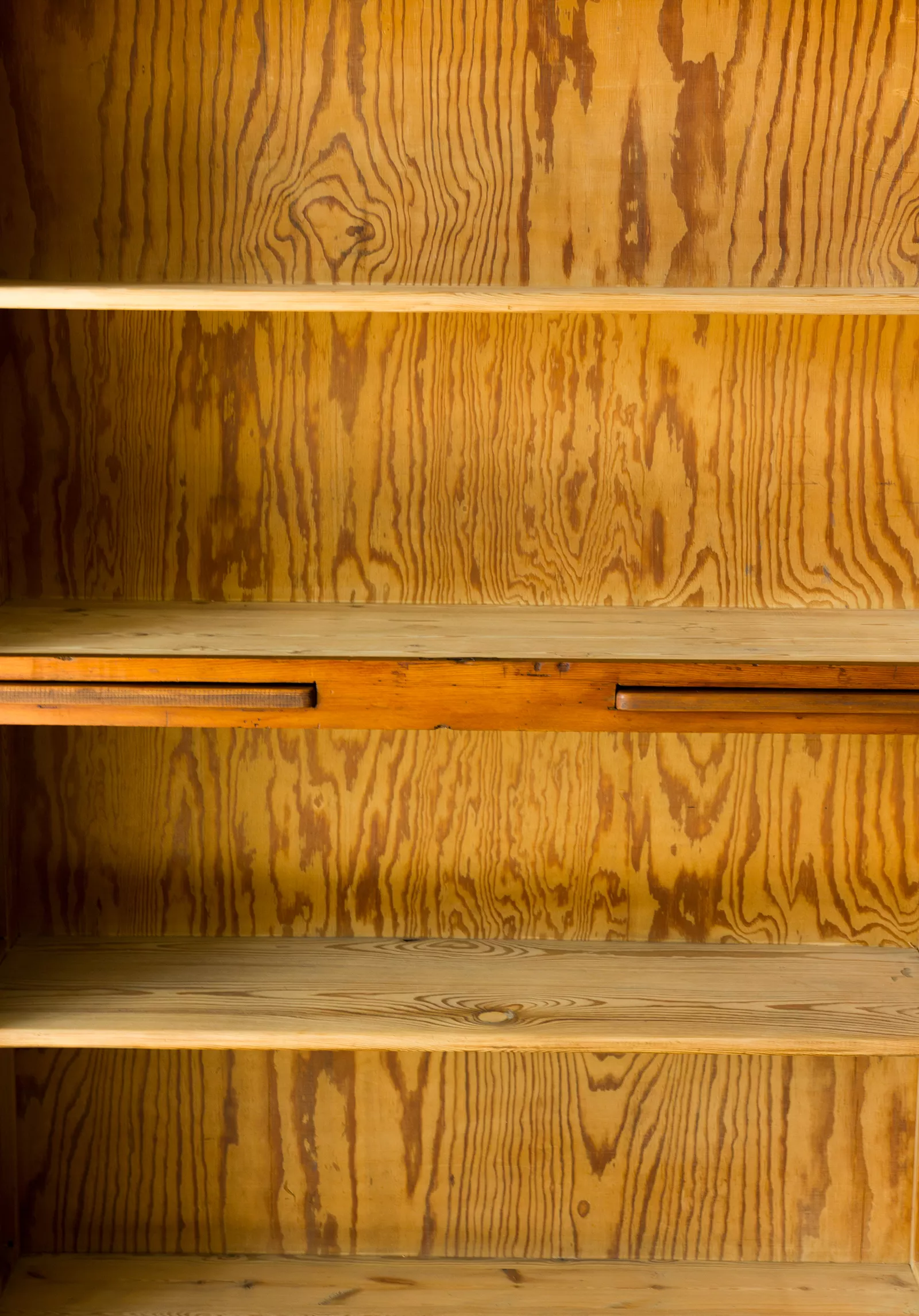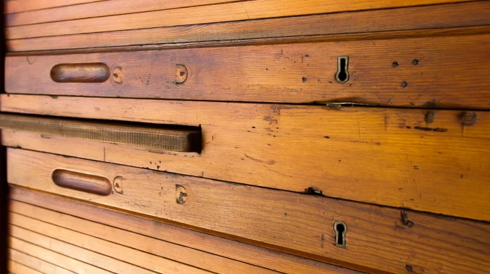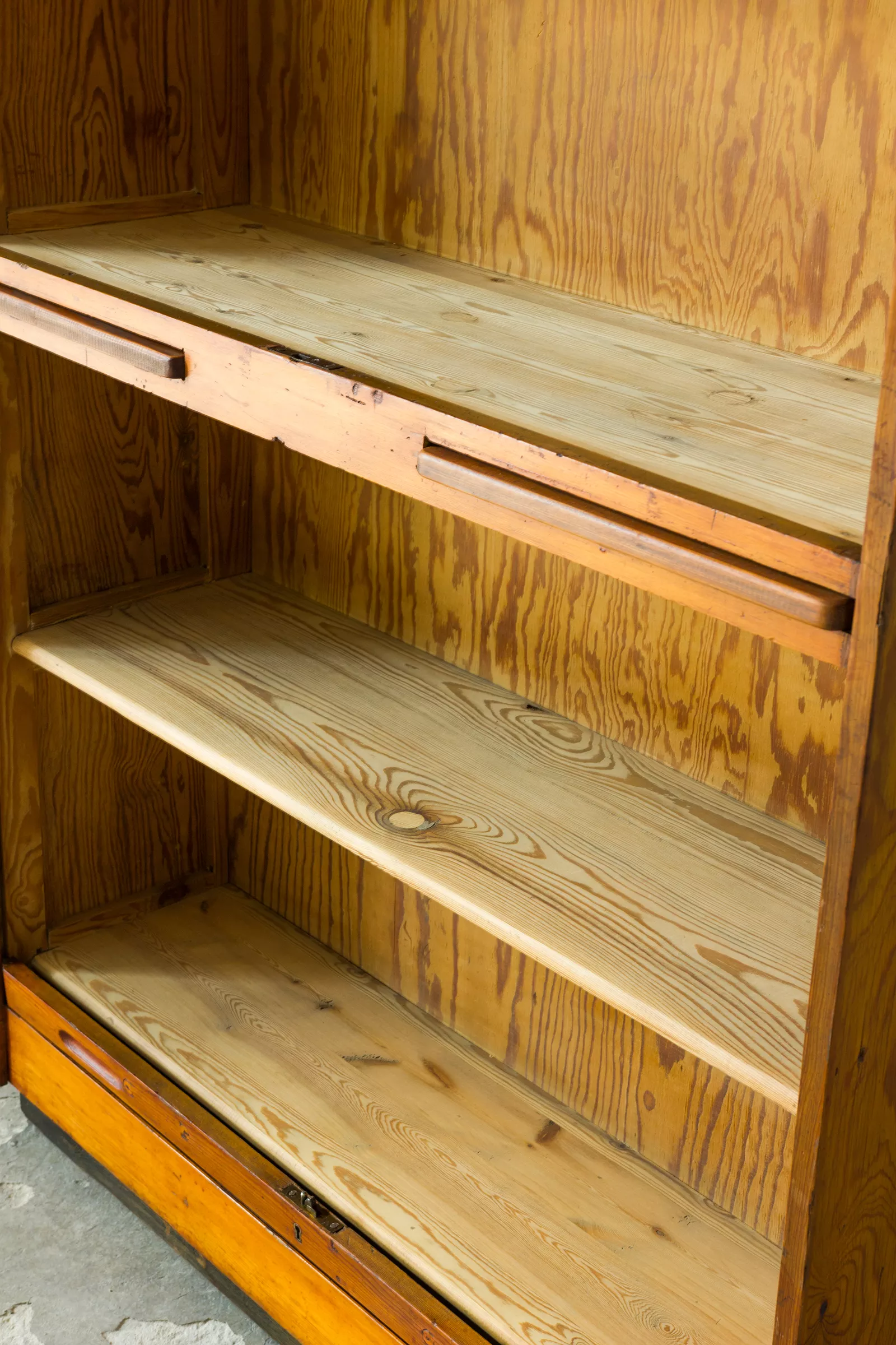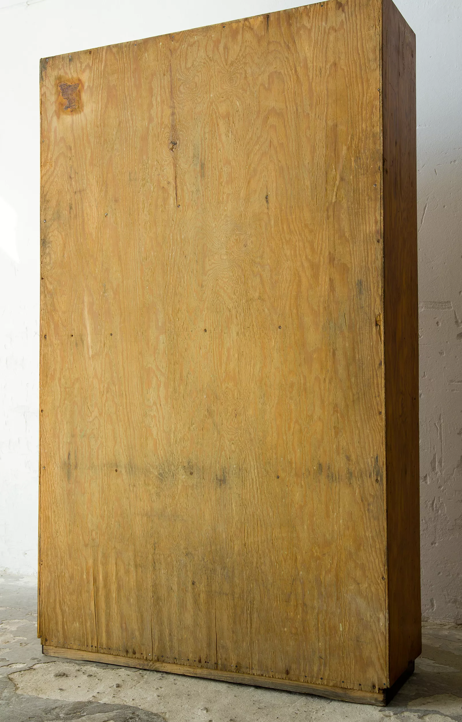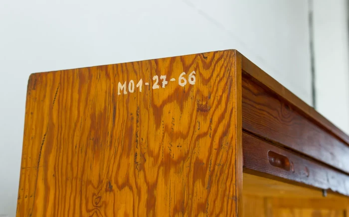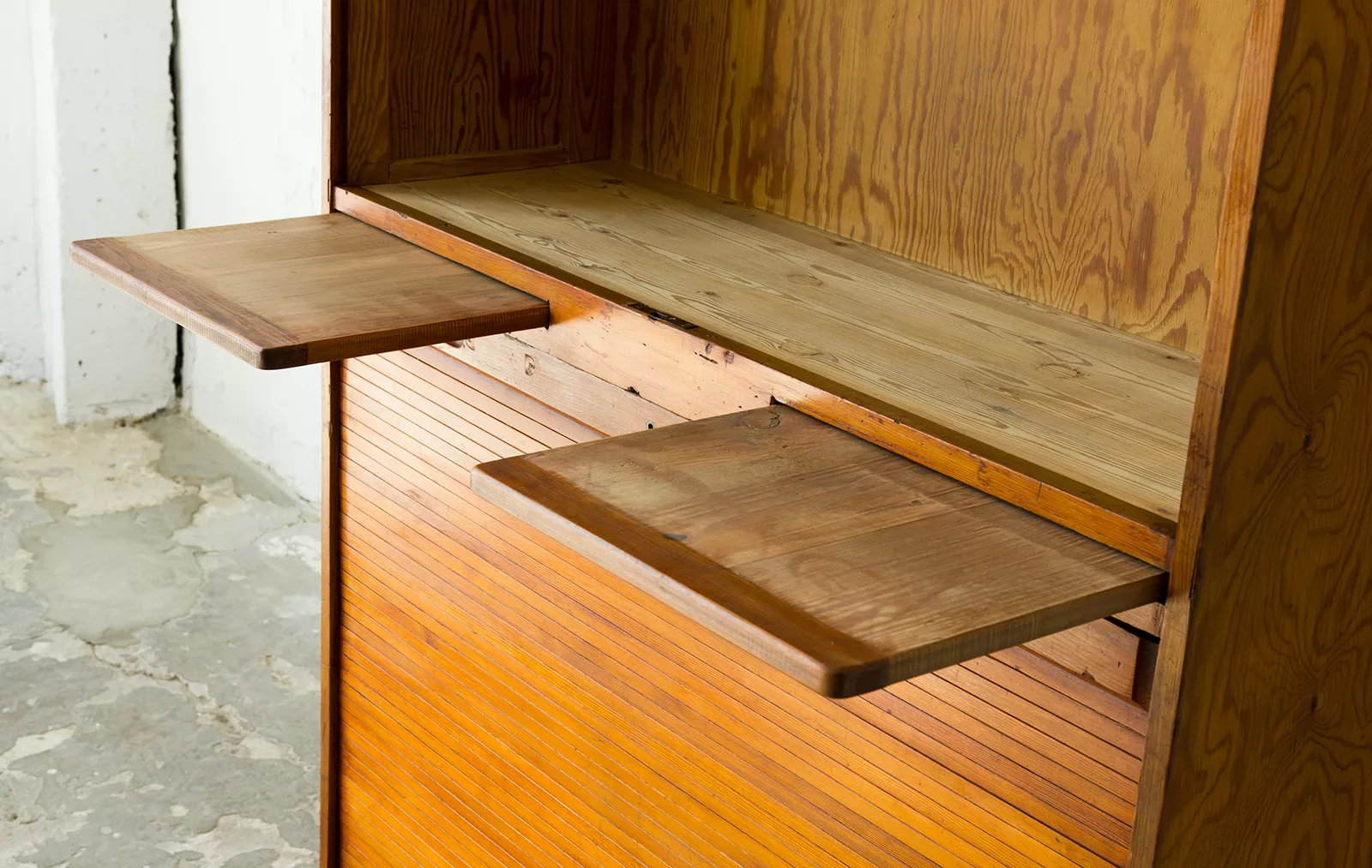 Polska szafa żaluzjowa jest to mebel biurowy z lat 60. Posiada charakterystyczny system roletowy składający się z cienkich listewek, który po otwarciu chowa się w ukryte komory i wtedy szafa może również pełnić funkcję regału. Mebel jest w oryginalnym i bardzo dobrym stanie vintage, w całości wykonany z litego drewna sosnowego, które jest bez zawilgocenia i nieprzyjemnych zapachów. Konstrukcja jest sztywna i stabilna, żaluzje jak i zamki są sprawne. W komplecie są dwa kluczyki.