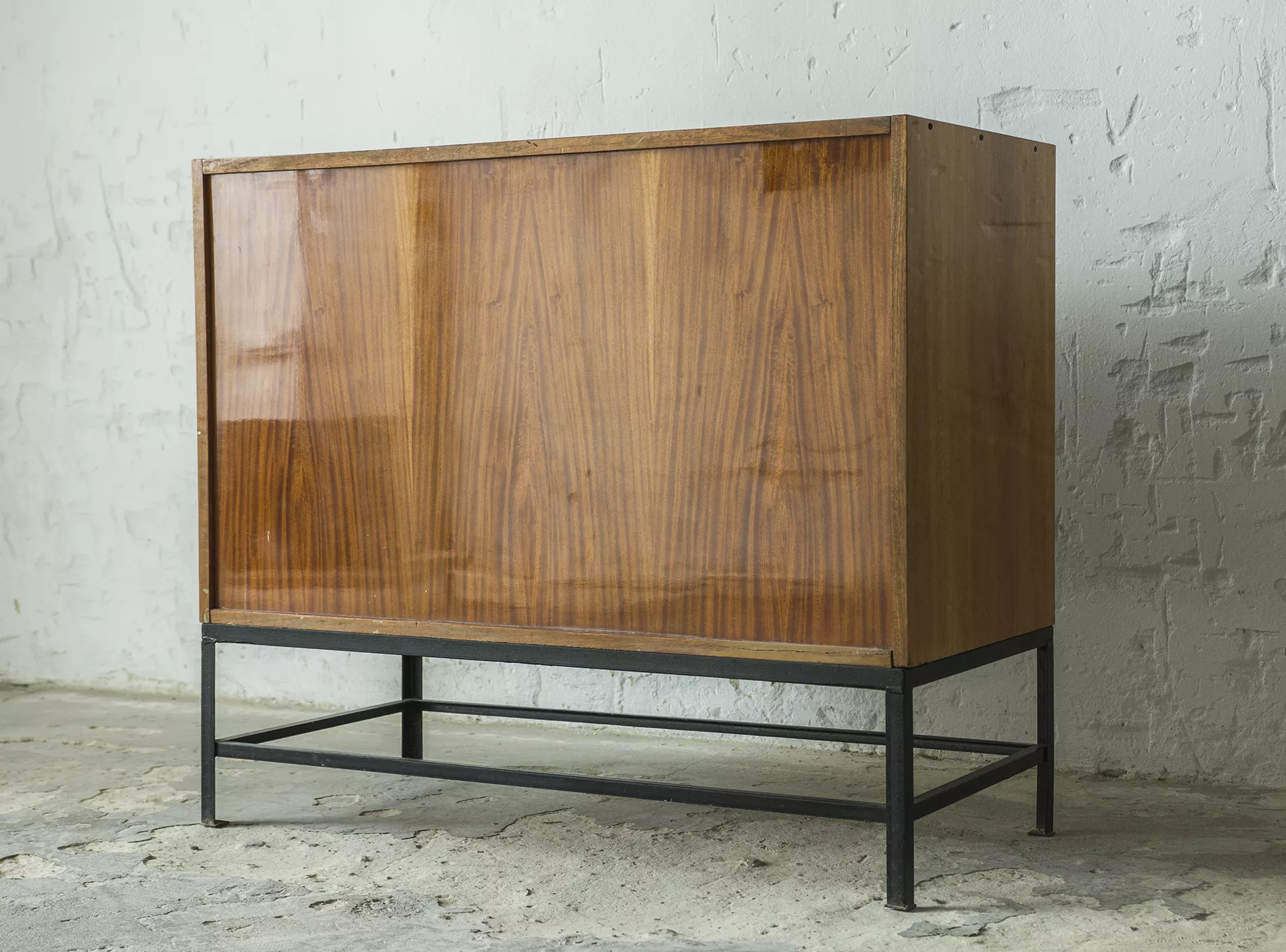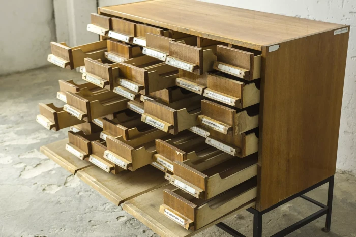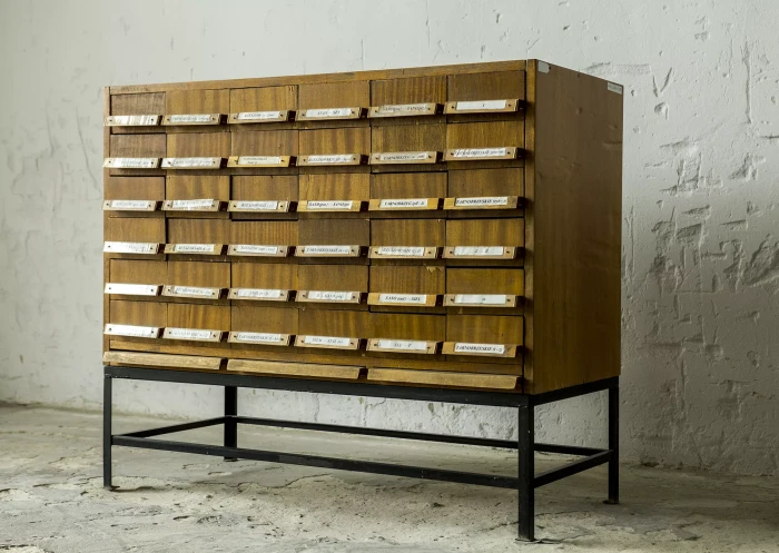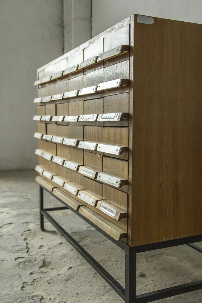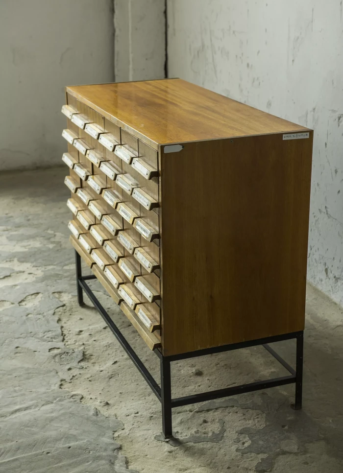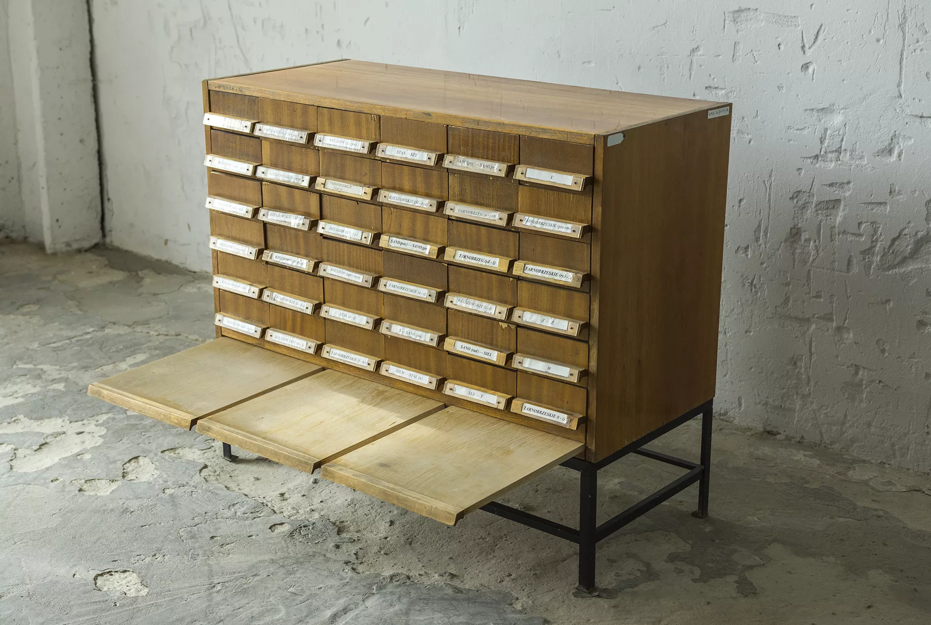 Industrialna szafka katalogowa, klasyczny mebel biurowy rodem z PRL-u. Posiada dużo szufladek na różnego rodzaju drobiazgi, całość wsparta jest na metalowej masywnej podstawie. Zachowana jest w oryginalnym stanie vintage.