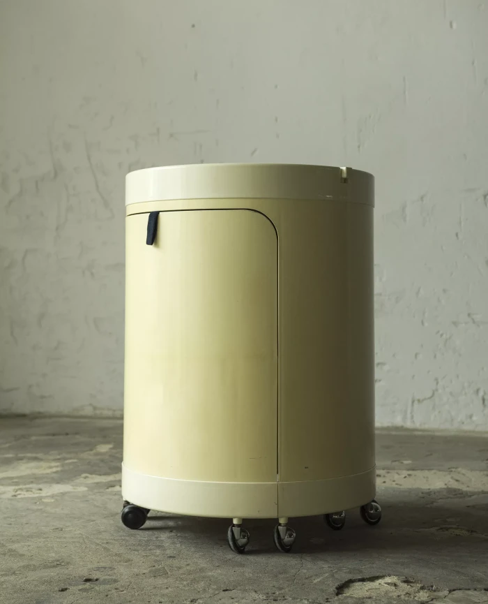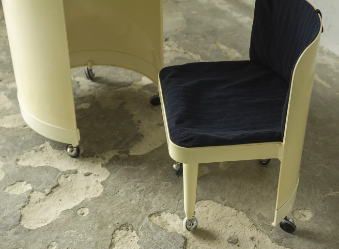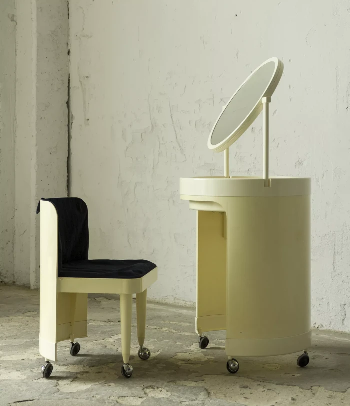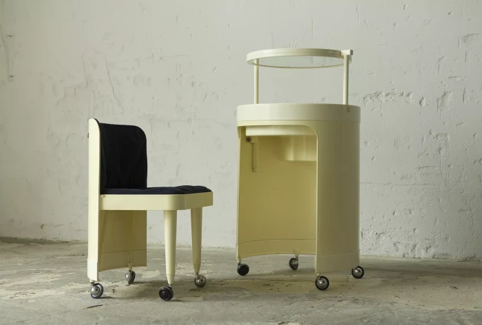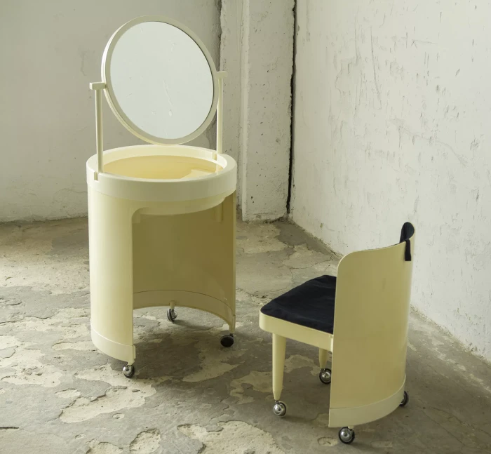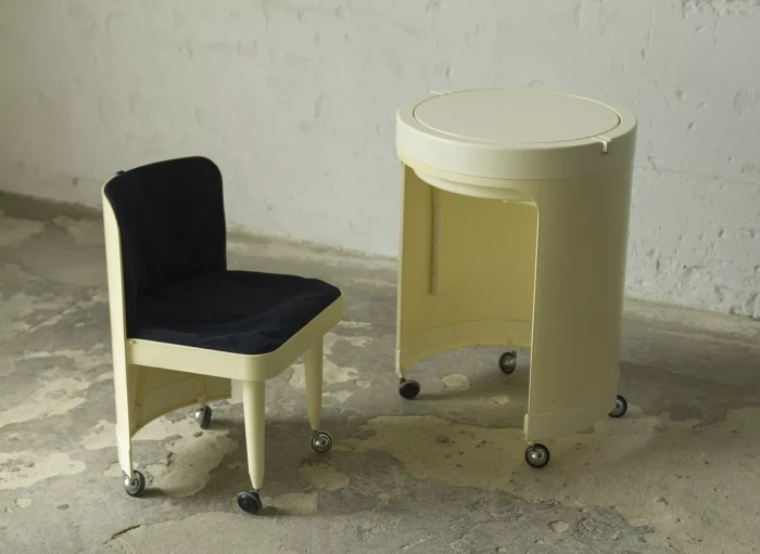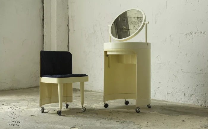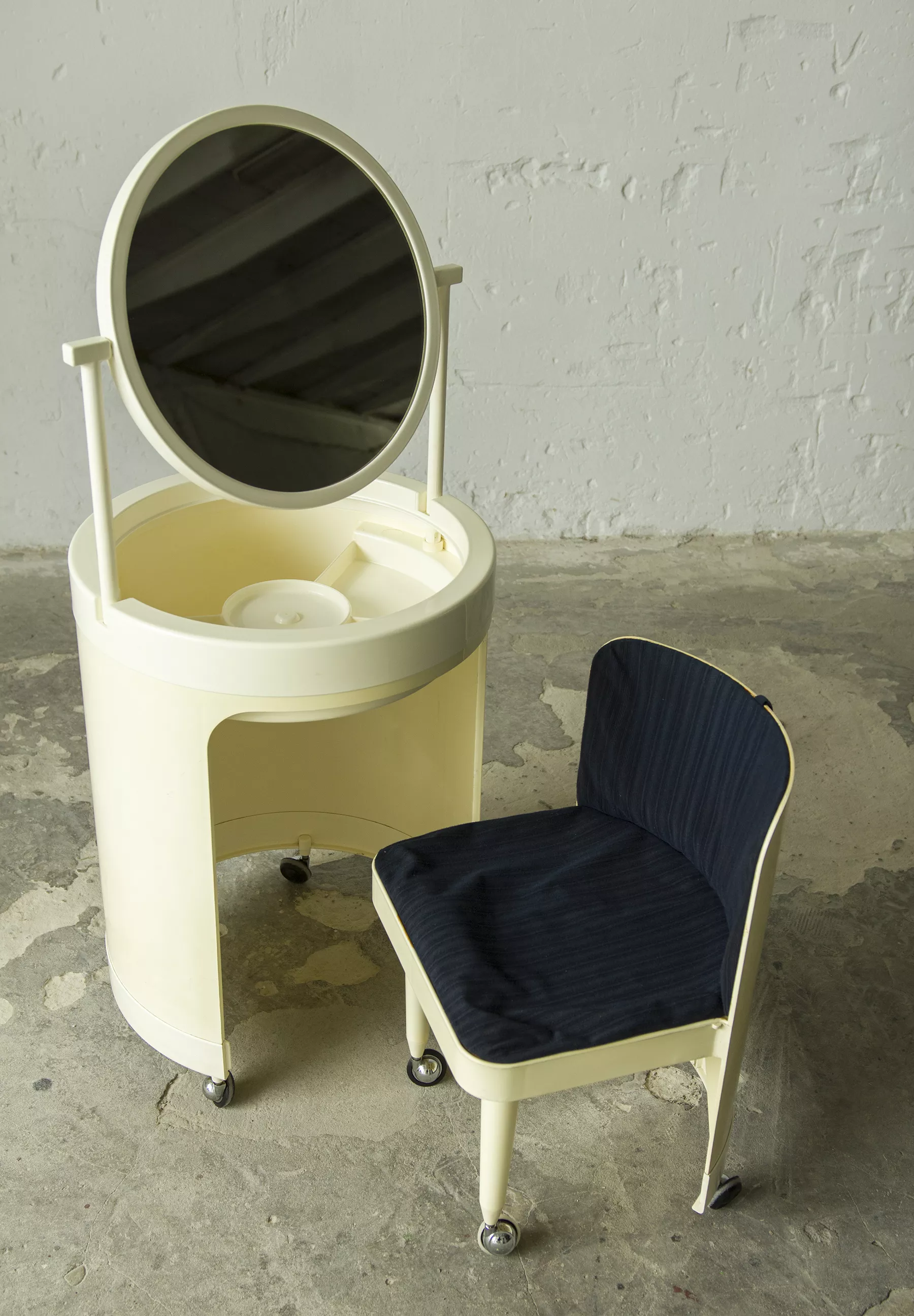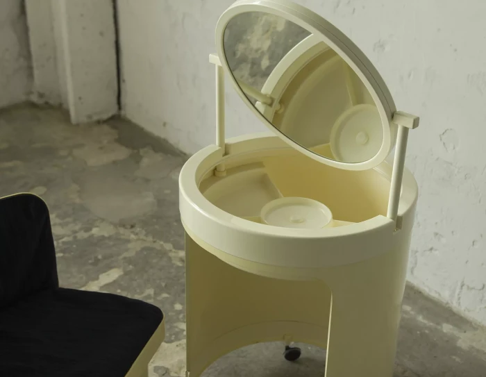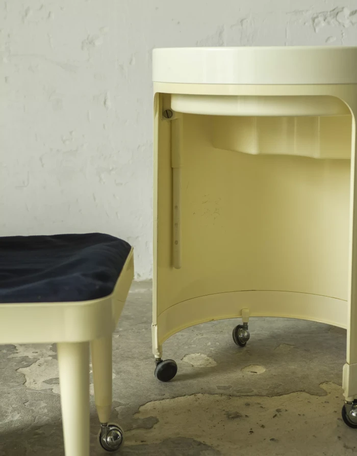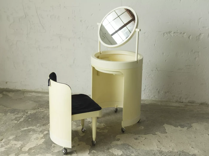 Wspaniały włoski projekt "Silvi" z lat 70-tych wyprodukowany przez Studio Kastilia. Plastikowa toaletka o kosmicznym designie w cylindrycznej obudowie na kółkach skrywa krzesło tapicerowane granatowym aksamitem i podnoszony blat z lustrem, które można regulować na trzech wysokościach i pod różnymi kątami. W środku znajdują się przegródki na różnego rodzaju akcesoria, natomiast tylna część jest wystarczająco głęboka, żeby pomieścić większe przedmioty. Jest to niezwykle rzadki i stylowy mebel zachowany w oryginalnym i bardzo dobrym stanie.