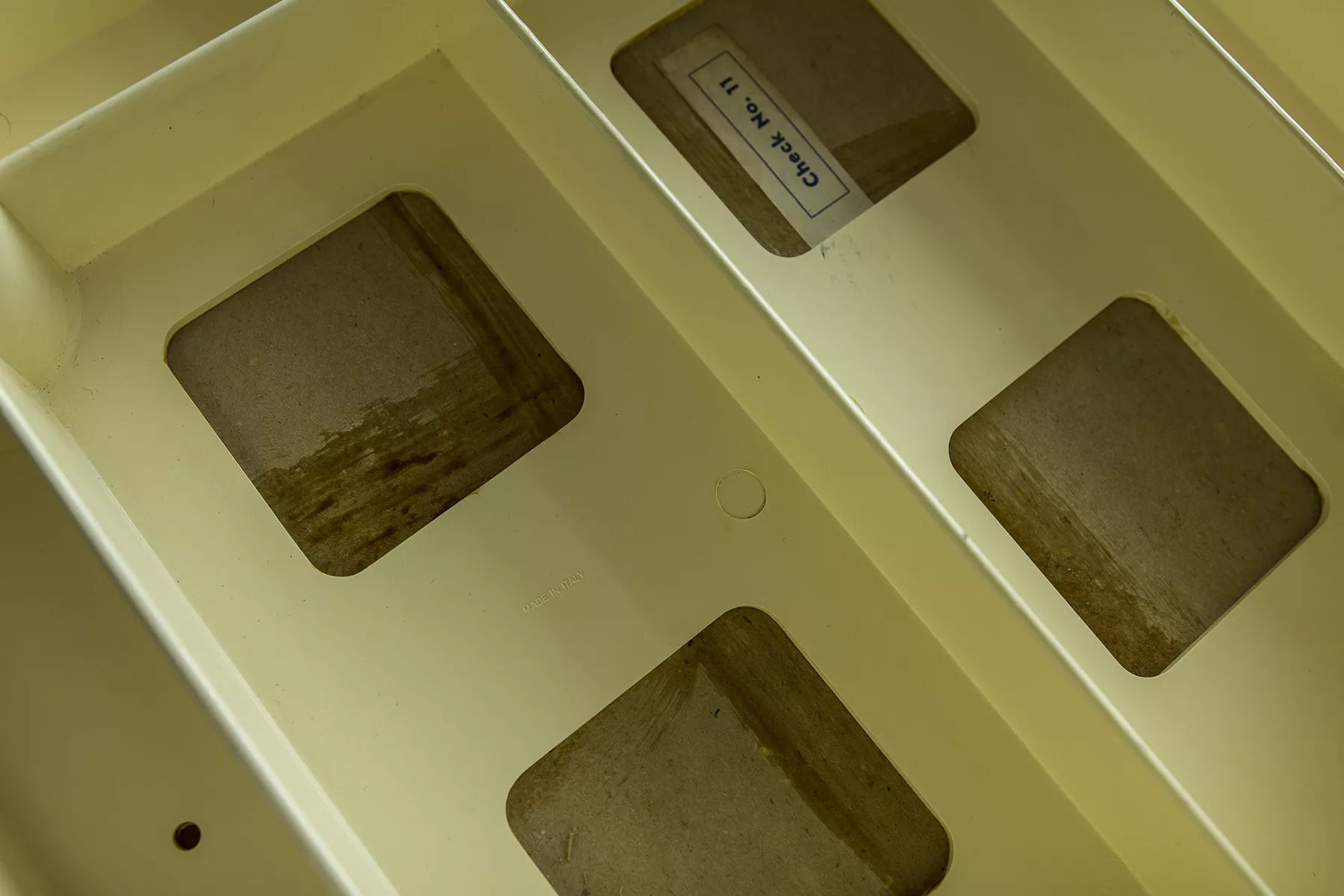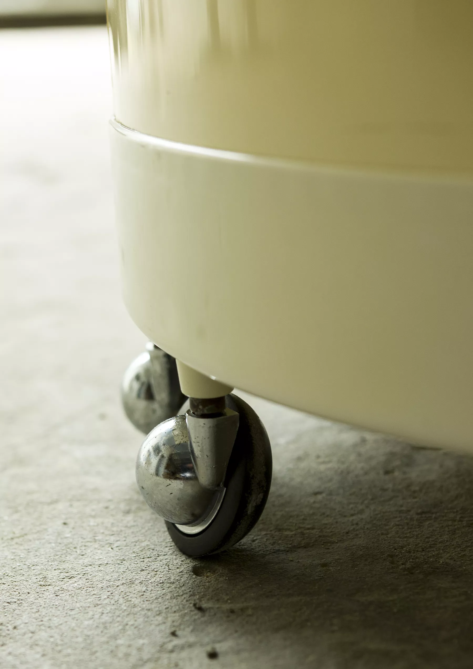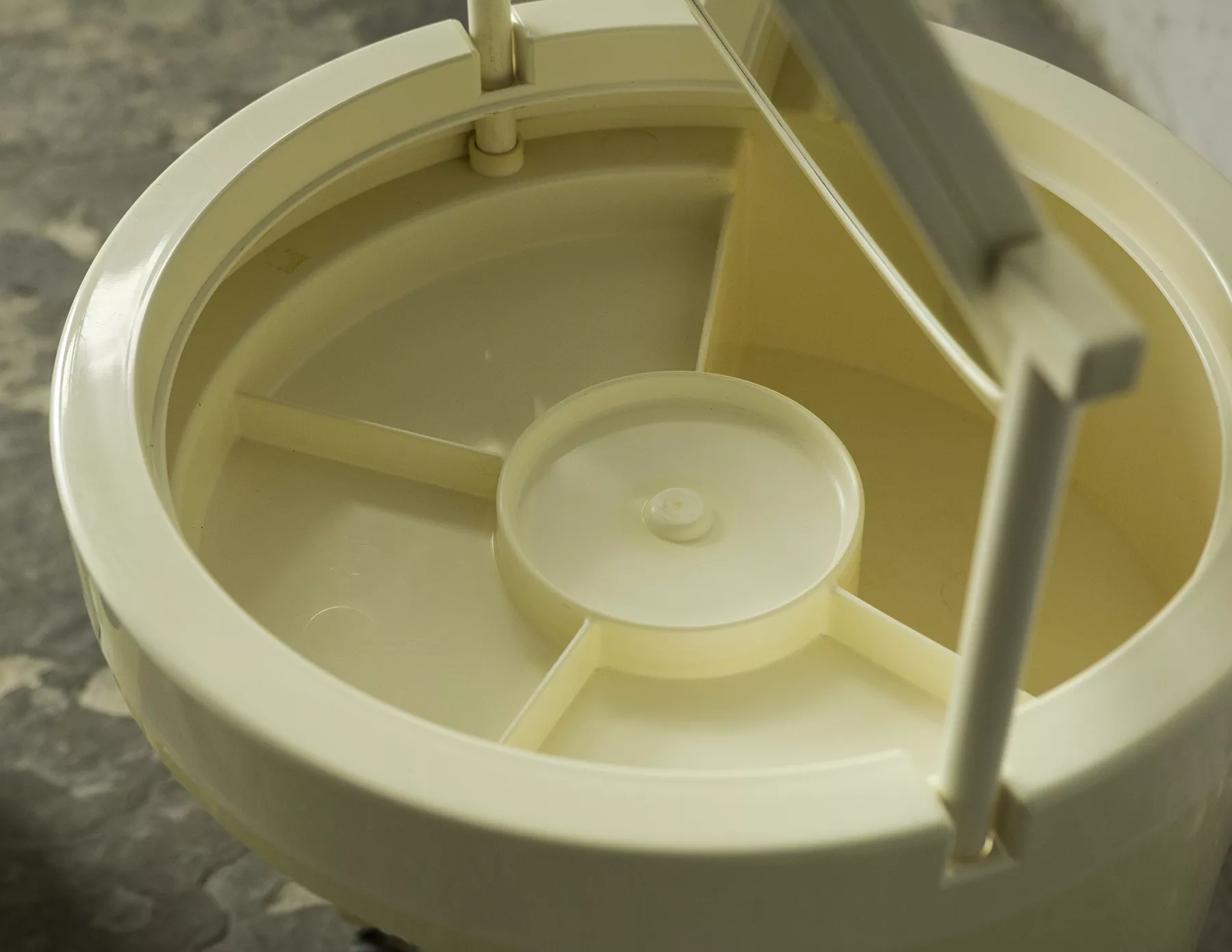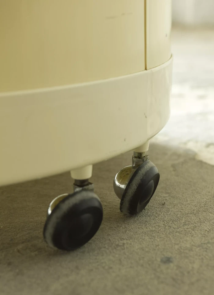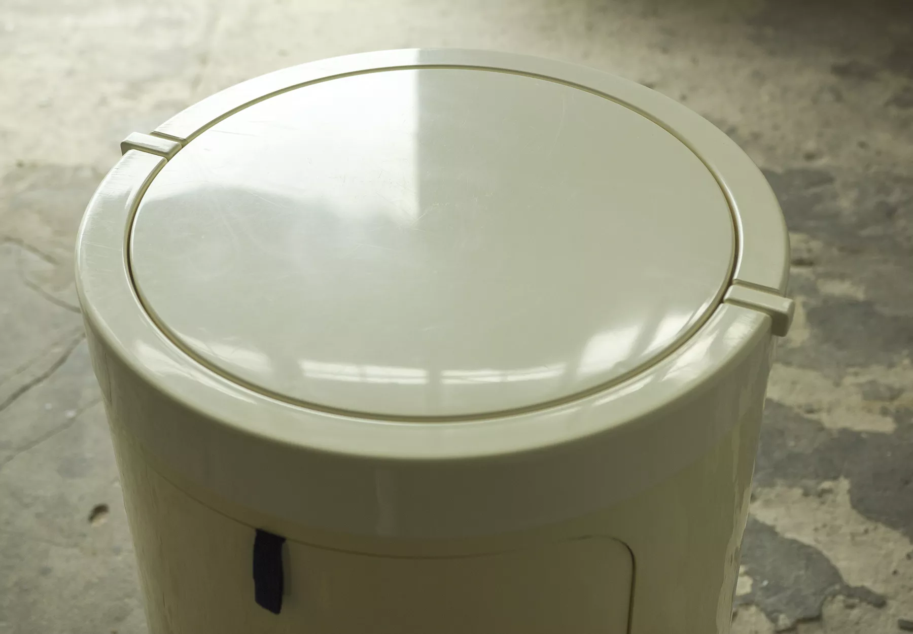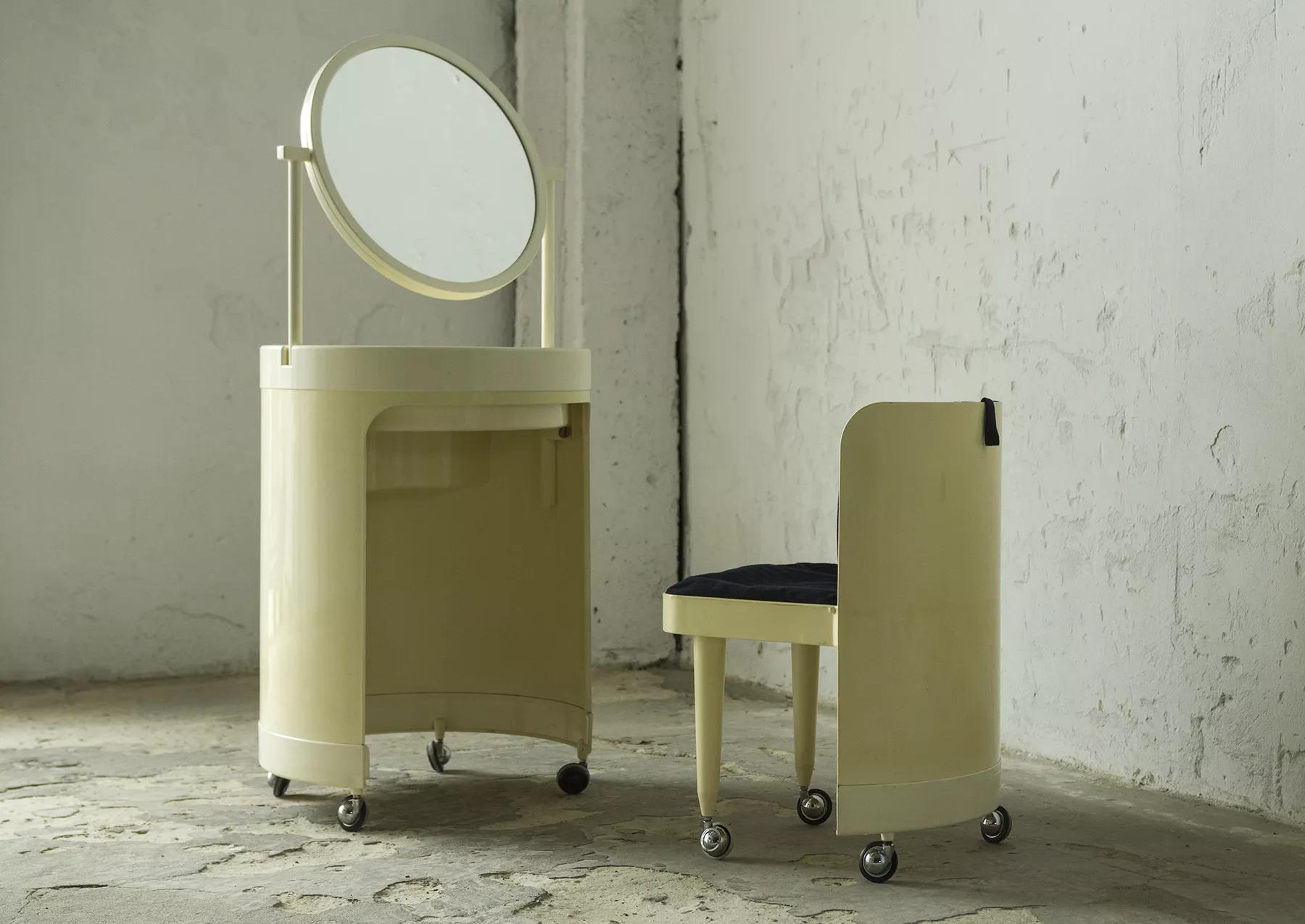 Wspaniały włoski projekt "Silvi" z lat 70-tych wyprodukowany przez Studio Kastilia. Plastikowa toaletka o kosmicznym designie w cylindrycznej obudowie na kółkach skrywa krzesło tapicerowane granatowym aksamitem i podnoszony blat z lustrem, które można regulować na trzech wysokościach i pod różnymi kątami. W środku znajdują się przegródki na różnego rodzaju akcesoria, natomiast tylna część jest wystarczająco głęboka, żeby pomieścić większe przedmioty. Jest to niezwykle rzadki i stylowy mebel zachowany w oryginalnym i bardzo dobrym stanie.
