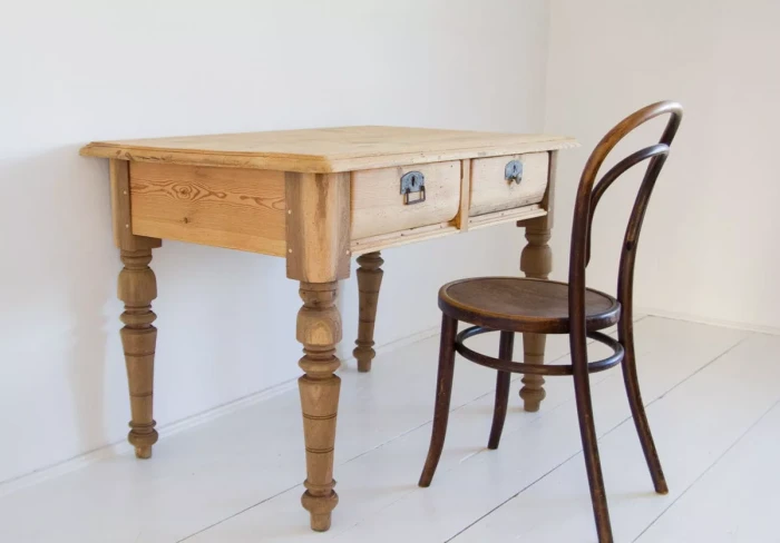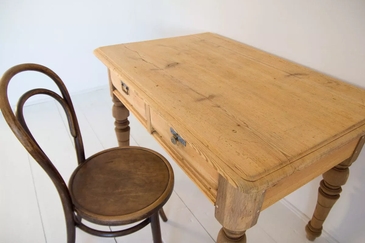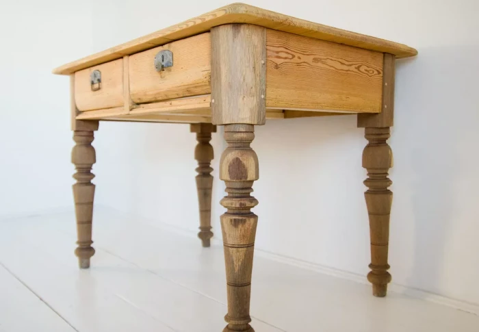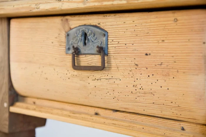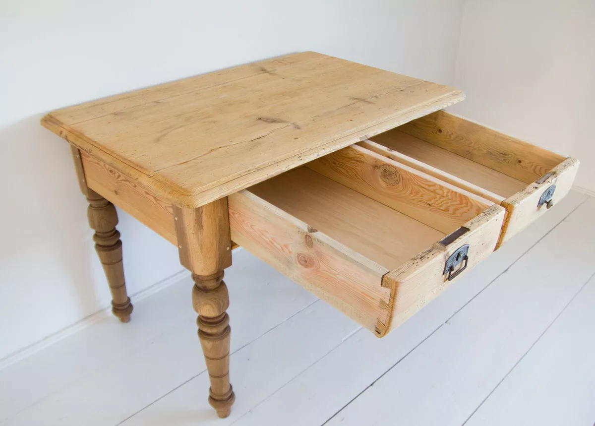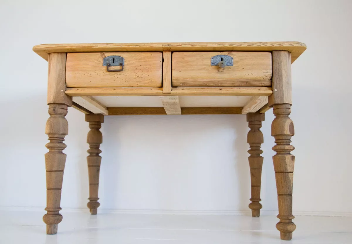 Przepiękny łaciaty stolik, który doczekał się swojego drugiego życia. Wykonany z drewna dębowego (toczone nogi) reszta elementów sosnowa. Zostały wymienione szuflady na nowe i prowadnice. Mebel posiada normalne ślady użytkowania, które zapisały się na drewnie w postaci rys, zadrapań i delikatnych wgnieceń, są też liczne otwory po nieaktywnych kornikach, ale nie ma to wpływu na użytkowanie. Drewno jest suche i bez zawilgocenia, cała konstrukcja jest bardzo stabilna. Stół ma surowe wykończenie, jest gotowy do użytku lub indywidualnego wykończenia, na tym etapie można jeszcze zmienić odcień lub pozostawić tak jak jest.