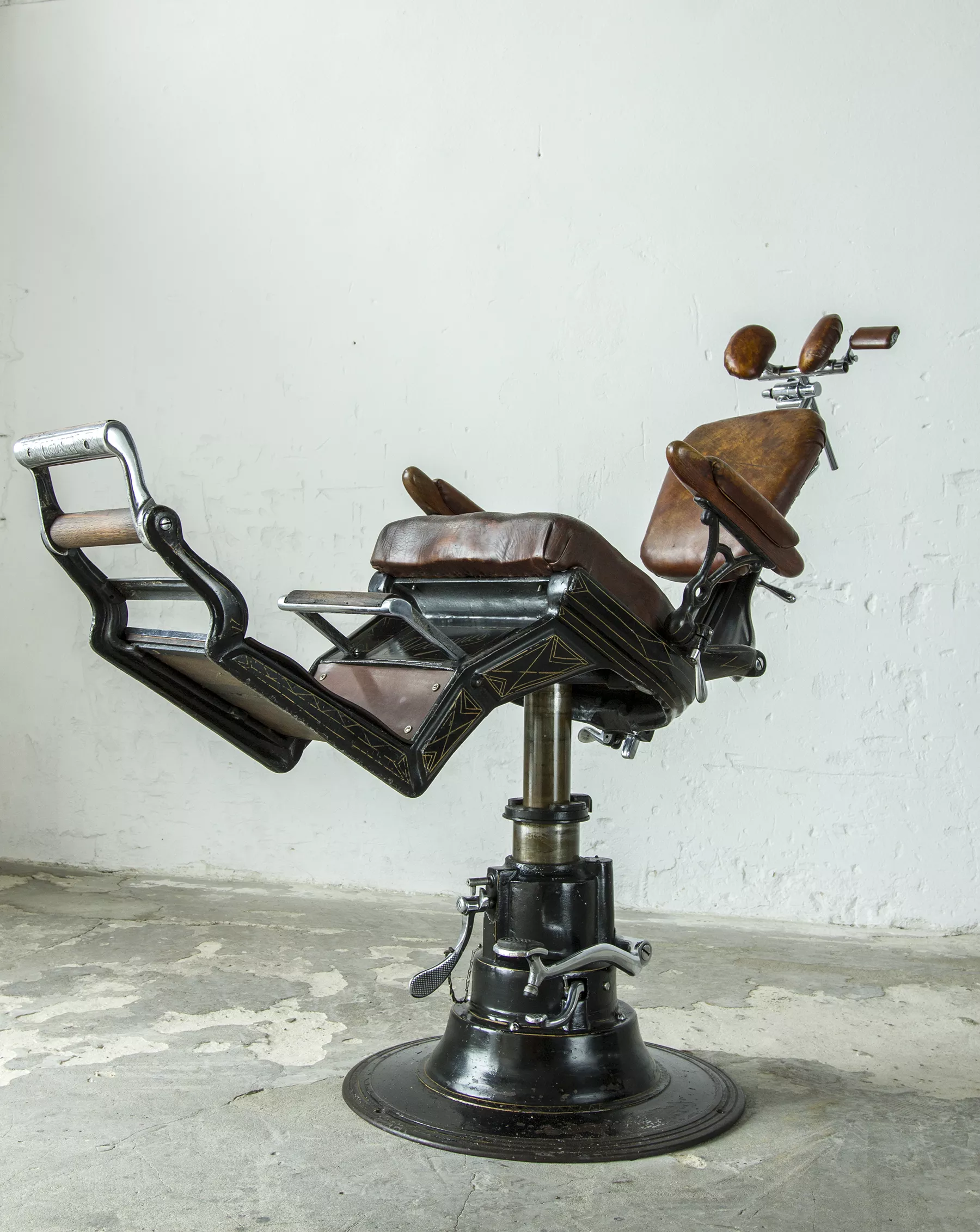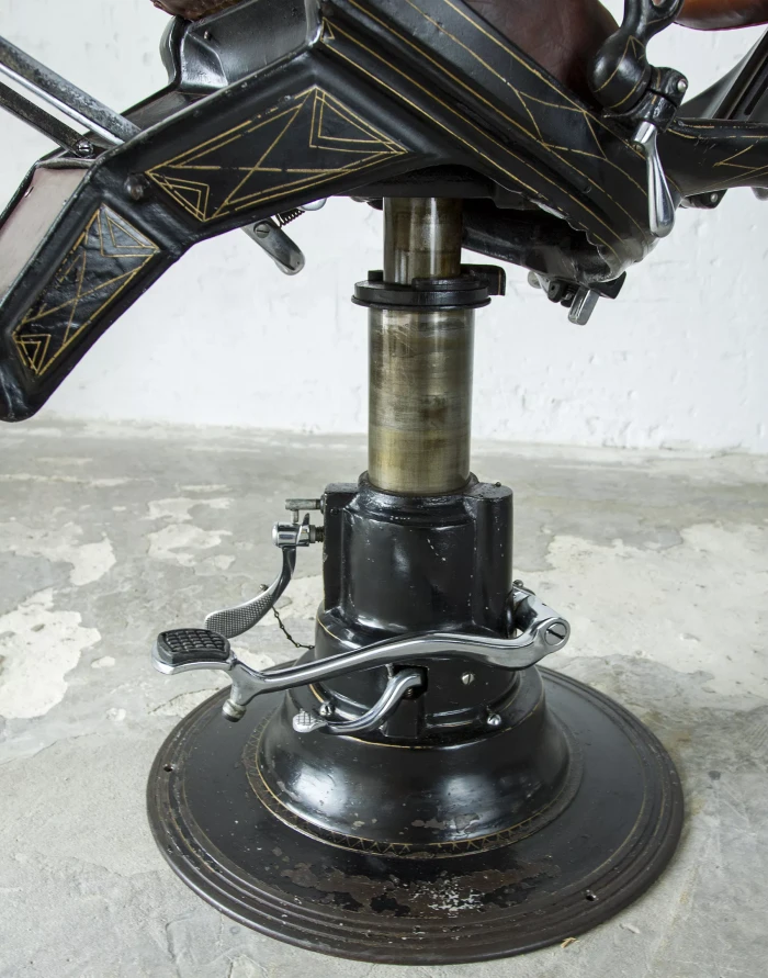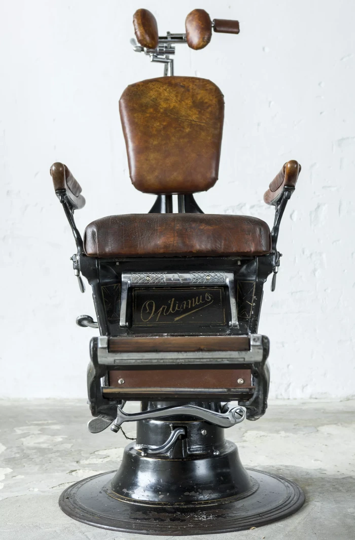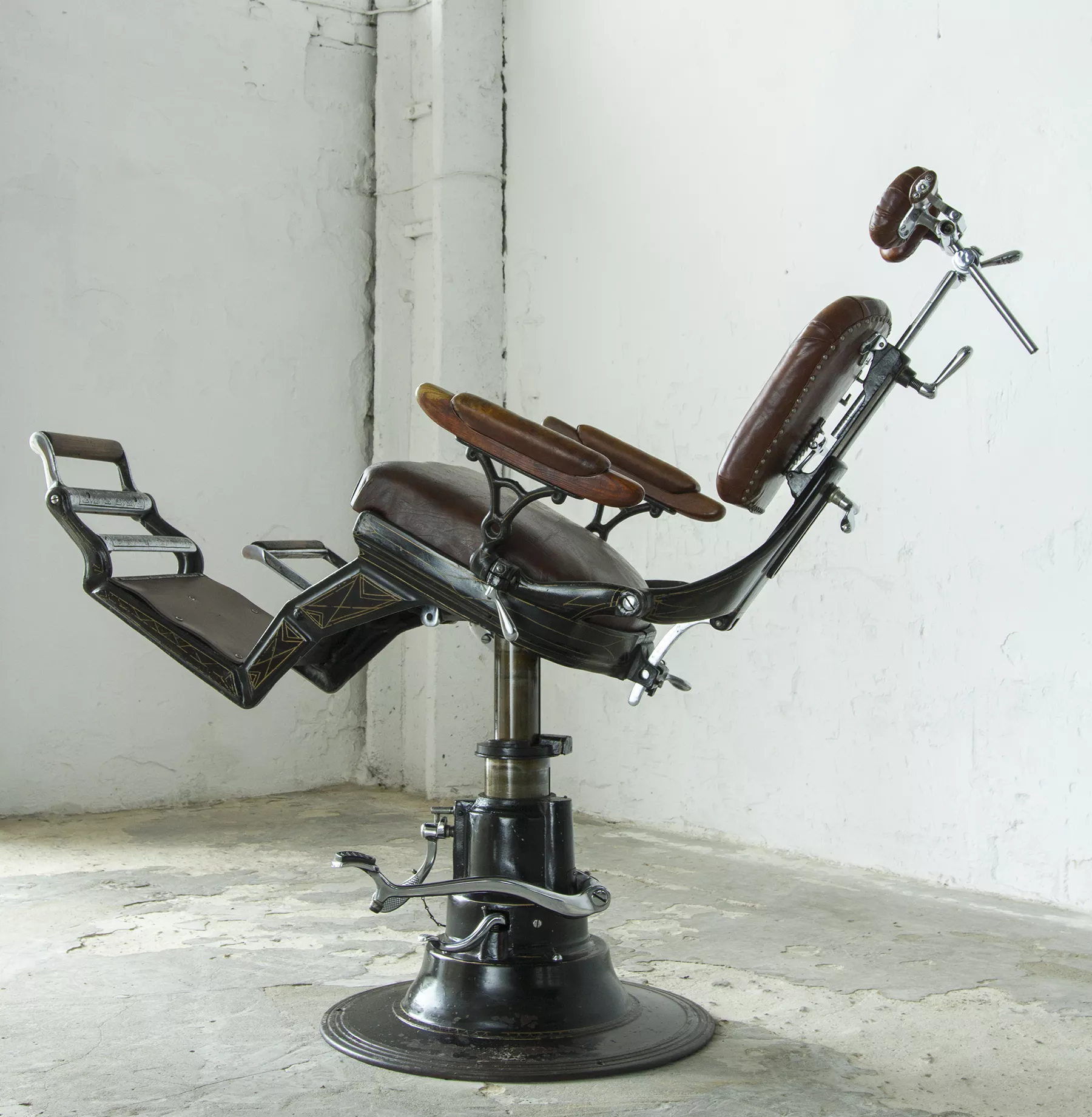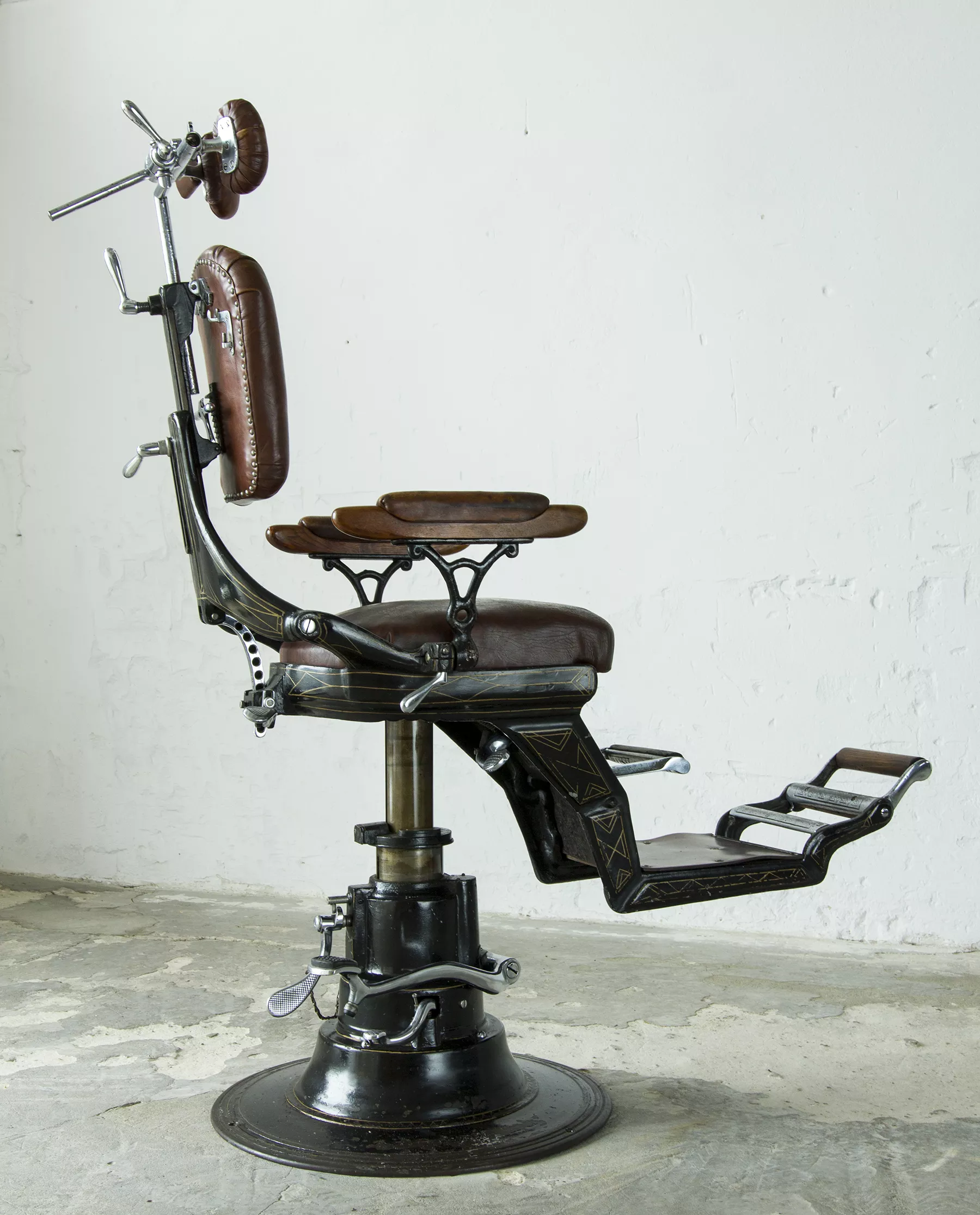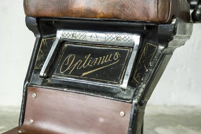 Unikatowy egzemplarz zabytkowego fotela dentystycznego z lat 20.XX wieku. Reprezentuje przełomowy moment w historii stomatologii, gdy ergonomia i funkcjonalność zaczęły odgrywać kluczową rolę w projektowaniu wyposażenia gabinetów. Łączący również kunszt rzemieślniczy, industrialny charakter i wyjątkową wartość historyczną. Styl art deco, popularny w latach 20., wpływał na wzornictwo, co przejawiało się w geometrycznych kształtach, symetrii i wykorzystaniu luksusowych materiałów. Elementy takie jak chromowane detale, lakierowane drewno czy elegancka tapicerka były standardem. Brak numerów seryjnych oczywiście ogranicza identyfikację, ale bazując na konstrukcji, stylistyce, napisach oraz kontekście historycznym, można wysnuć kilka mocnych przypuszczeń co do pochodzenia fotela. Bogato zdobione konstrukcje są bardzo charakterystyczne dla amerykańskich i niemieckich foteli dentystycznych z lat 1880–1930. Firmy takie jak Kochs, Ritter Dental, SS White (USA) oraz KaVo, Siemens-Reiniger (Niemcy) wytwarzały podobnie wyglądające egzemplarze. Na froncie siedziska zachował się bardzo dobrze napis " OPTIMUS ", marka ta była znana z produkcji wysokiej jakości sprzętu medycznego i dentystycznego na początku XX wieku. Choć obecnie trudno znaleźć szczegółowe informacje o firmie z tamtego okresu. Równie dobrze mogła to być nazwa handlowa dystrybutora lub serii. Obecność napisu „Cash & Sons” na chromowanym podnóżku sugeruje, że firma ta mogła być odpowiedzialna za produkcję całego fotela lub przynajmniej jego kluczowych komponentów. W tamtym okresie praktykowano współpracę między różnymi producentami, gdzie jedna firma dostarczała mechanizmy, a inna zajmowała się montażem końcowym i sprzedażą pod własną marką. Cash & Sons to firma działająca w Wielkiej Brytanii na przełomie XIX i XX wieku, specjalizująca się w produkcji sprzętu dentystycznego. Współpracowała z renomowanymi firmami takimi jak Claudius Ash & Sons, które były znane z produkcji wysokiej jakości narzędzi i mebli dentystycznych. Fotel zachowany jest w oryginalnym i bardzo dobrym stanie, wraz ze skórzaną tapicerką i misternie ręcznie malowanymi przepięknymi detalami. Jest to w pełni metalowa konstrukcja wsparta na żeliwnej podstawie, hydrauliczne mechanizmy podnoszenia i odchylania działają do dziś, potwierdzając niezawodność dawnego rzemiosła. Takie egzemplarze to dziś rzadkość – jest to połączenie sztuki użytkowej, historii medycyny i industrialnego piękna. Prawdziwa gratka dla kolekcjonerów, miłośników designu retro i pasjonatów techniki z epoki art deco.