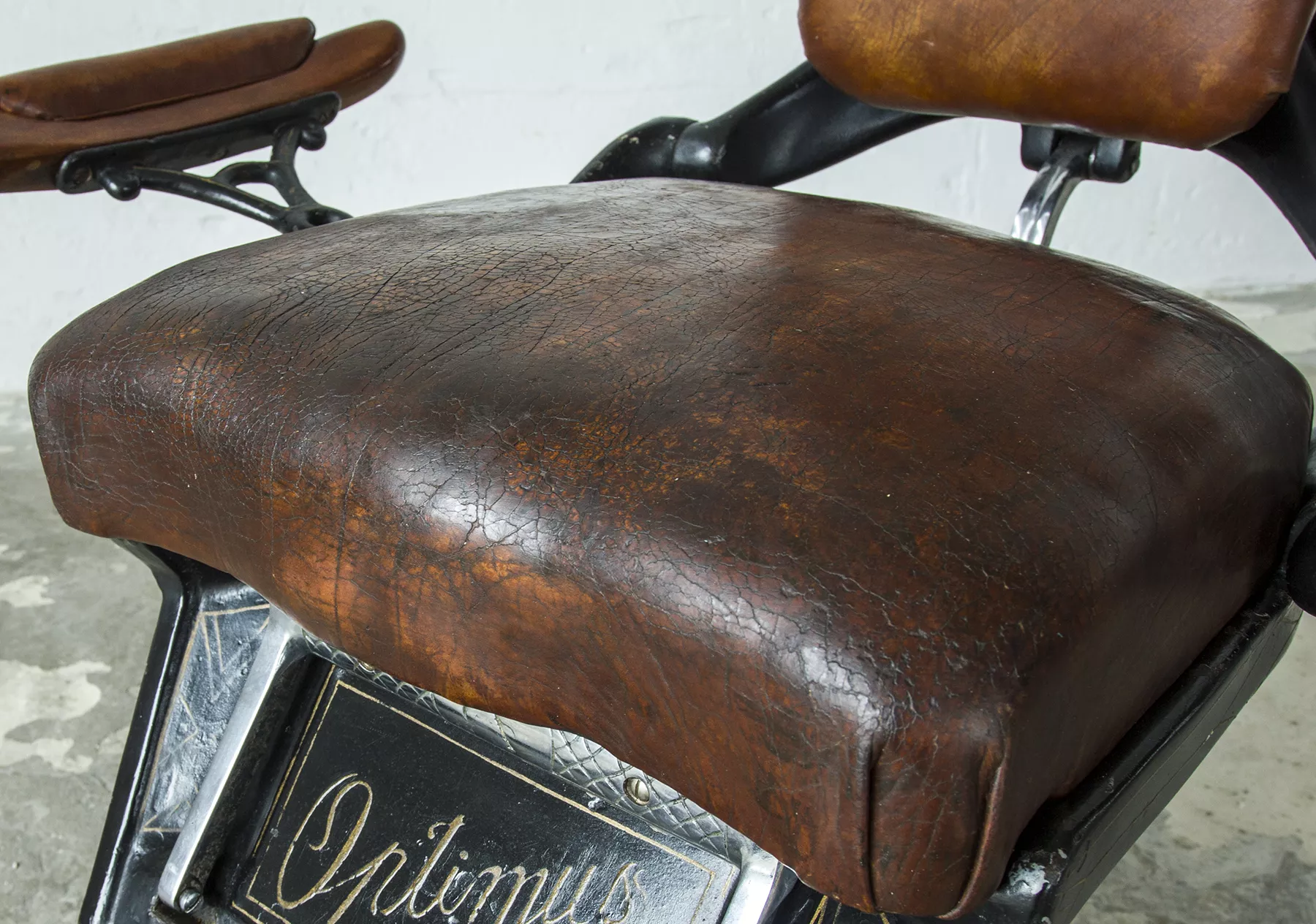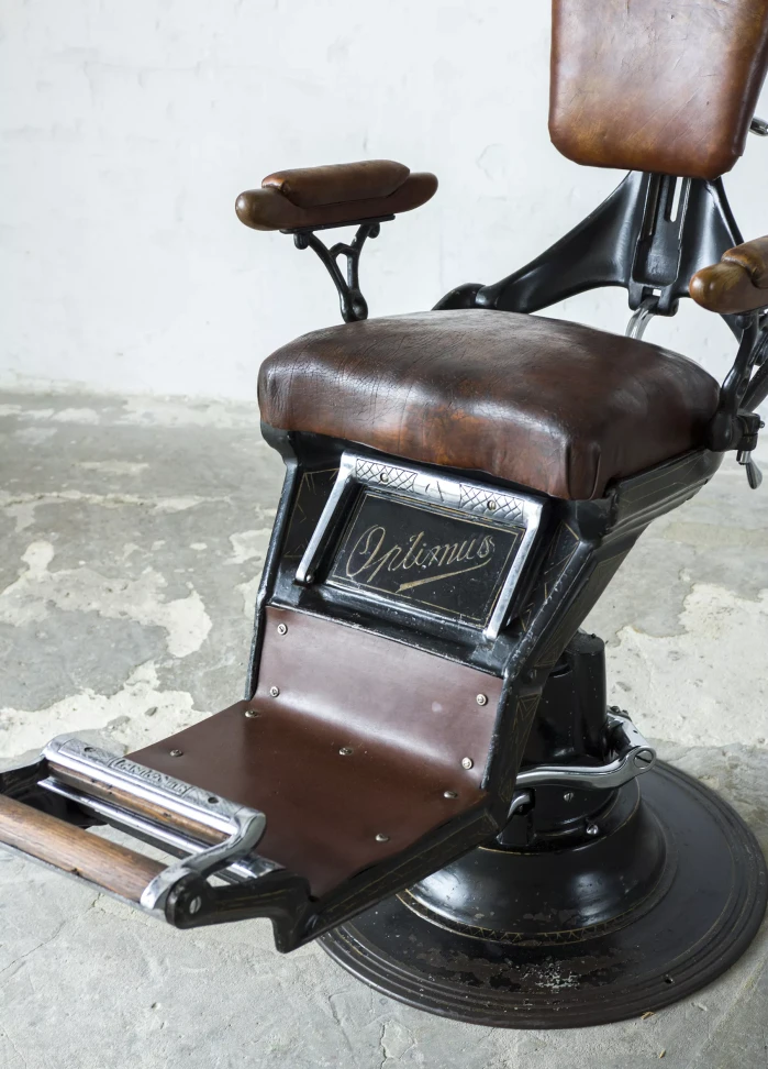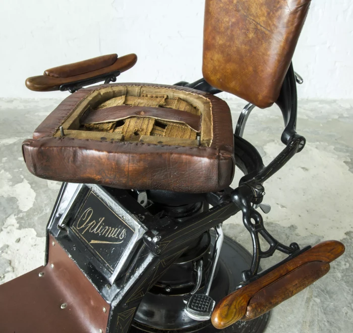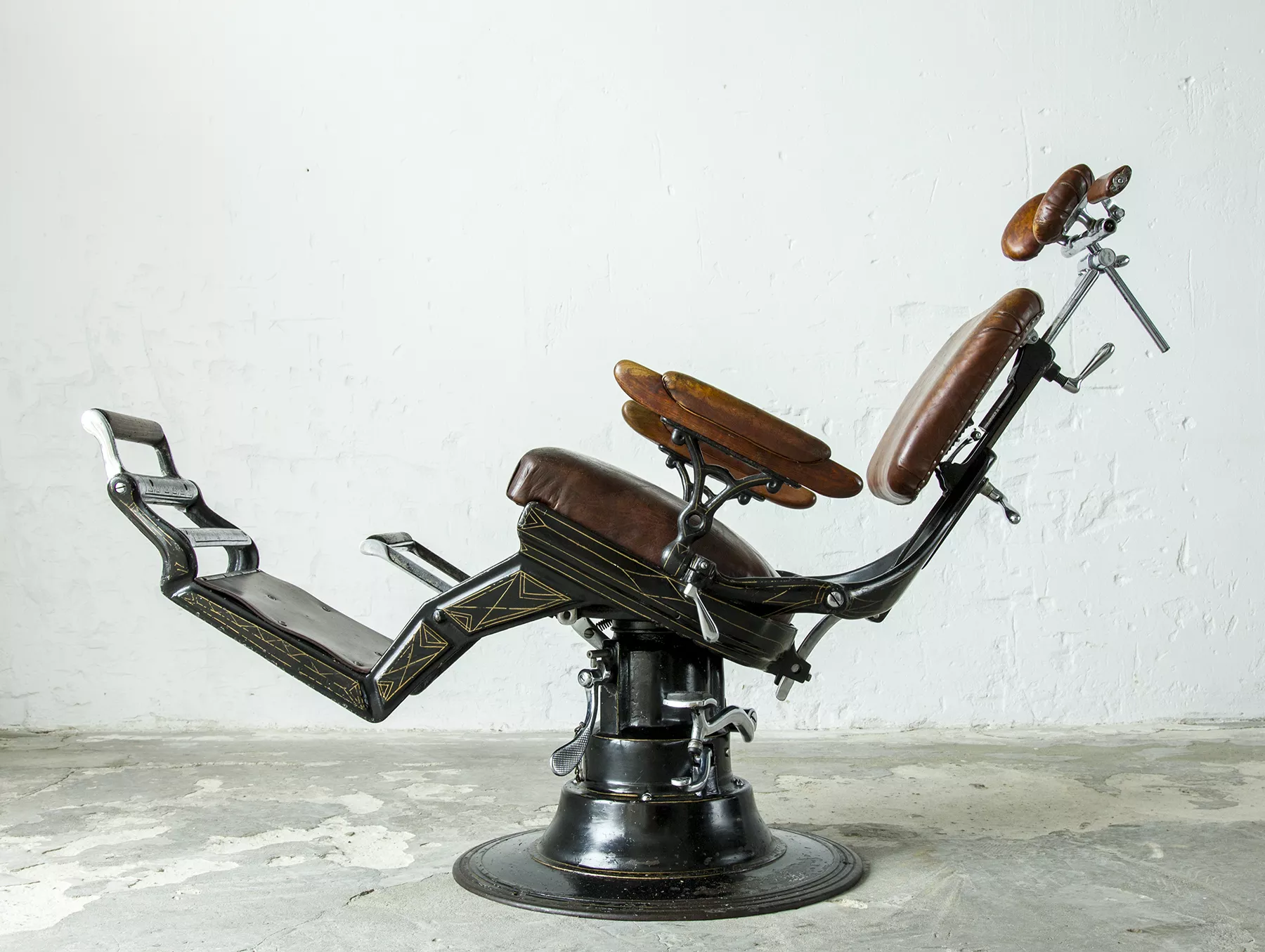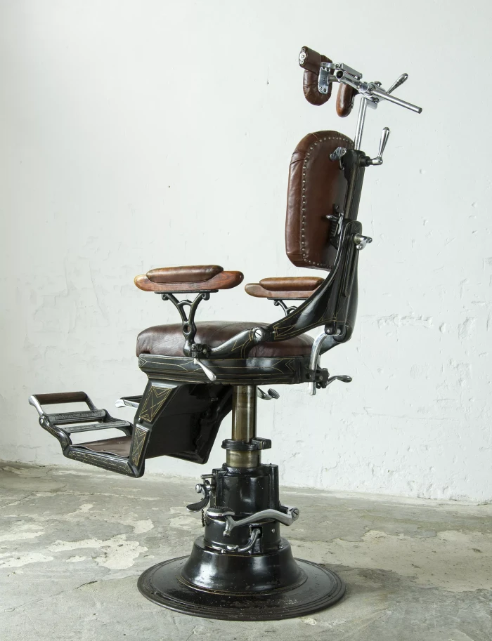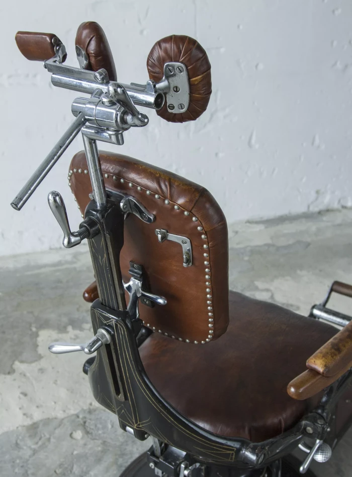 Unikatowy egzemplarz zabytkowego fotela dentystycznego z lat 20.XX wieku. Reprezentuje przełomowy moment w historii stomatologii, gdy ergonomia i funkcjonalność zaczęły odgrywać kluczową rolę w projektowaniu wyposażenia gabinetów. Łączący również kunszt rzemieślniczy, industrialny charakter i wyjątkową wartość historyczną. Styl art deco, popularny w latach 20., wpływał na wzornictwo, co przejawiało się w geometrycznych kształtach, symetrii i wykorzystaniu luksusowych materiałów. Elementy takie jak chromowane detale, lakierowane drewno czy elegancka tapicerka były standardem. Brak numerów seryjnych oczywiście ogranicza identyfikację, ale bazując na konstrukcji, stylistyce, napisach oraz kontekście historycznym, można wysnuć kilka mocnych przypuszczeń co do pochodzenia fotela. Bogato zdobione konstrukcje są bardzo charakterystyczne dla amerykańskich i niemieckich foteli dentystycznych z lat 1880–1930. Firmy takie jak Kochs, Ritter Dental, SS White (USA) oraz KaVo, Siemens-Reiniger (Niemcy) wytwarzały podobnie wyglądające egzemplarze. Na froncie siedziska zachował się bardzo dobrze napis " OPTIMUS ", marka ta była znana z produkcji wysokiej jakości sprzętu medycznego i dentystycznego na początku XX wieku. Choć obecnie trudno znaleźć szczegółowe informacje o firmie z tamtego okresu. Równie dobrze mogła to być nazwa handlowa dystrybutora lub serii. Obecność napisu „Cash & Sons” na chromowanym podnóżku sugeruje, że firma ta mogła być odpowiedzialna za produkcję całego fotela lub przynajmniej jego kluczowych komponentów. W tamtym okresie praktykowano współpracę między różnymi producentami, gdzie jedna firma dostarczała mechanizmy, a inna zajmowała się montażem końcowym i sprzedażą pod własną marką. Cash & Sons to firma działająca w Wielkiej Brytanii na przełomie XIX i XX wieku, specjalizująca się w produkcji sprzętu dentystycznego. Współpracowała z renomowanymi firmami takimi jak Claudius Ash & Sons, które były znane z produkcji wysokiej jakości narzędzi i mebli dentystycznych. Fotel zachowany jest w oryginalnym i bardzo dobrym stanie, wraz ze skórzaną tapicerką i misternie ręcznie malowanymi przepięknymi detalami. Jest to w pełni metalowa konstrukcja wsparta na żeliwnej podstawie, hydrauliczne mechanizmy podnoszenia i odchylania działają do dziś, potwierdzając niezawodność dawnego rzemiosła. Takie egzemplarze to dziś rzadkość – jest to połączenie sztuki użytkowej, historii medycyny i industrialnego piękna. Prawdziwa gratka dla kolekcjonerów, miłośników designu retro i pasjonatów techniki z epoki art deco.