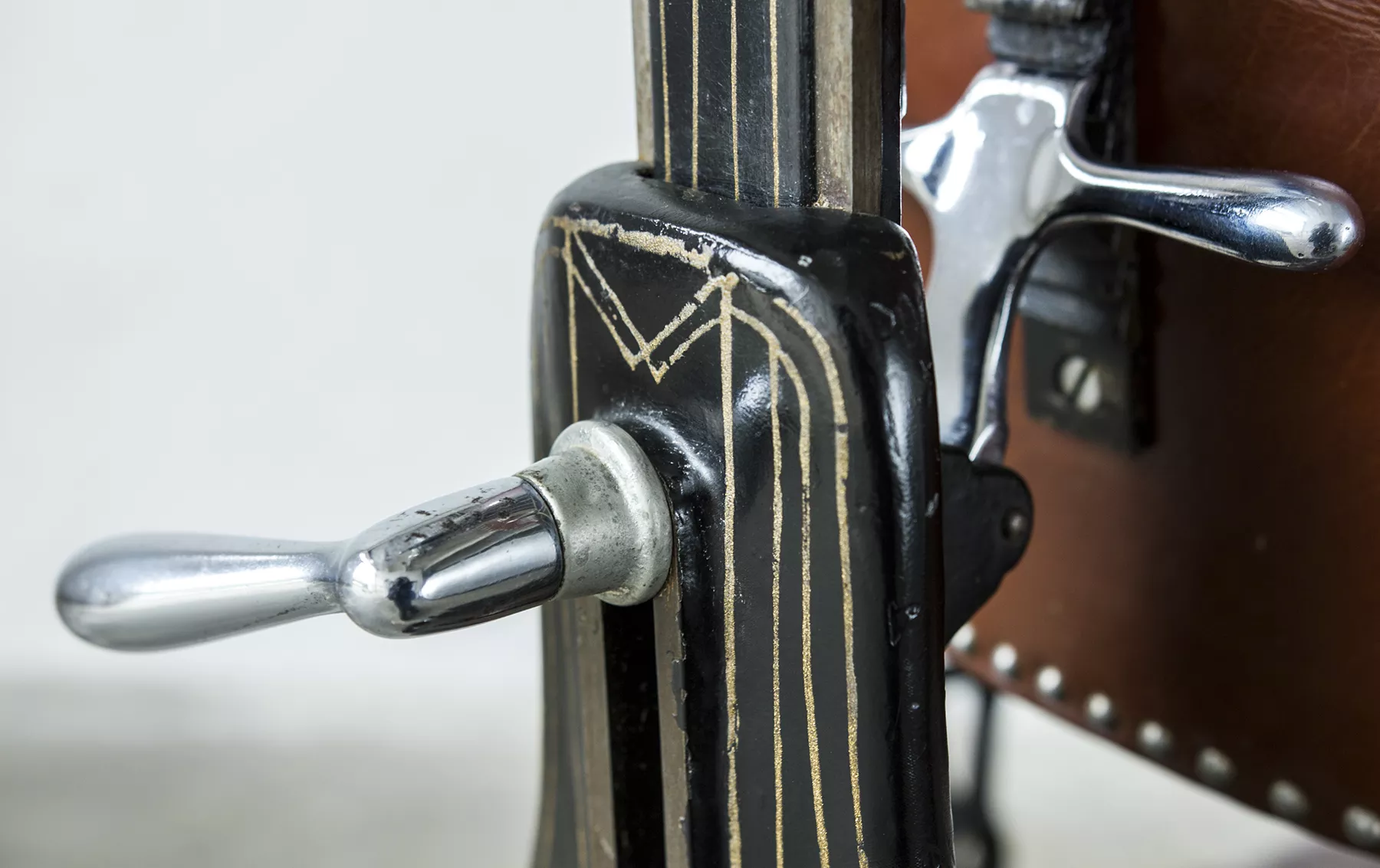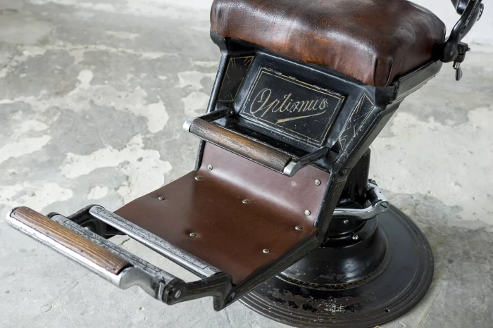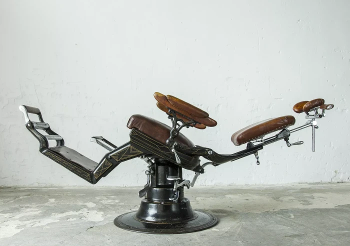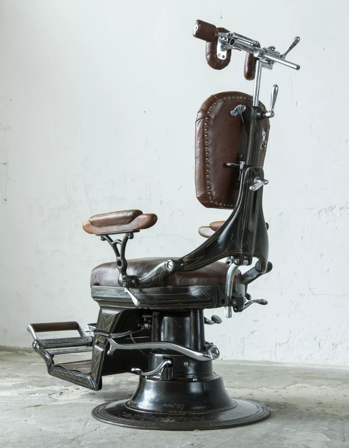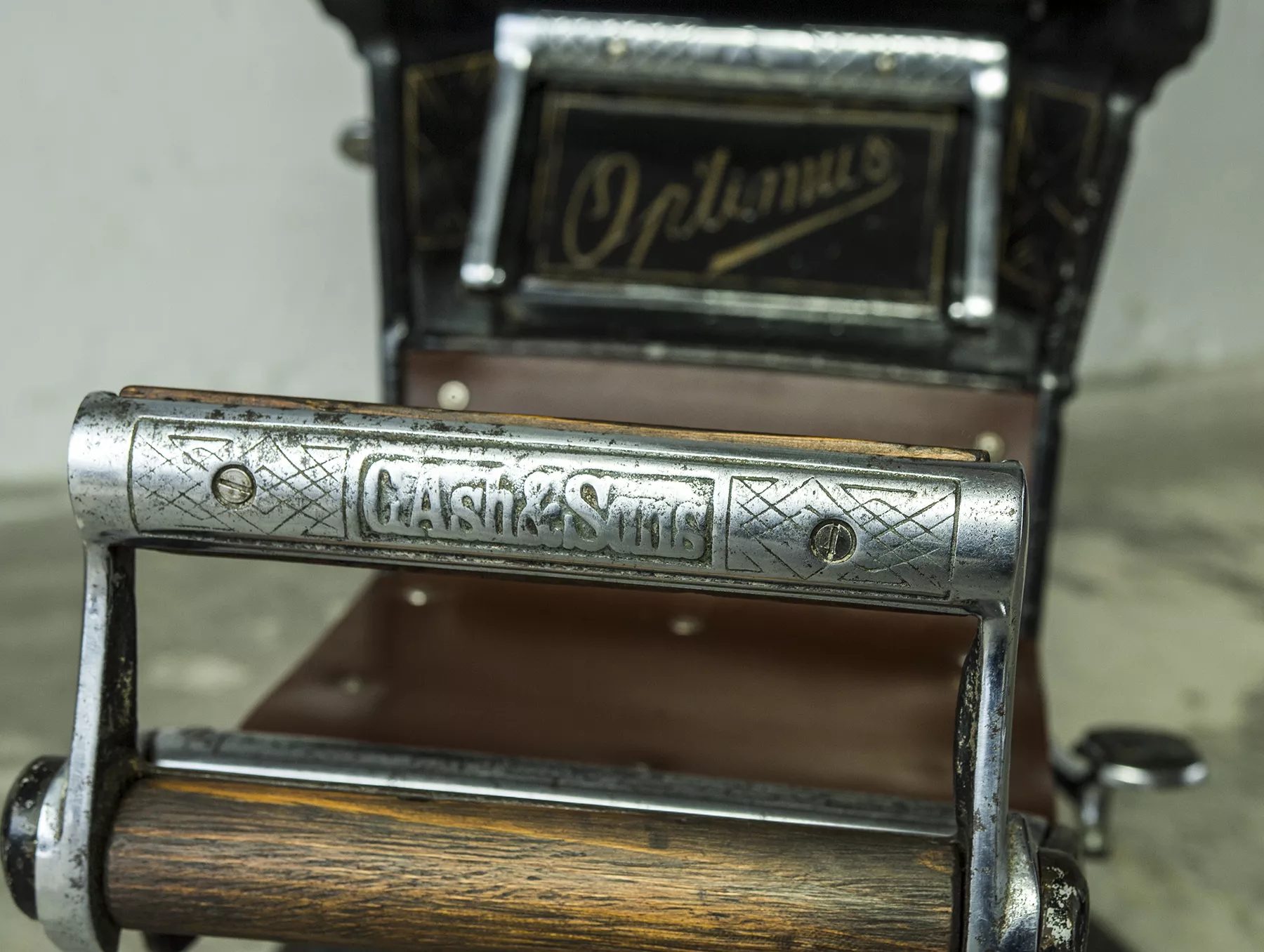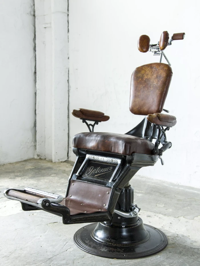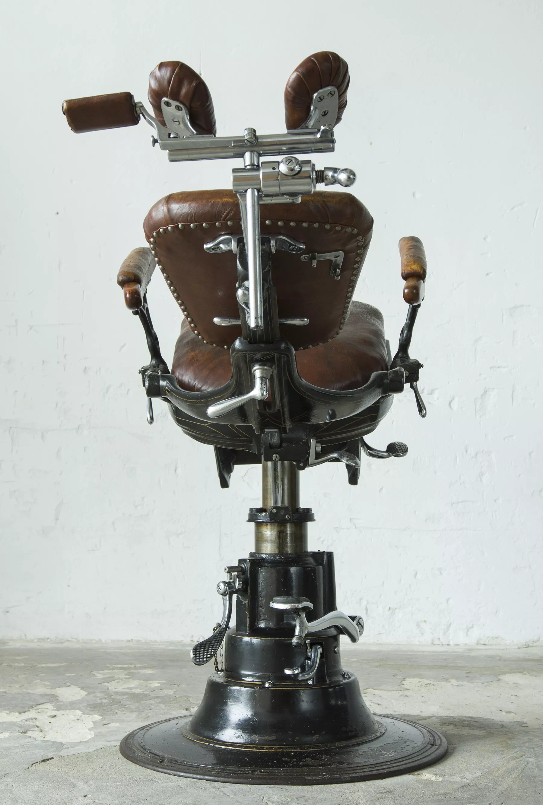Unikatowy egzemplarz zabytkowego fotela dentystycznego z lat 20.XX wieku. Reprezentuje przełomowy moment w historii stomatologii, gdy ergonomia i funkcjonalność zaczęły odgrywać kluczową rolę w projektowaniu wyposażenia gabinetów. Łączący również kunszt rzemieślniczy, industrialny charakter i wyjątkową wartość historyczną. Styl art deco, popularny w latach 20., wpływał na wzornictwo, co przejawiało się w geometrycznych kształtach, symetrii i wykorzystaniu luksusowych materiałów. Elementy takie jak chromowane detale, lakierowane drewno czy elegancka tapicerka były standardem. Brak numerów seryjnych oczywiście ogranicza identyfikację, ale bazując na konstrukcji, stylistyce, napisach oraz kontekście historycznym, można wysnuć kilka mocnych przypuszczeń co do pochodzenia fotela. Bogato zdobione konstrukcje są bardzo charakterystyczne dla amerykańskich i niemieckich foteli dentystycznych z lat 1880–1930. Firmy takie jak Kochs, Ritter Dental, SS White (USA) oraz KaVo, Siemens-Reiniger (Niemcy) wytwarzały podobnie wyglądające egzemplarze. Na froncie siedziska zachował się bardzo dobrze napis " OPTIMUS ", marka ta była znana z produkcji wysokiej jakości sprzętu medycznego i dentystycznego na początku XX wieku. Choć obecnie trudno znaleźć szczegółowe informacje o firmie z tamtego okresu. Równie dobrze mogła to być nazwa handlowa dystrybutora lub serii. Obecność napisu „Cash & Sons” na chromowanym podnóżku sugeruje, że firma ta mogła być odpowiedzialna za produkcję całego fotela lub przynajmniej jego kluczowych komponentów. W tamtym okresie praktykowano współpracę między różnymi producentami, gdzie jedna firma dostarczała mechanizmy, a inna zajmowała się montażem końcowym i sprzedażą pod własną marką. Cash & Sons to firma działająca w Wielkiej Brytanii na przełomie XIX i XX wieku, specjalizująca się w produkcji sprzętu dentystycznego. Współpracowała z renomowanymi firmami takimi jak Claudius Ash & Sons, które były znane z produkcji wysokiej jakości narzędzi i mebli dentystycznych. Fotel zachowany jest w oryginalnym i bardzo dobrym stanie, wraz ze skórzaną tapicerką i misternie ręcznie malowanymi przepięknymi detalami. Jest to w pełni metalowa konstrukcja wsparta na żeliwnej podstawie, hydrauliczne mechanizmy podnoszenia i odchylania działają do dziś, potwierdzając niezawodność dawnego rzemiosła. Takie egzemplarze to dziś rzadkość – jest to połączenie sztuki użytkowej, historii medycyny i industrialnego piękna. Prawdziwa gratka dla kolekcjonerów, miłośników designu retro i pasjonatów techniki z epoki art deco.