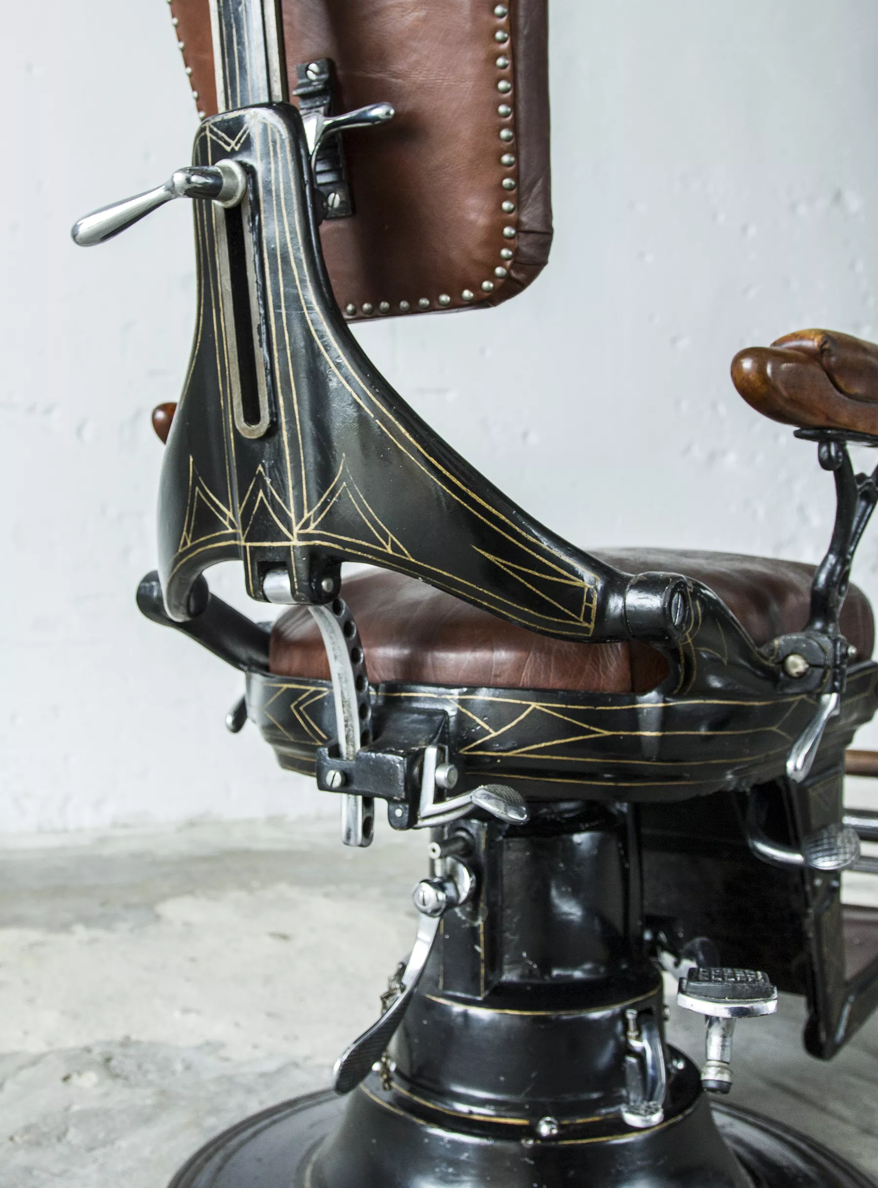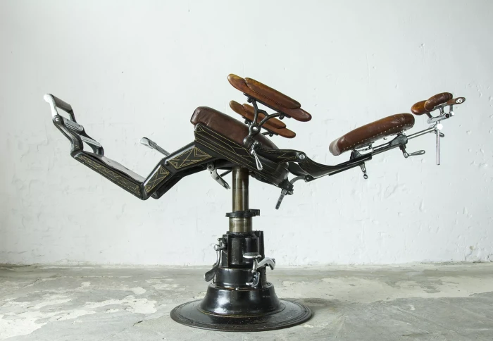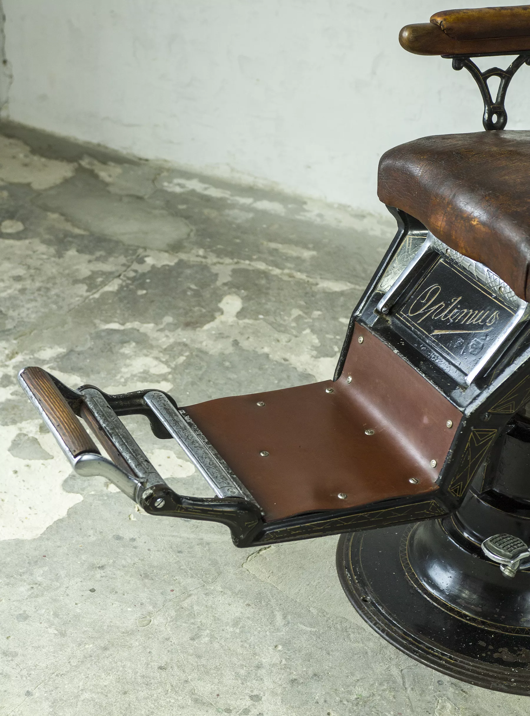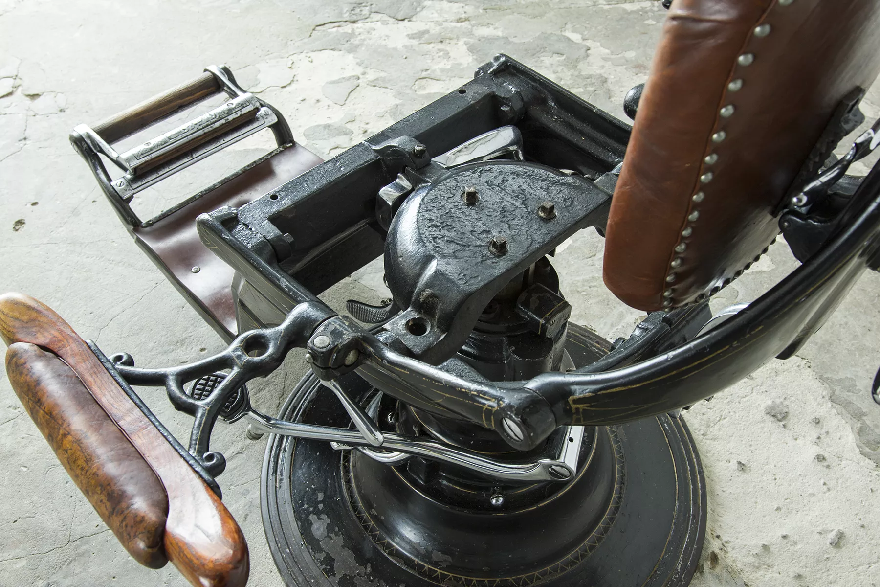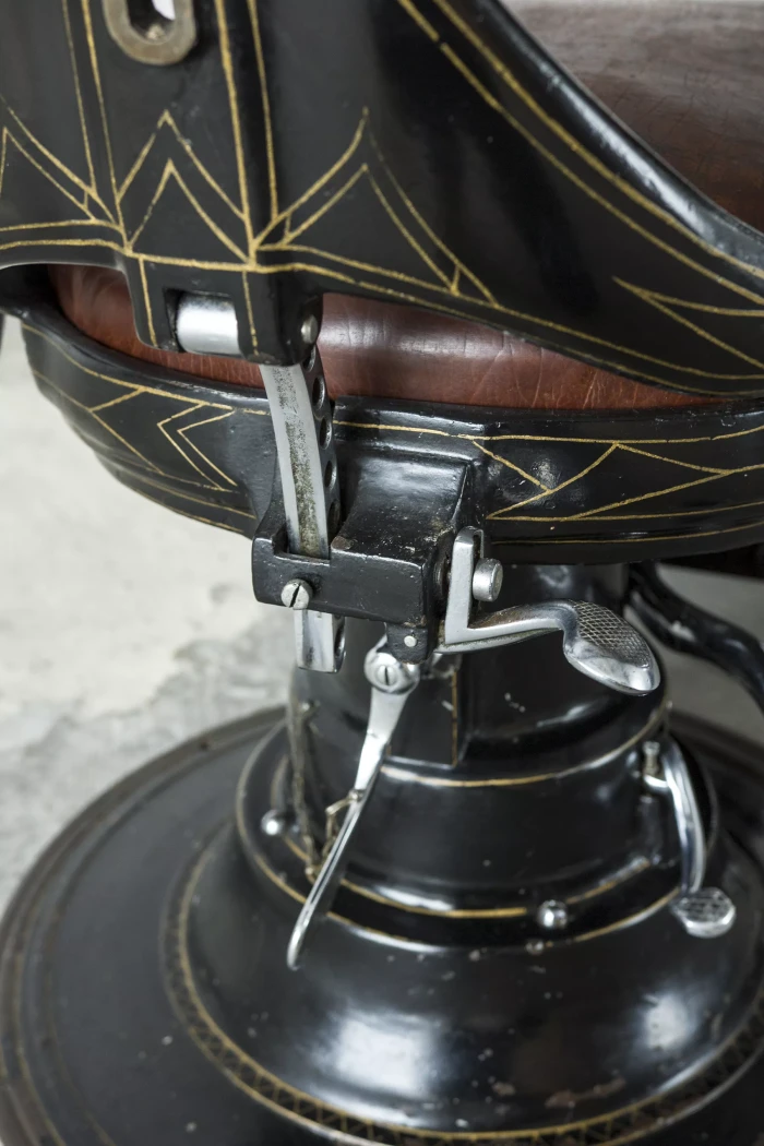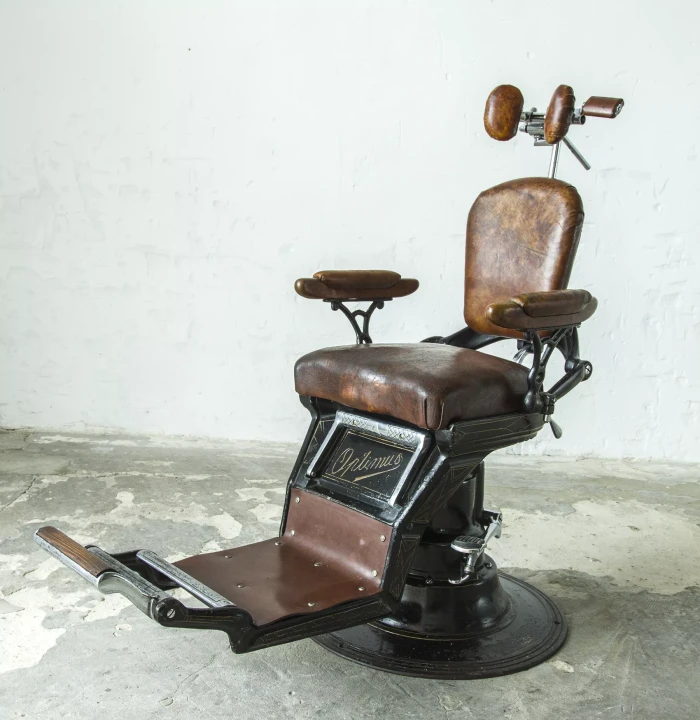 Unikatowy egzemplarz zabytkowego fotela dentystycznego z lat 20.XX wieku. Reprezentuje przełomowy moment w historii stomatologii, gdy ergonomia i funkcjonalność zaczęły odgrywać kluczową rolę w projektowaniu wyposażenia gabinetów. Łączący również kunszt rzemieślniczy, industrialny charakter i wyjątkową wartość historyczną. Styl art deco, popularny w latach 20., wpływał na wzornictwo, co przejawiało się w geometrycznych kształtach, symetrii i wykorzystaniu luksusowych materiałów. Elementy takie jak chromowane detale, lakierowane drewno czy elegancka tapicerka były standardem. Brak numerów seryjnych oczywiście ogranicza identyfikację, ale bazując na konstrukcji, stylistyce, napisach oraz kontekście historycznym, można wysnuć kilka mocnych przypuszczeń co do pochodzenia fotela. Bogato zdobione konstrukcje są bardzo charakterystyczne dla amerykańskich i niemieckich foteli dentystycznych z lat 1880–1930. Firmy takie jak Kochs, Ritter Dental, SS White (USA) oraz KaVo, Siemens-Reiniger (Niemcy) wytwarzały podobnie wyglądające egzemplarze. Na froncie siedziska zachował się bardzo dobrze napis " OPTIMUS ", marka ta była znana z produkcji wysokiej jakości sprzętu medycznego i dentystycznego na początku XX wieku. Choć obecnie trudno znaleźć szczegółowe informacje o firmie z tamtego okresu. Równie dobrze mogła to być nazwa handlowa dystrybutora lub serii. Obecność napisu „Cash & Sons” na chromowanym podnóżku sugeruje, że firma ta mogła być odpowiedzialna za produkcję całego fotela lub przynajmniej jego kluczowych komponentów. W tamtym okresie praktykowano współpracę między różnymi producentami, gdzie jedna firma dostarczała mechanizmy, a inna zajmowała się montażem końcowym i sprzedażą pod własną marką. Cash & Sons to firma działająca w Wielkiej Brytanii na przełomie XIX i XX wieku, specjalizująca się w produkcji sprzętu dentystycznego. Współpracowała z renomowanymi firmami takimi jak Claudius Ash & Sons, które były znane z produkcji wysokiej jakości narzędzi i mebli dentystycznych. Fotel zachowany jest w oryginalnym i bardzo dobrym stanie, wraz ze skórzaną tapicerką i misternie ręcznie malowanymi przepięknymi detalami. Jest to w pełni metalowa konstrukcja wsparta na żeliwnej podstawie, hydrauliczne mechanizmy podnoszenia i odchylania działają do dziś, potwierdzając niezawodność dawnego rzemiosła. Takie egzemplarze to dziś rzadkość – jest to połączenie sztuki użytkowej, historii medycyny i industrialnego piękna. Prawdziwa gratka dla kolekcjonerów, miłośników designu retro i pasjonatów techniki z epoki art deco.