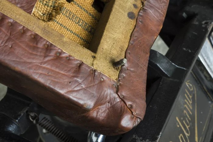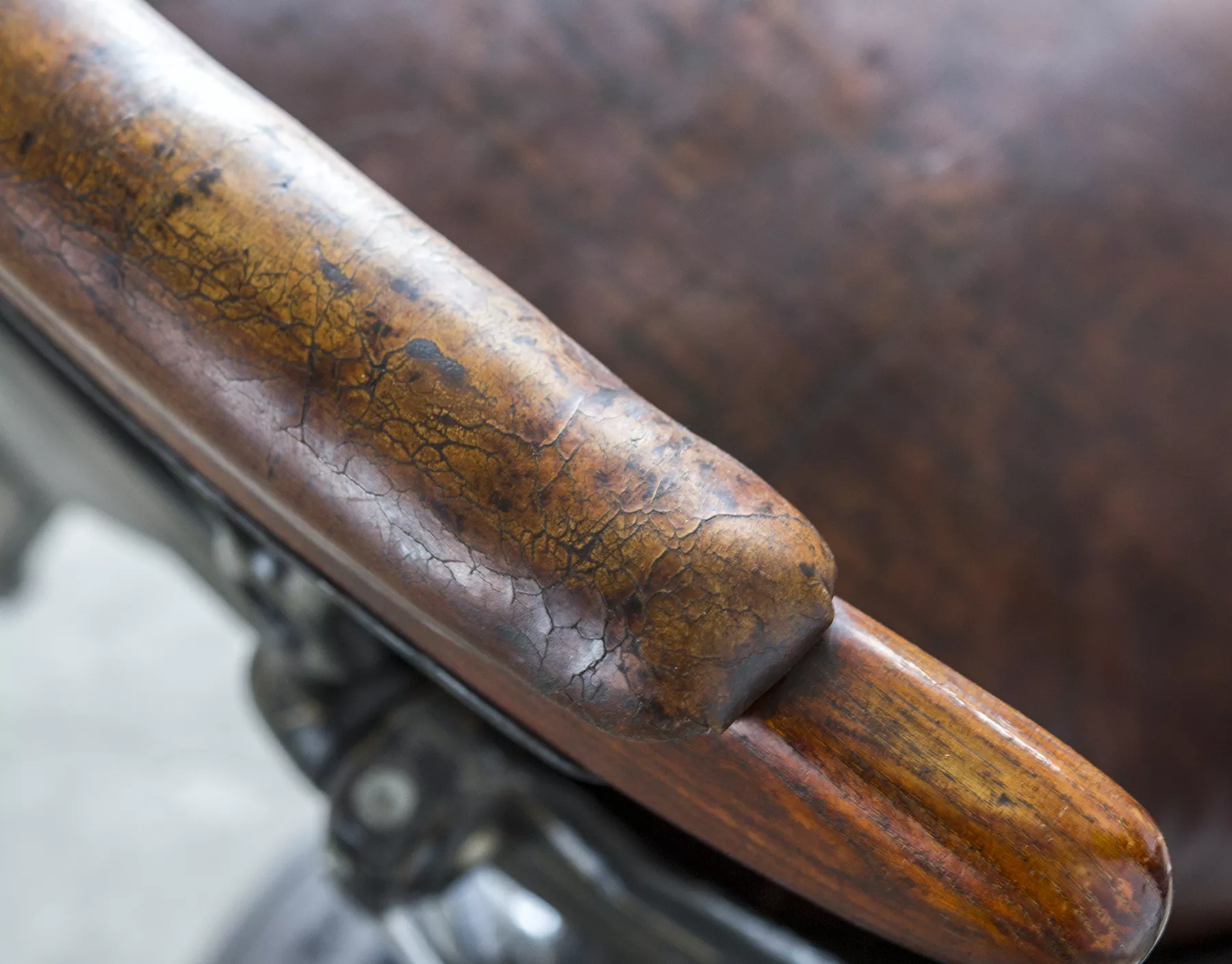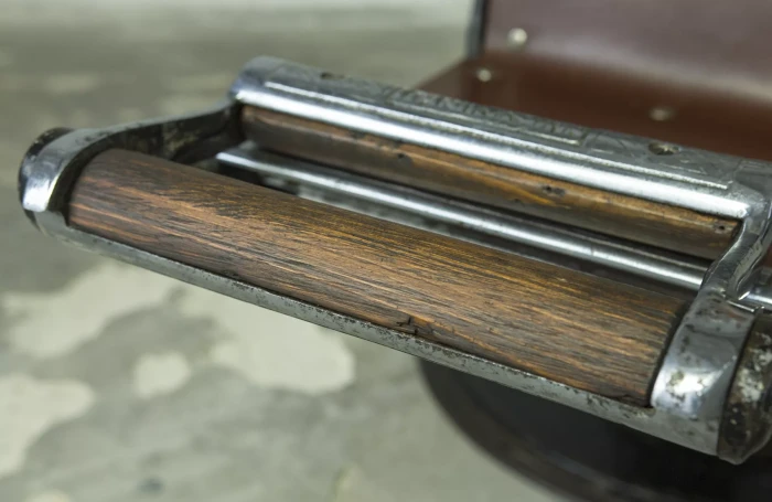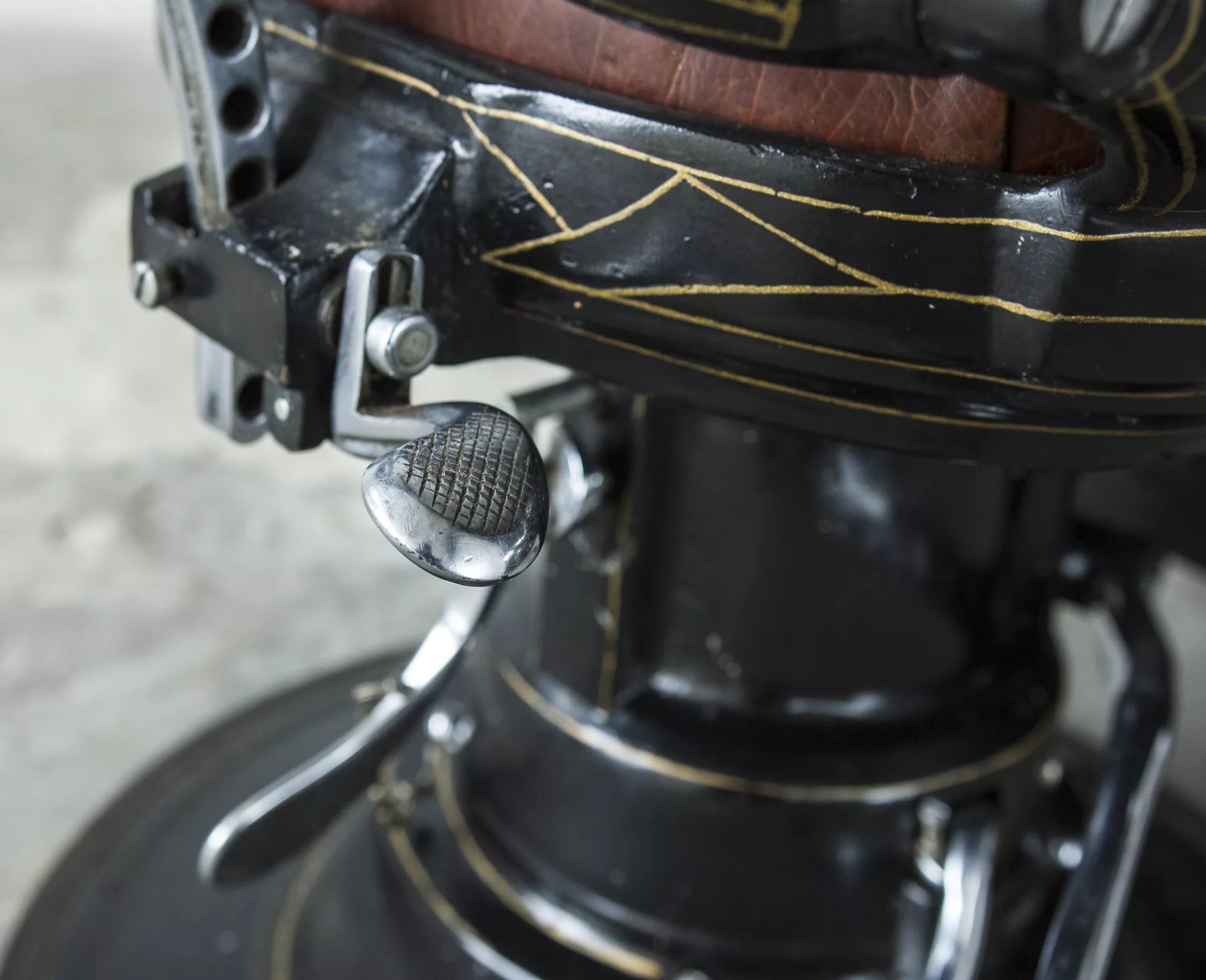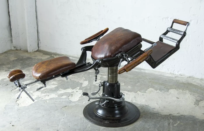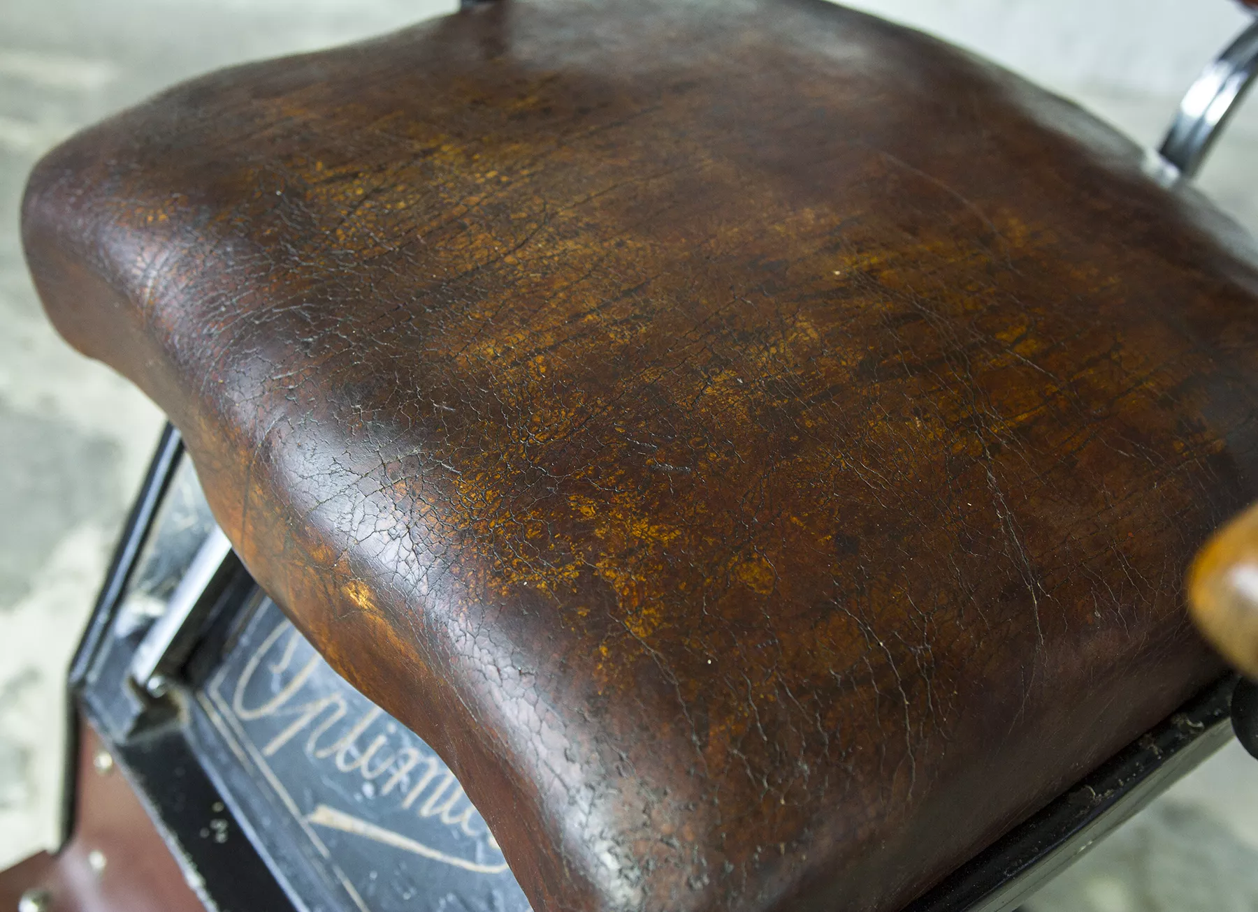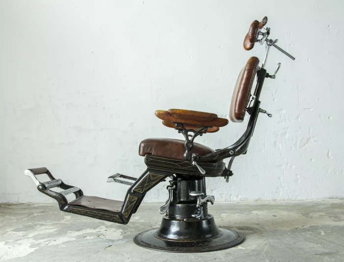 Unikatowy egzemplarz zabytkowego fotela dentystycznego z lat 20.XX wieku. Reprezentuje przełomowy moment w historii stomatologii, gdy ergonomia i funkcjonalność zaczęły odgrywać kluczową rolę w projektowaniu wyposażenia gabinetów. Łączący również kunszt rzemieślniczy, industrialny charakter i wyjątkową wartość historyczną. Styl art deco, popularny w latach 20., wpływał na wzornictwo, co przejawiało się w geometrycznych kształtach, symetrii i wykorzystaniu luksusowych materiałów. Elementy takie jak chromowane detale, lakierowane drewno czy elegancka tapicerka były standardem. Brak numerów seryjnych oczywiście ogranicza identyfikację, ale bazując na konstrukcji, stylistyce, napisach oraz kontekście historycznym, można wysnuć kilka mocnych przypuszczeń co do pochodzenia fotela. Bogato zdobione konstrukcje są bardzo charakterystyczne dla amerykańskich i niemieckich foteli dentystycznych z lat 1880–1930. Firmy takie jak Kochs, Ritter Dental, SS White (USA) oraz KaVo, Siemens-Reiniger (Niemcy) wytwarzały podobnie wyglądające egzemplarze. Na froncie siedziska zachował się bardzo dobrze napis " OPTIMUS ", marka ta była znana z produkcji wysokiej jakości sprzętu medycznego i dentystycznego na początku XX wieku. Choć obecnie trudno znaleźć szczegółowe informacje o firmie z tamtego okresu. Równie dobrze mogła to być nazwa handlowa dystrybutora lub serii. Obecność napisu „Cash & Sons” na chromowanym podnóżku sugeruje, że firma ta mogła być odpowiedzialna za produkcję całego fotela lub przynajmniej jego kluczowych komponentów. W tamtym okresie praktykowano współpracę między różnymi producentami, gdzie jedna firma dostarczała mechanizmy, a inna zajmowała się montażem końcowym i sprzedażą pod własną marką. Cash & Sons to firma działająca w Wielkiej Brytanii na przełomie XIX i XX wieku, specjalizująca się w produkcji sprzętu dentystycznego. Współpracowała z renomowanymi firmami takimi jak Claudius Ash & Sons, które były znane z produkcji wysokiej jakości narzędzi i mebli dentystycznych. Fotel zachowany jest w oryginalnym i bardzo dobrym stanie, wraz ze skórzaną tapicerką i misternie ręcznie malowanymi przepięknymi detalami. Jest to w pełni metalowa konstrukcja wsparta na żeliwnej podstawie, hydrauliczne mechanizmy podnoszenia i odchylania działają do dziś, potwierdzając niezawodność dawnego rzemiosła. Takie egzemplarze to dziś rzadkość – jest to połączenie sztuki użytkowej, historii medycyny i industrialnego piękna. Prawdziwa gratka dla kolekcjonerów, miłośników designu retro i pasjonatów techniki z epoki art deco.