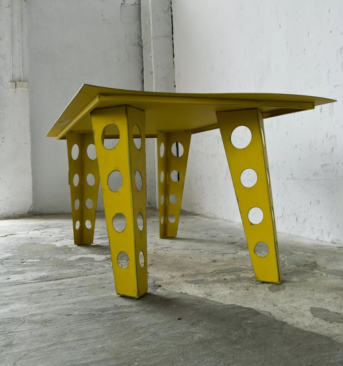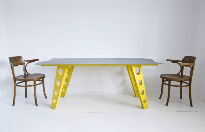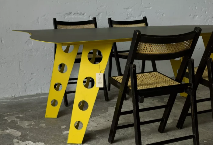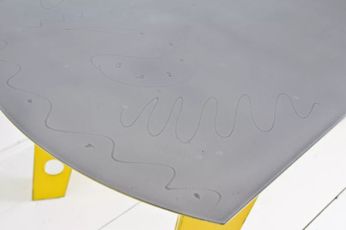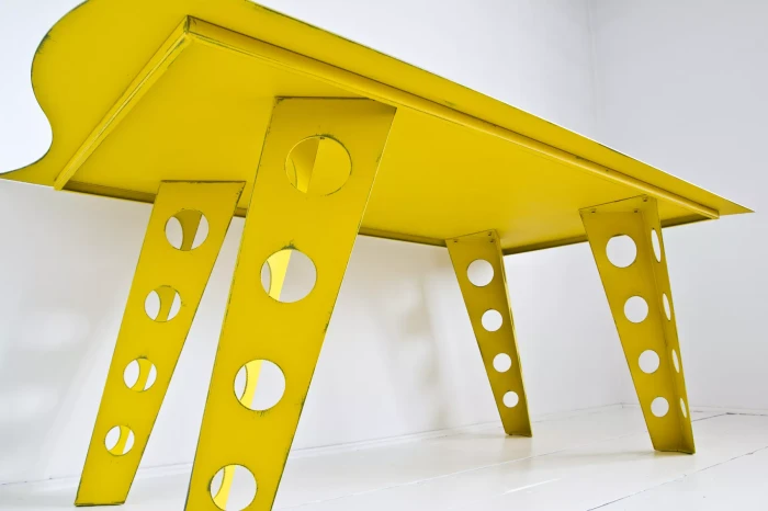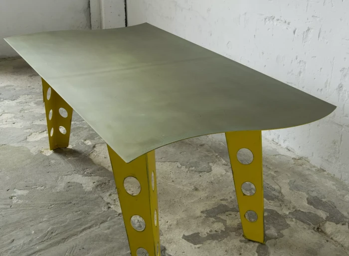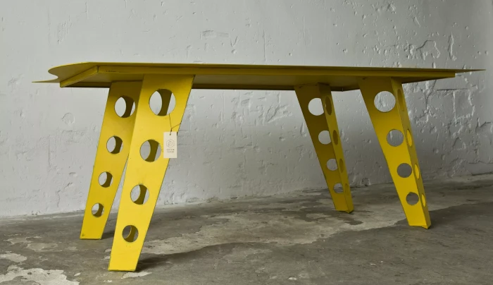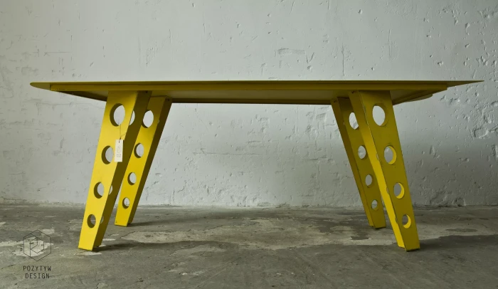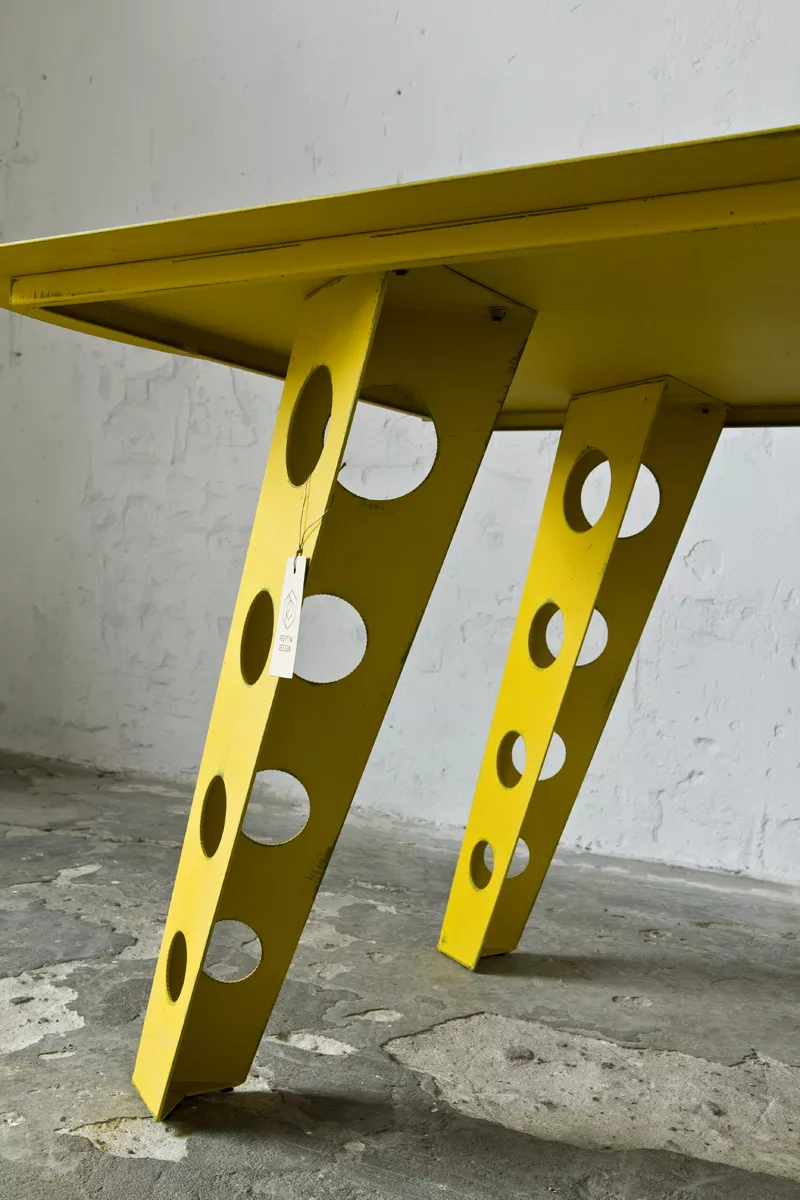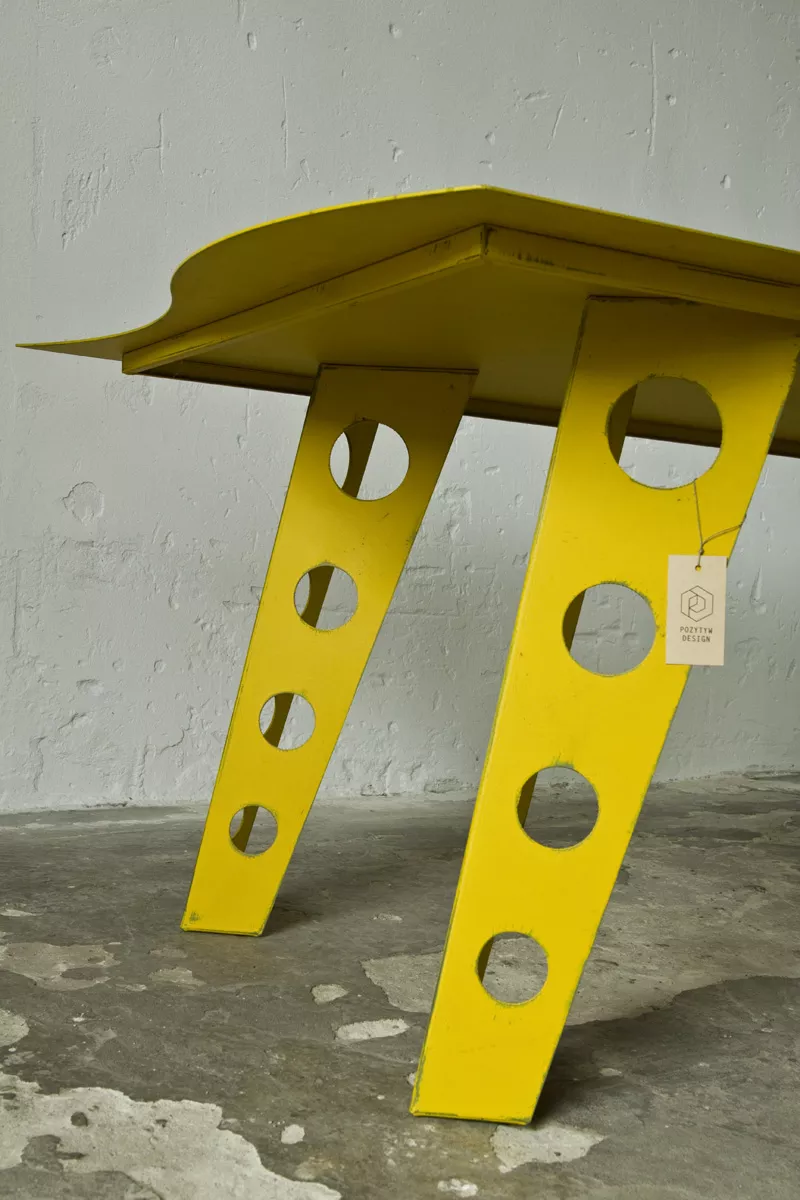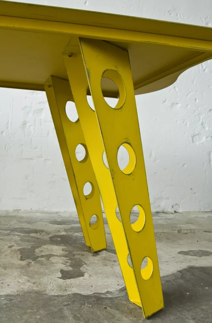 Designerski metalowy stół w odważnym żółtym kolorze, całość wykonana jest z masywnej stali i pokryta przemysłową farbą, blat ma surowe wykończenie z wyfrezowanymi wzorami i jest zabezpieczony matowym lakierem. Jest to mebel prototypowy i powstał tylko w jednym egzemplarzu.