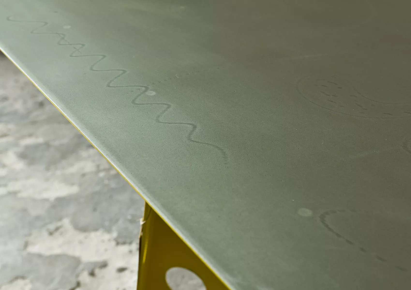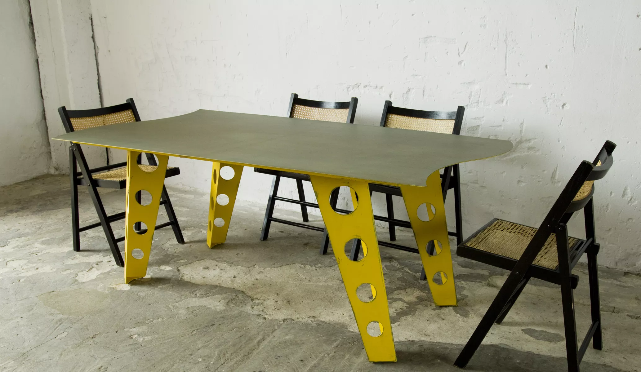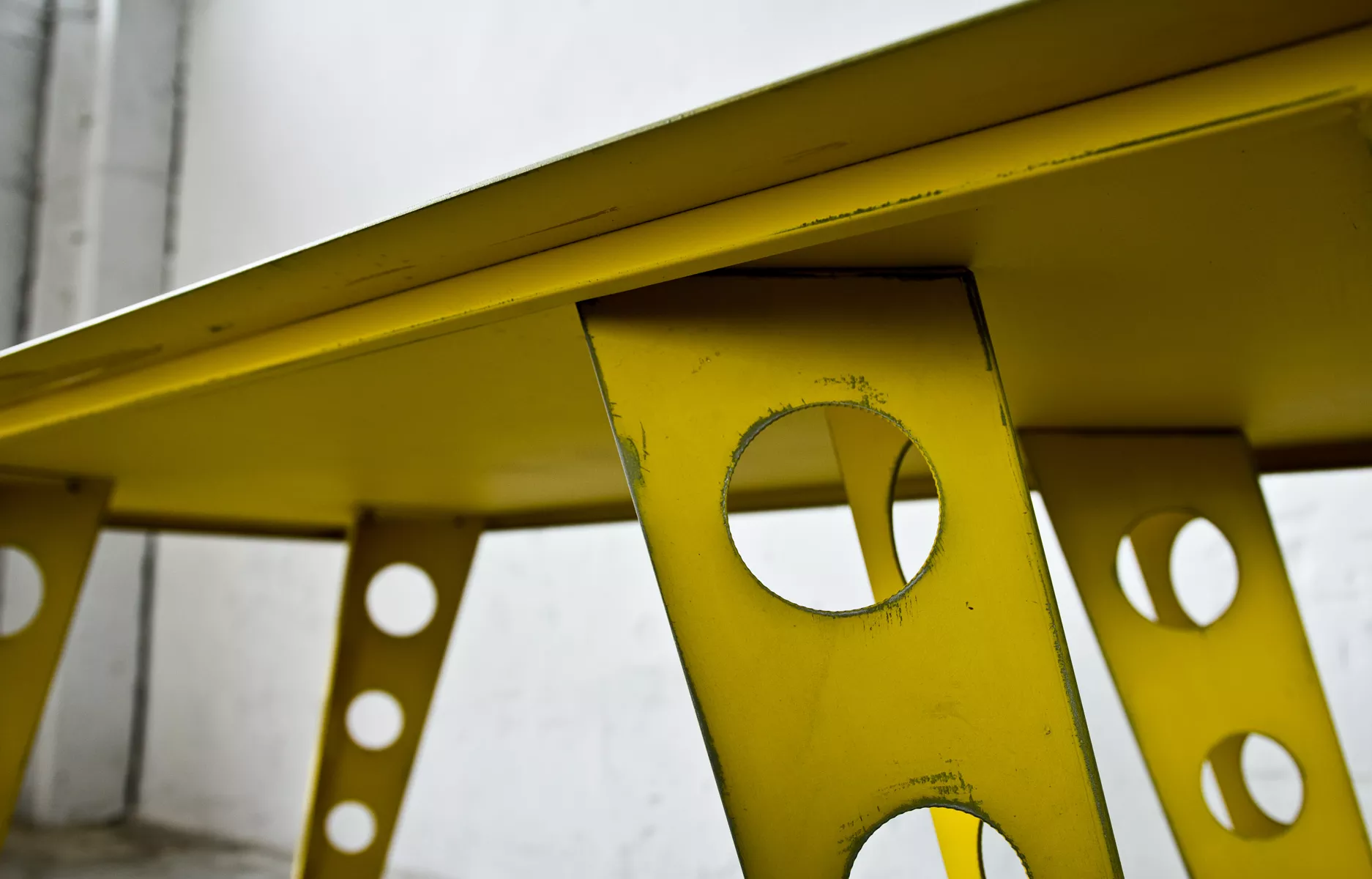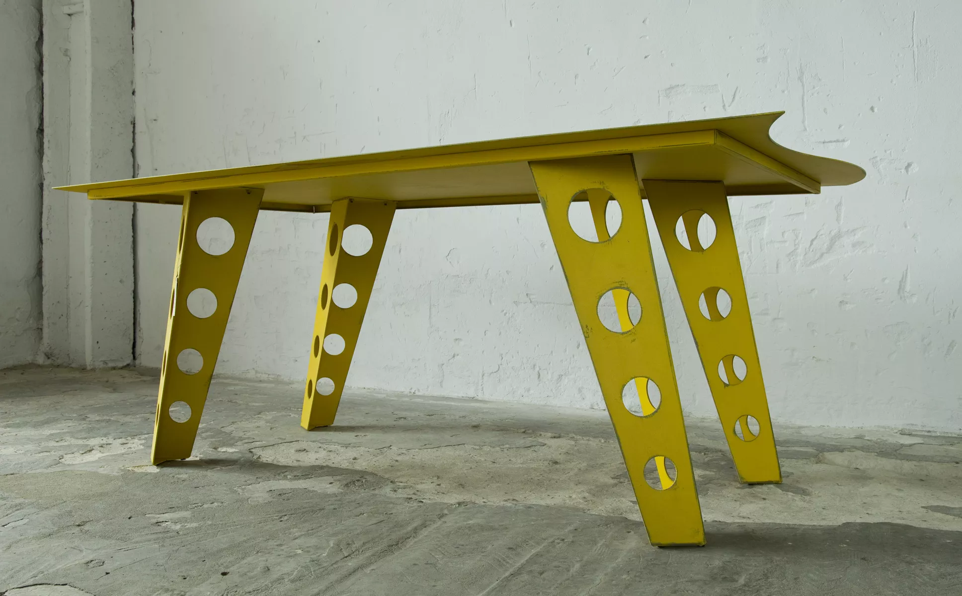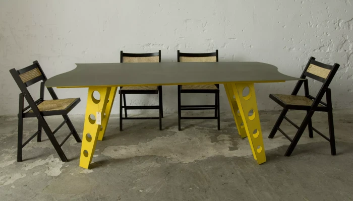 Designerski metalowy stół w odważnym żółtym kolorze, całość wykonana jest z masywnej stali i pokryta przemysłową farbą, blat ma surowe wykończenie z wyfrezowanymi wzorami i jest zabezpieczony matowym lakierem. Jest to mebel prototypowy i powstał tylko w jednym egzemplarzu.