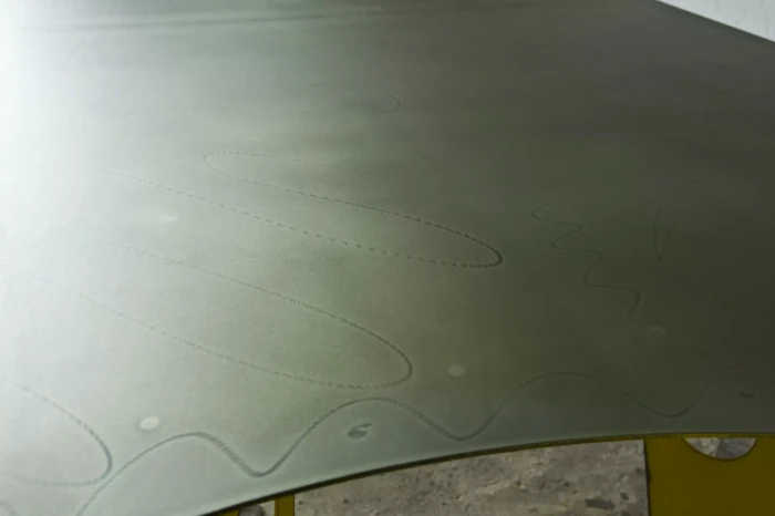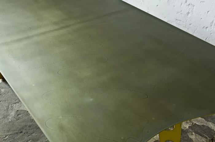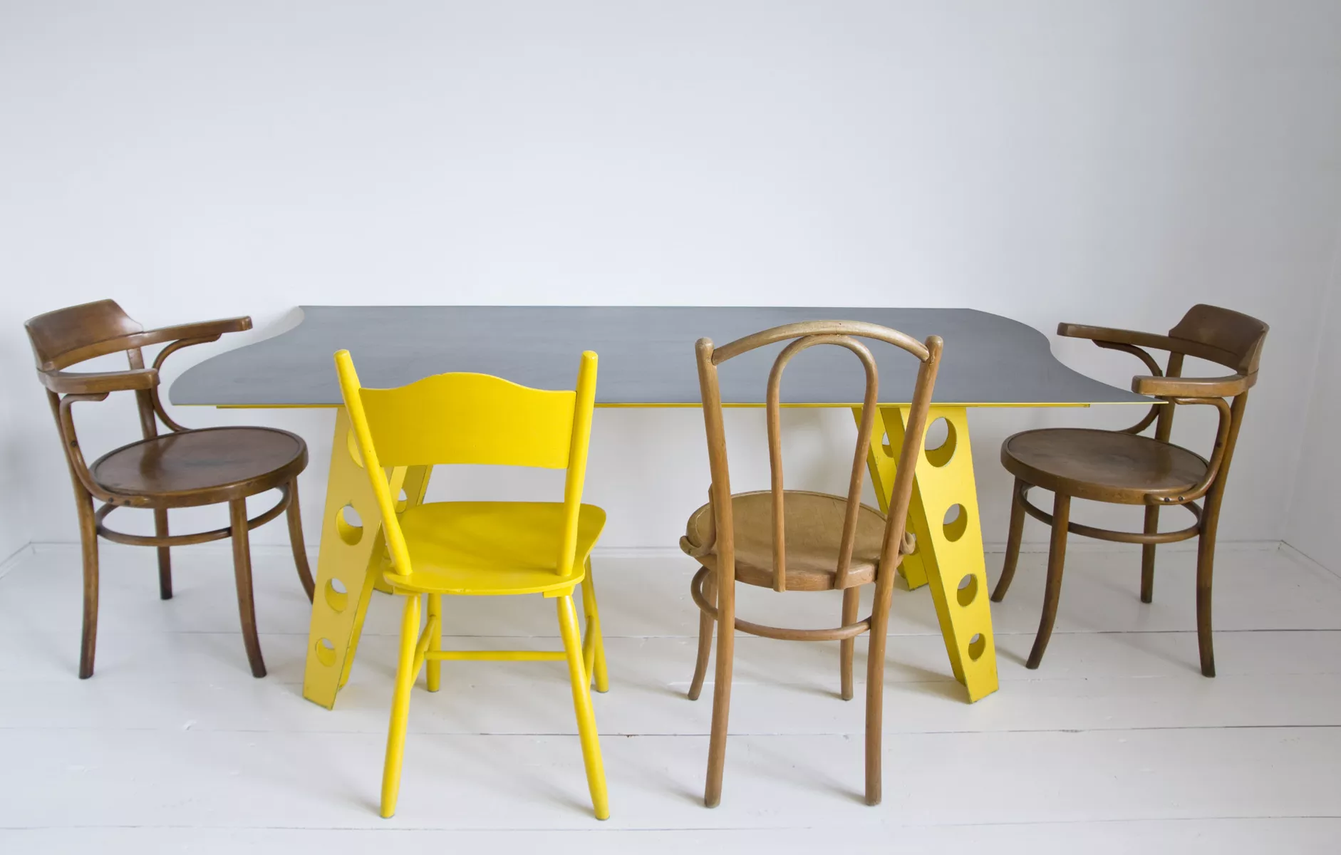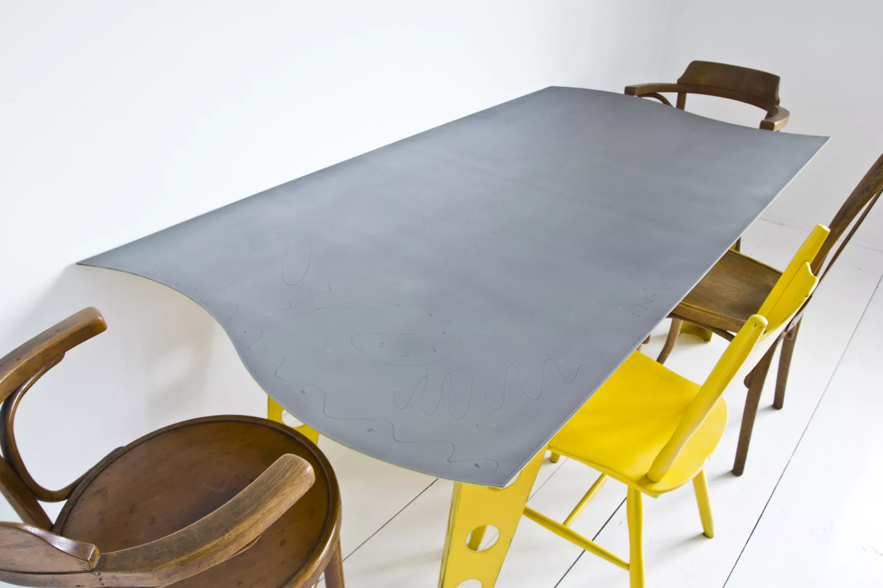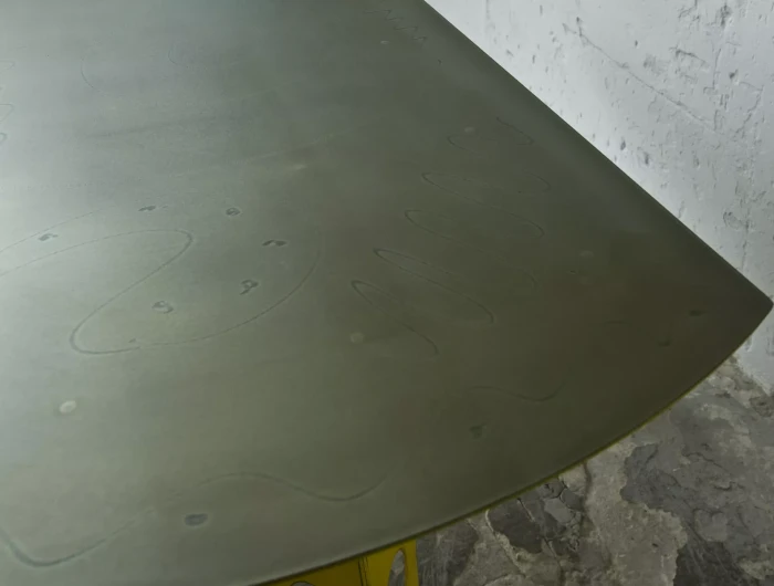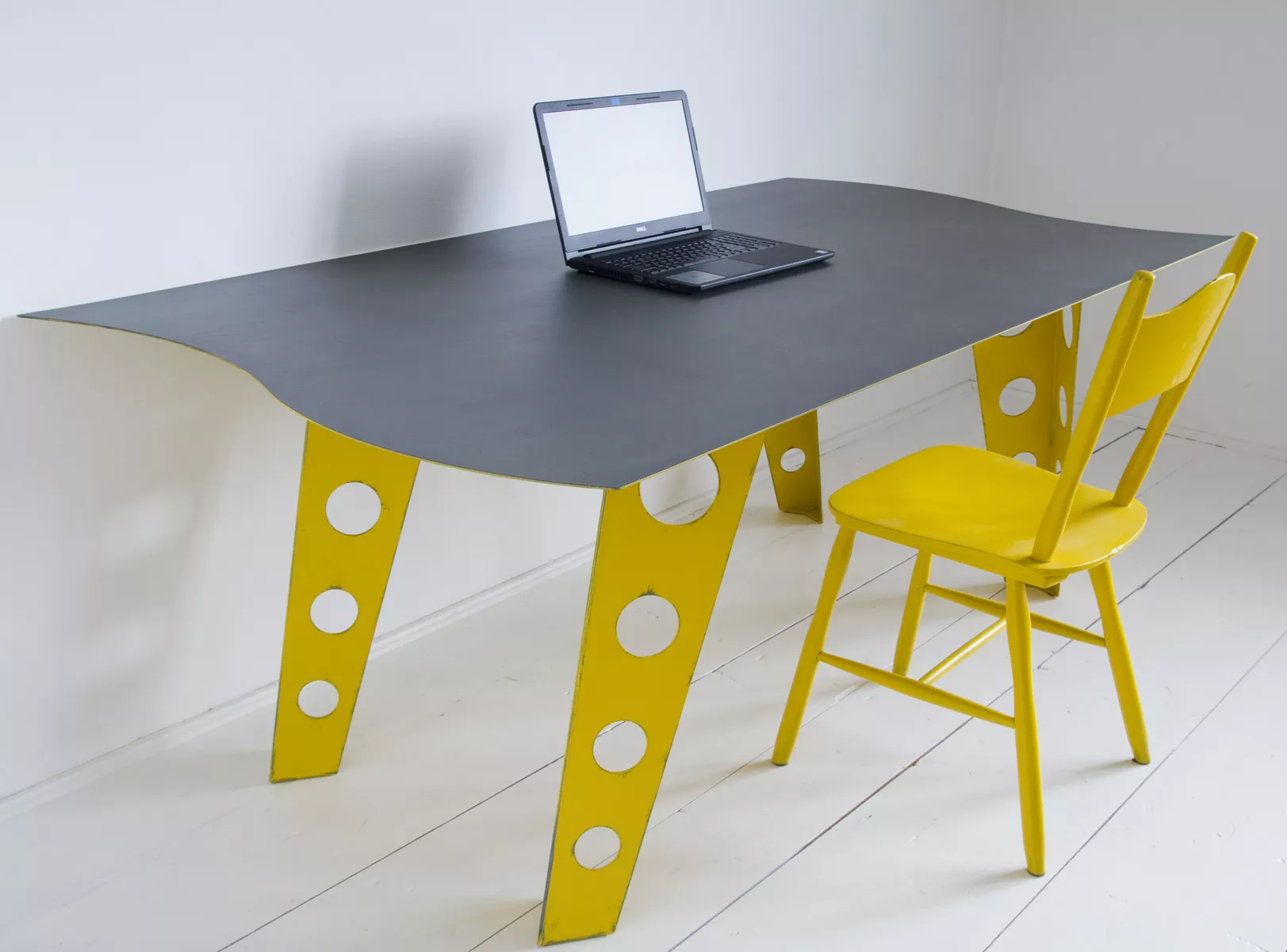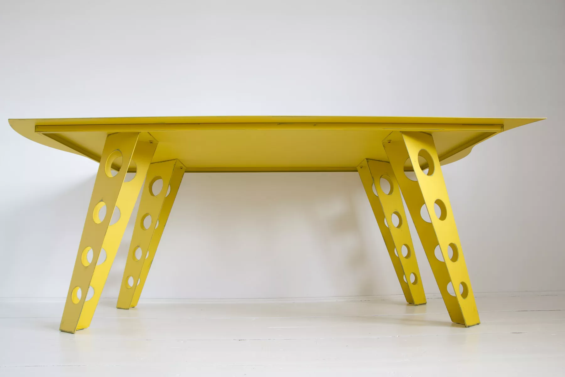 Designerski metalowy stół w odważnym żółtym kolorze, całość wykonana jest z masywnej stali i pokryta przemysłową farbą, blat ma surowe wykończenie z wyfrezowanymi wzorami i jest zabezpieczony matowym lakierem. Jest to mebel prototypowy i powstał tylko w jednym egzemplarzu.